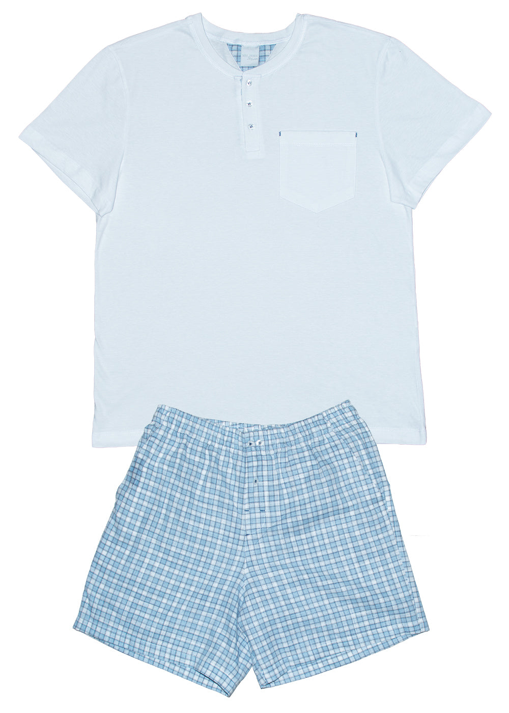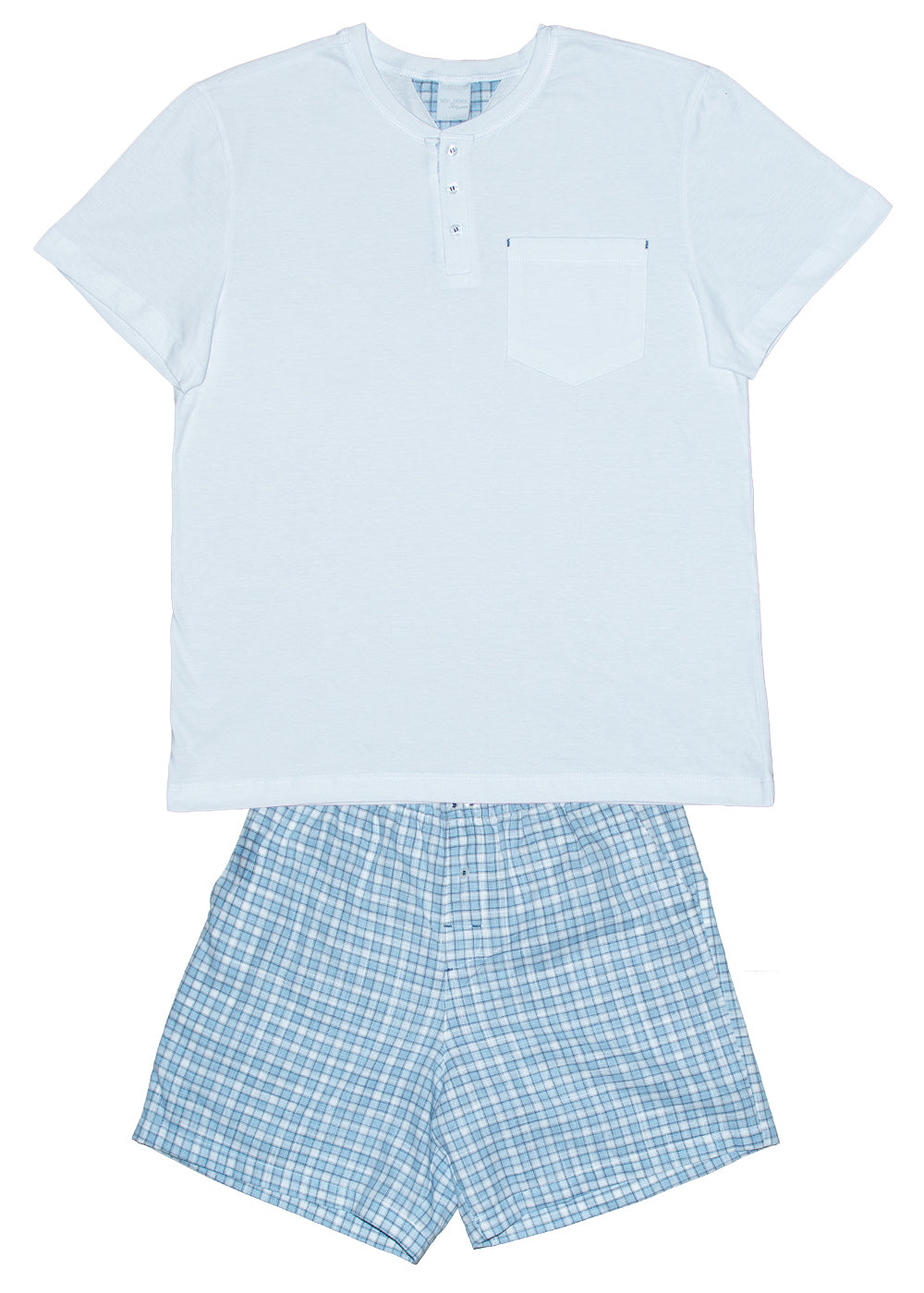 Pijama masculino adulto, modelo bermuda em tecido 100% algodão com padronagem xadrez em tons de azul claro e cinza, elástico na cintura e bolsos laterais e blusa em malha 100% algodão, mangas curtas e decote polo com botões e detalhe xadrez.