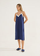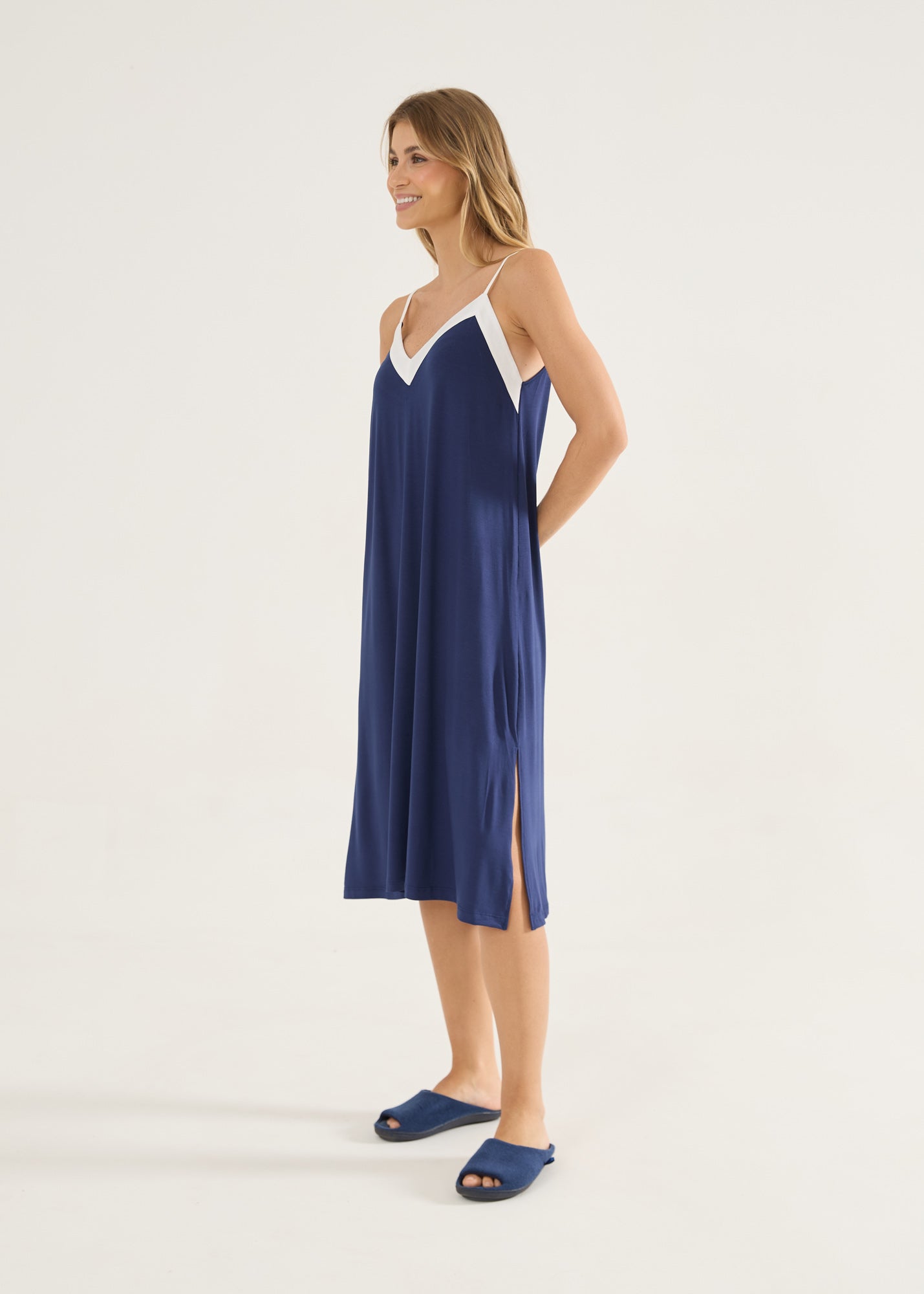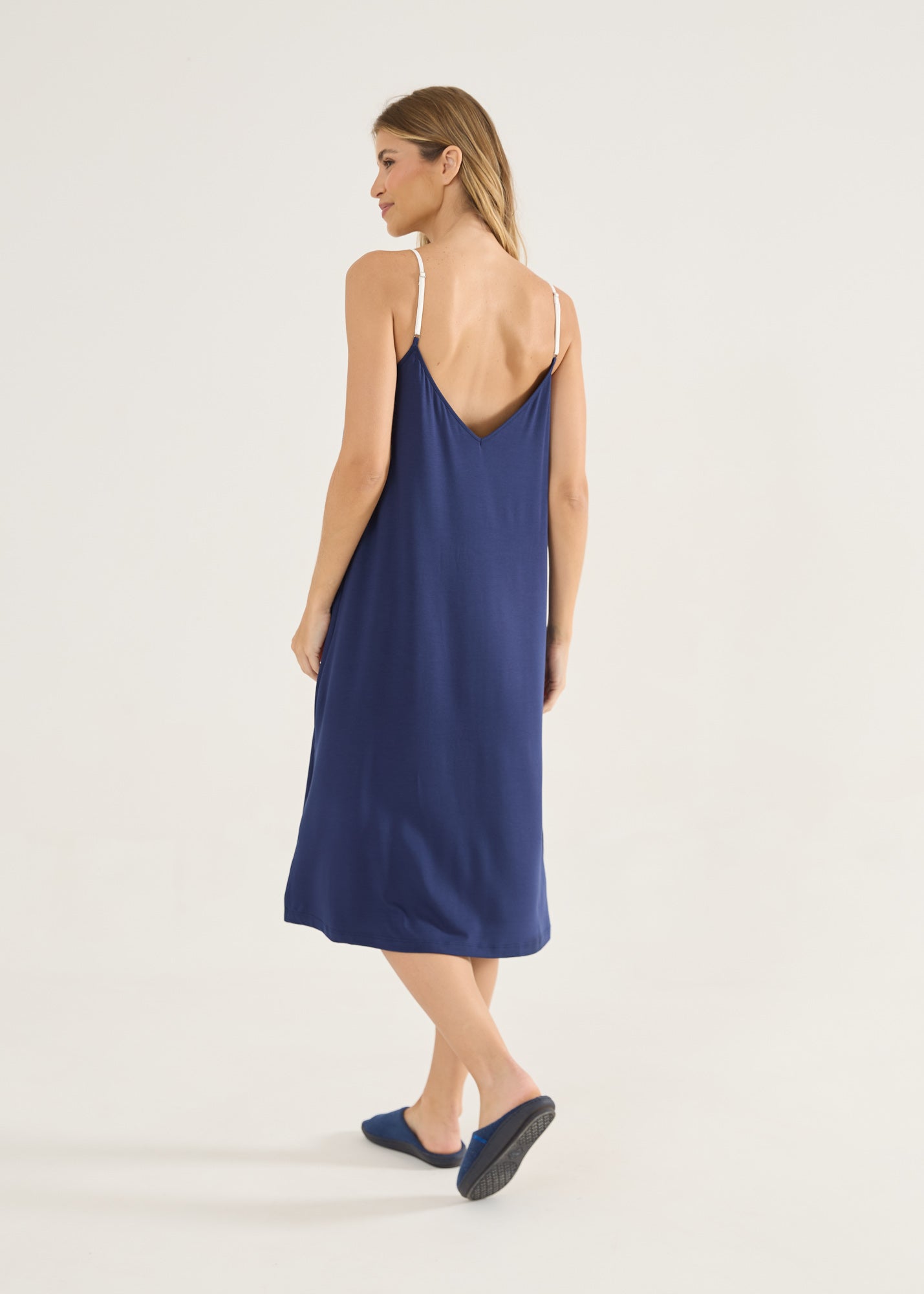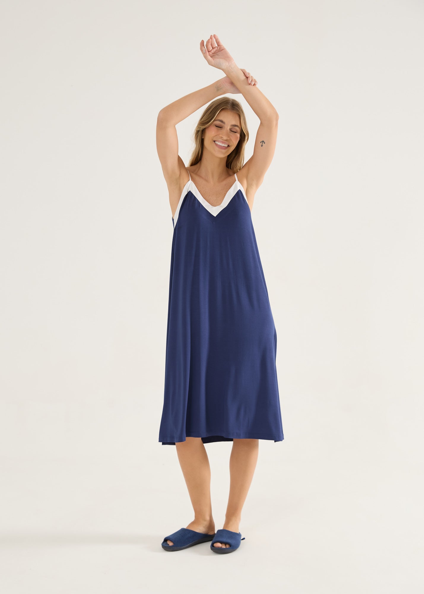 Camisola feminina, modelo alças com detalhe em cetim decote. O comprimento midi alonga a silhueta. Fendas laterais na barra. Uma camisola confortável pela sua modelagem soltinha e elegante pelo comprimento que alonga a silhueta e pela sua combinação de cores clássicas e atemporais. O detalhe em cetim traz a sofisticação para essa linda camisola!