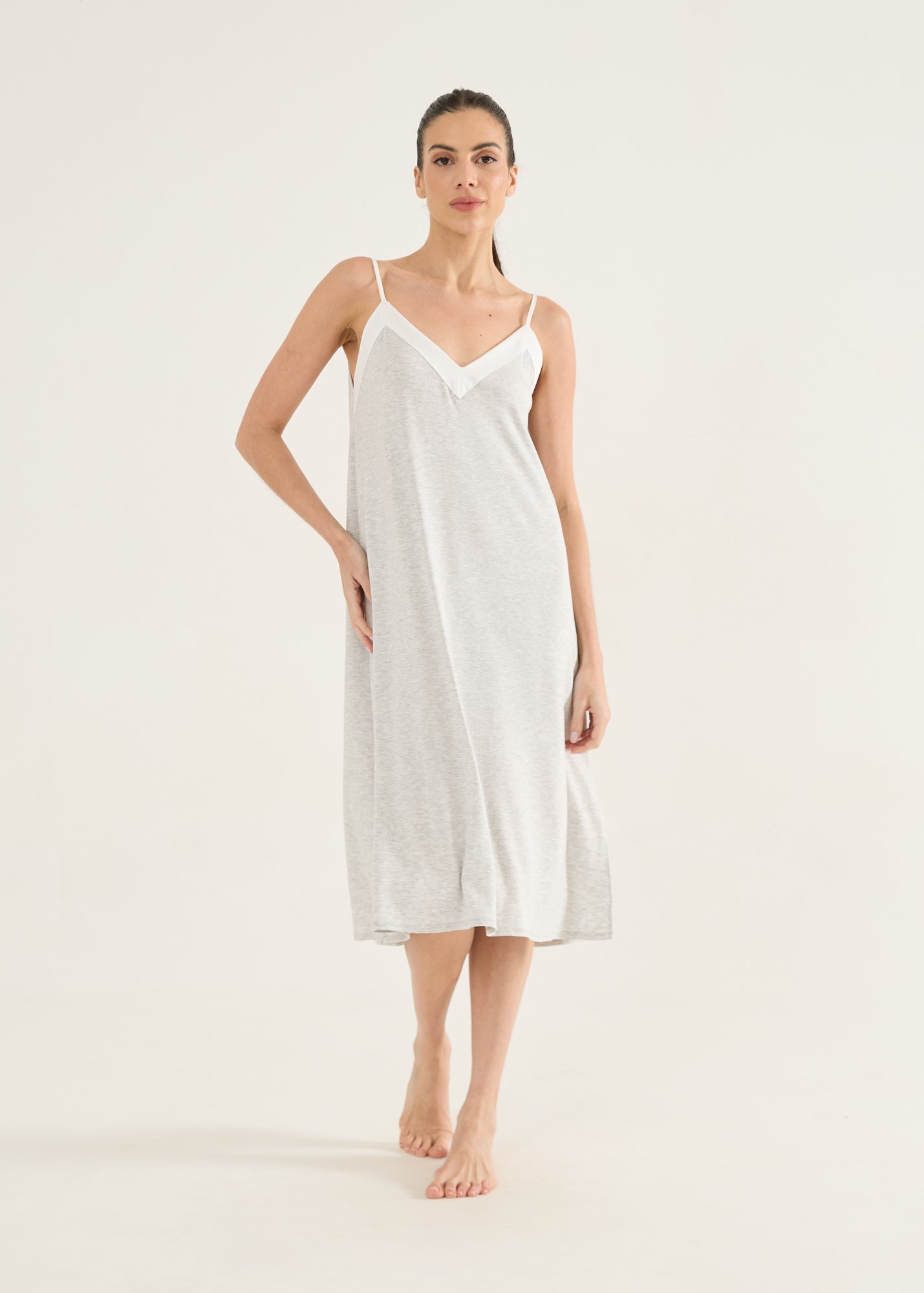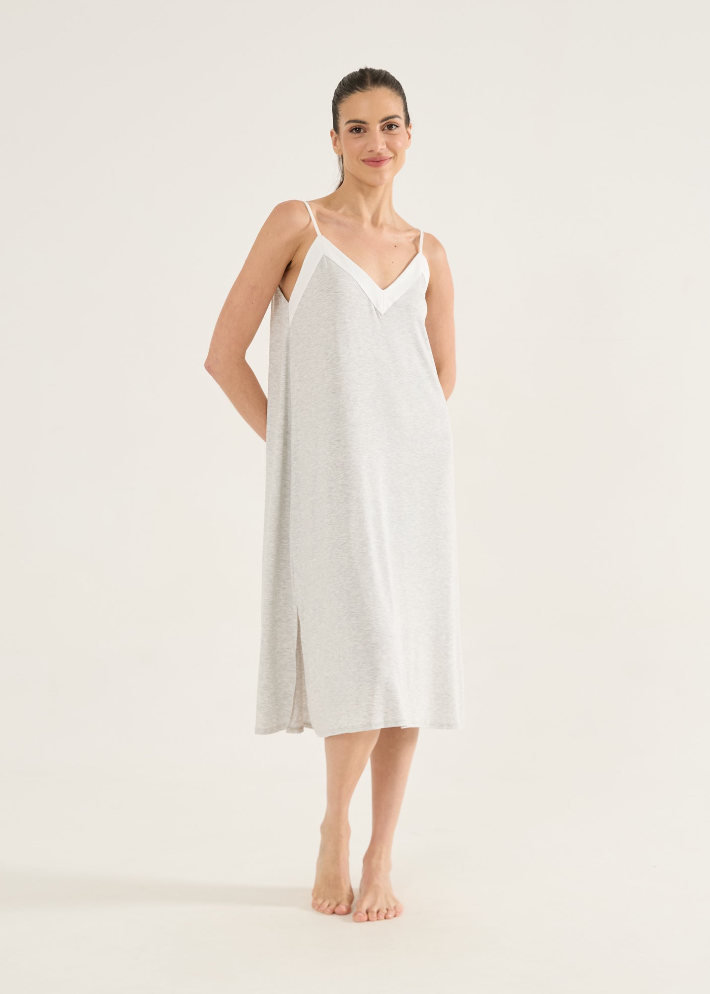 Camisola feminina, modelo alças com detalhe em cetim decote. O comprimento midi alonga a silhueta. Fendas laterais na barra. Uma camisola confortável pela sua modelagem soltinha e elegante pelo comprimento que alonga a silhueta e pela sua combinação de cores clássicas e atemporais. O detalhe em cetim traz a sofisticação para essa linda camisola!