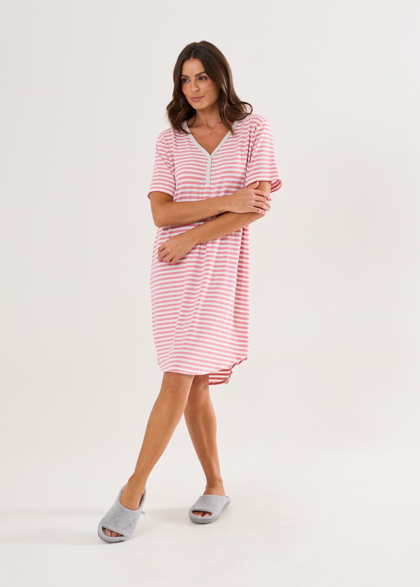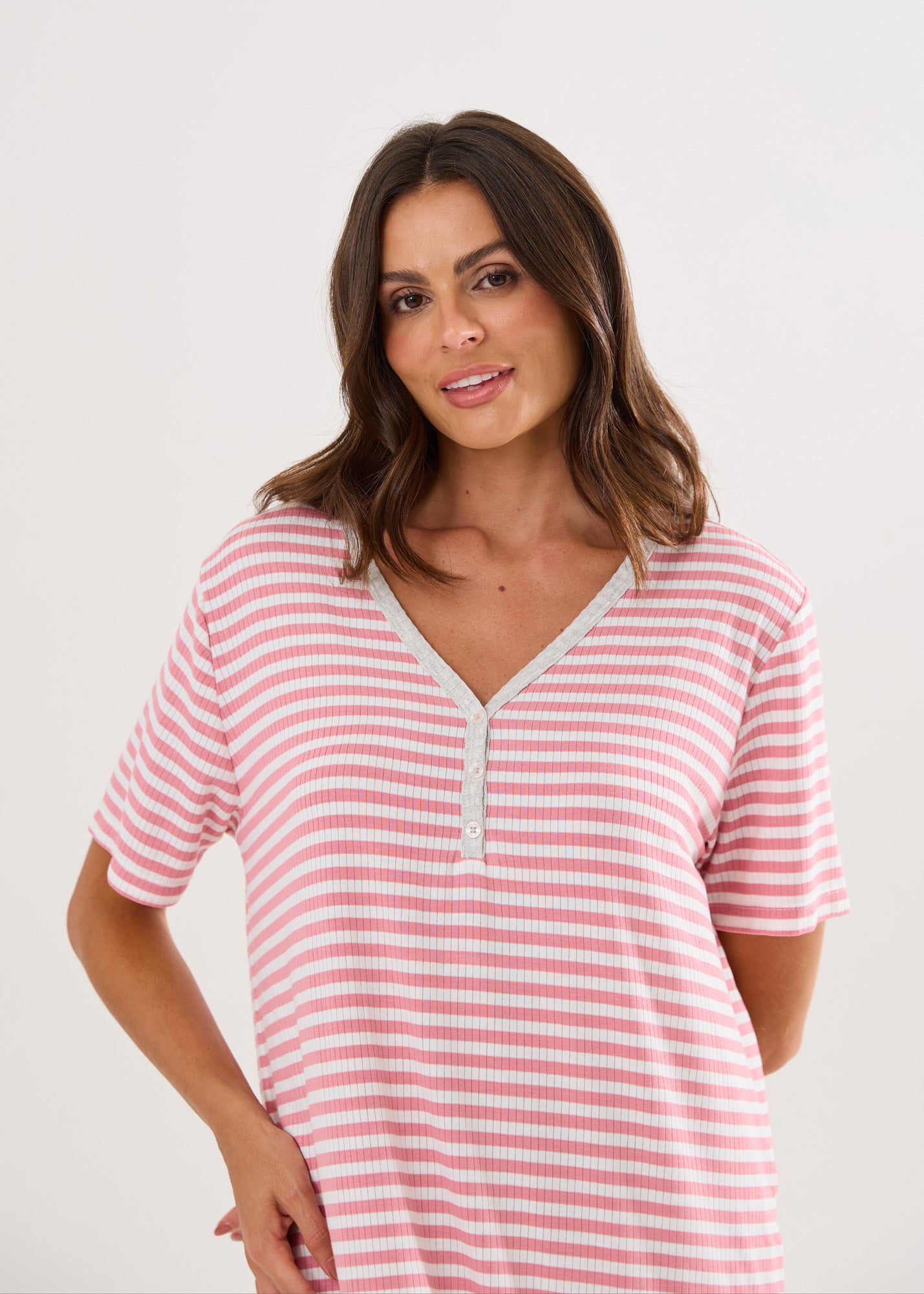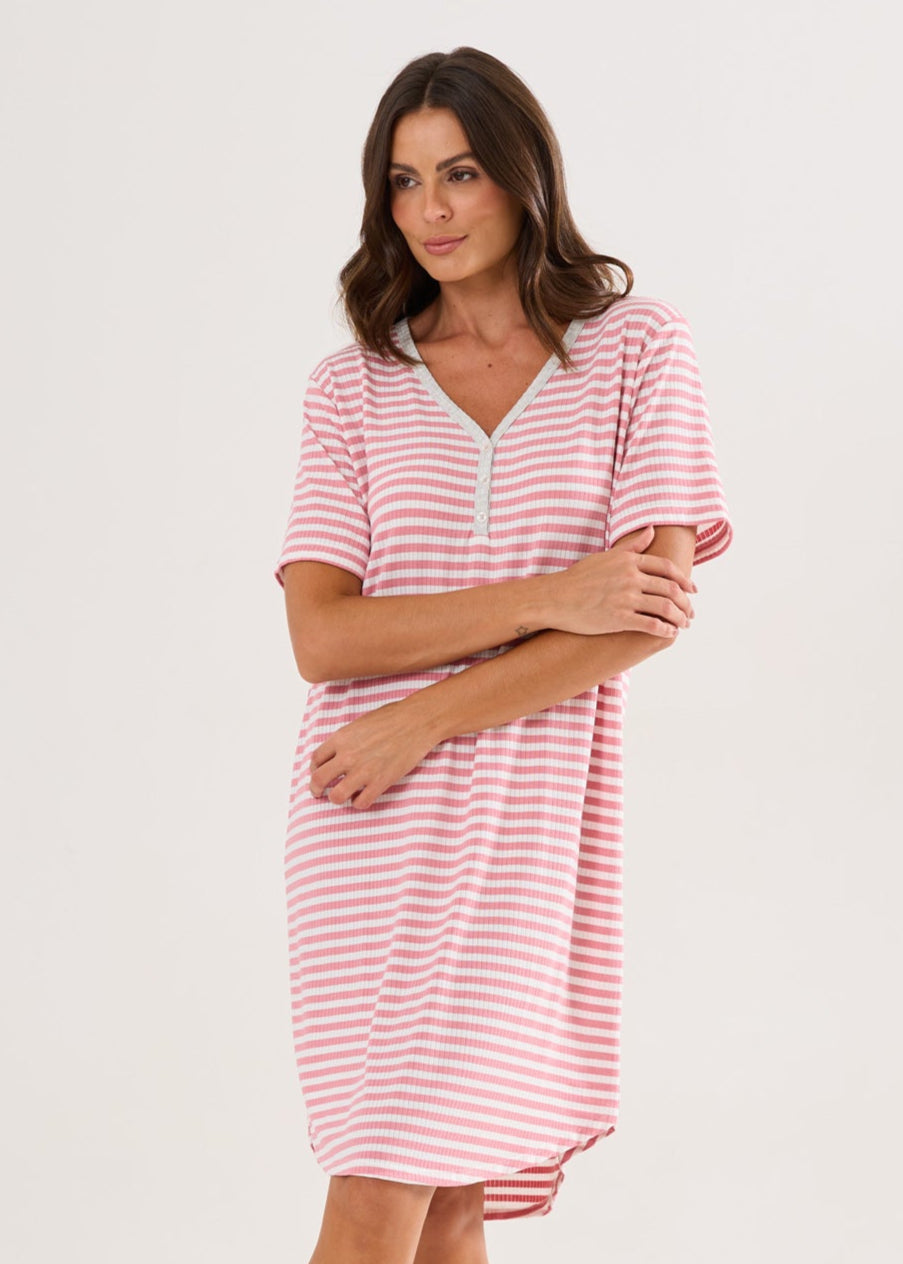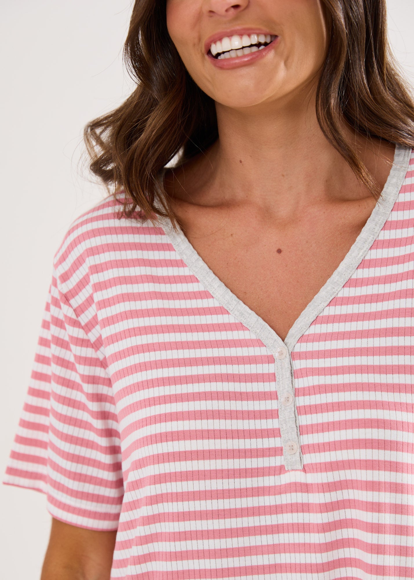 Camisola mangas curtas com botões no decote e barra arredondada. Listrada de rosa e branco com detalhes em canelado mescla na gola.