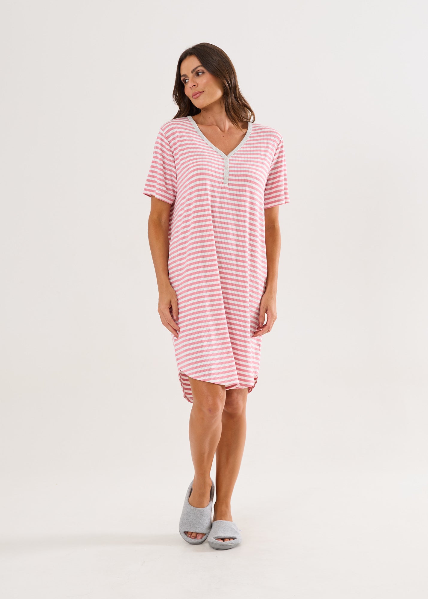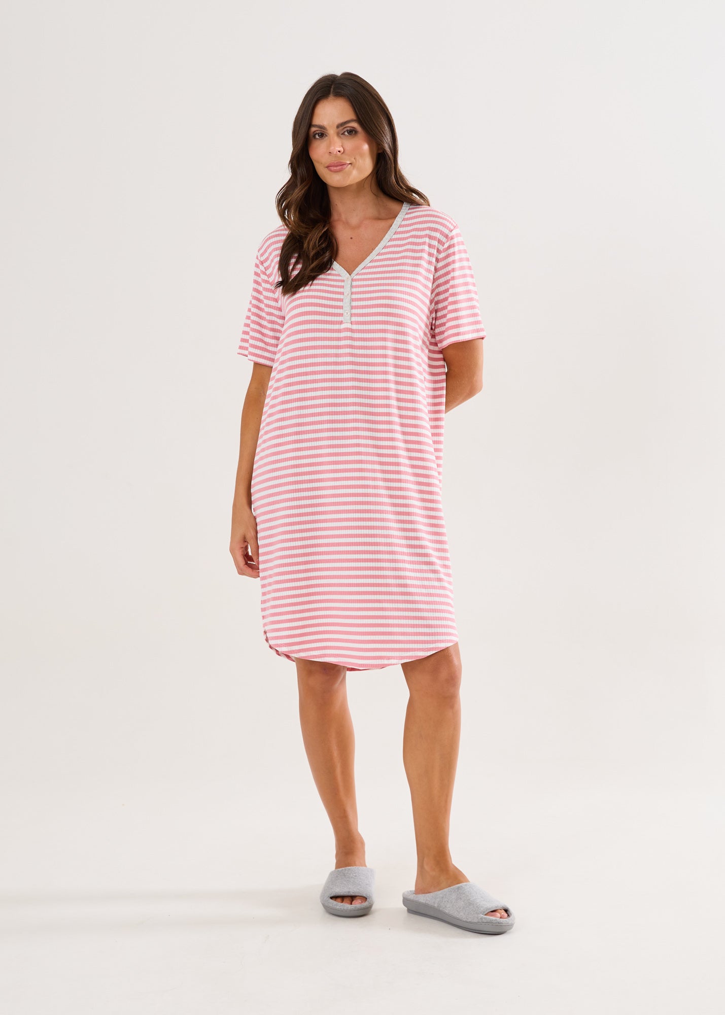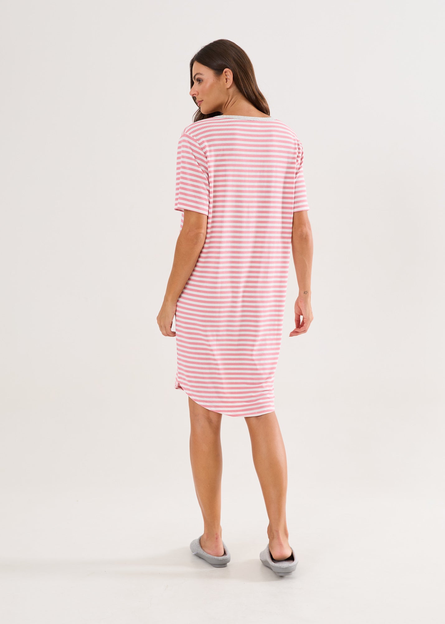 Camisola mangas curtas com botões no decote e barra arredondada. Listrada de rosa e branco com detalhes em canelado mescla na gola.