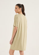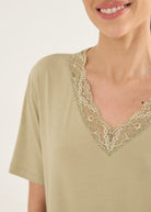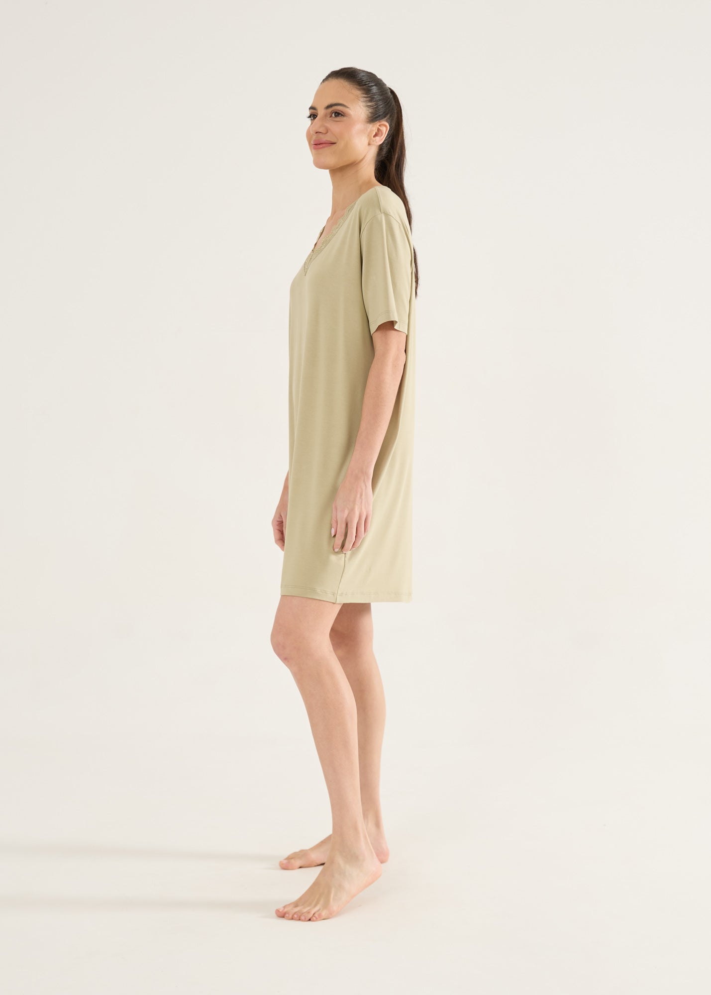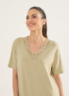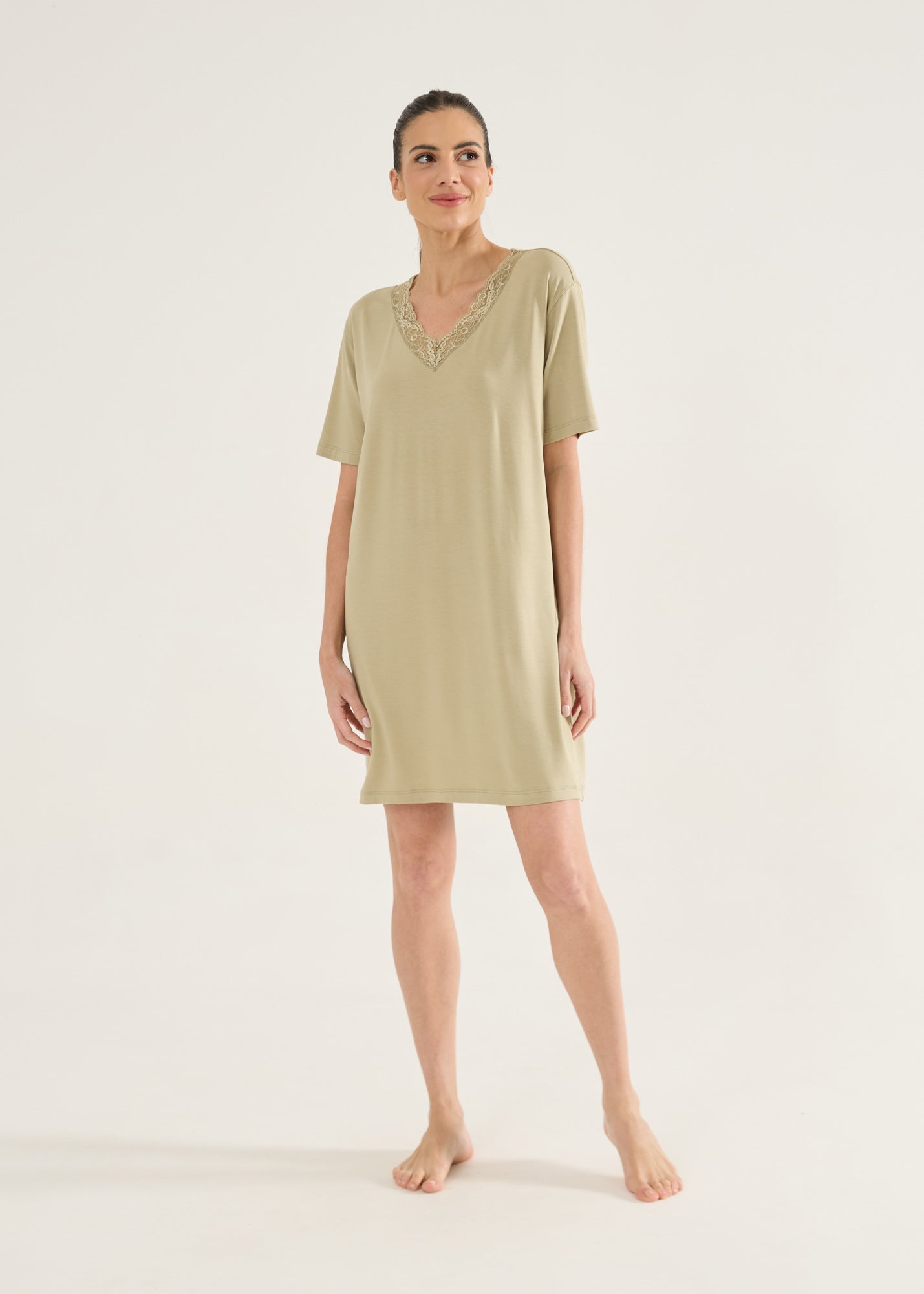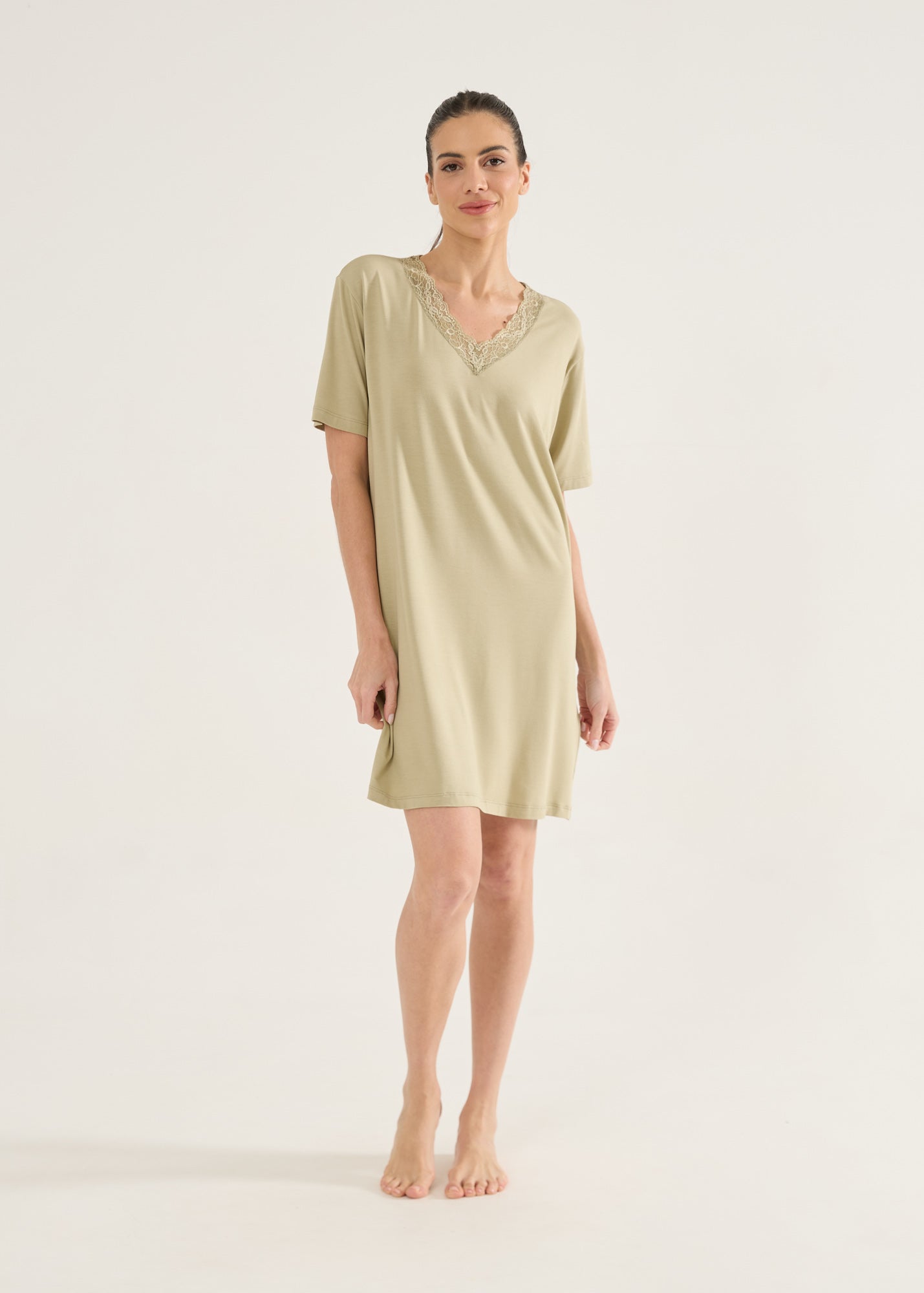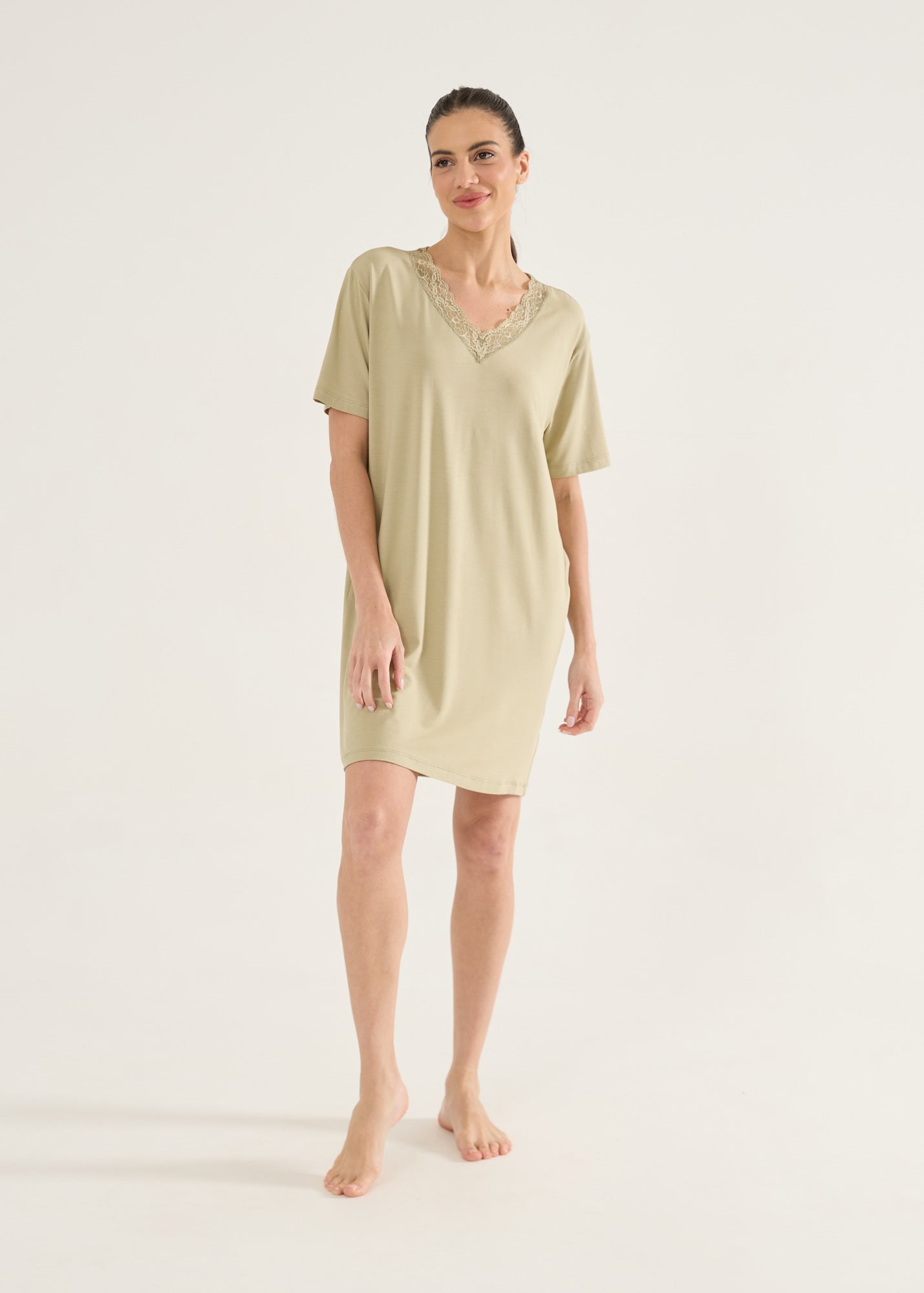 Camisola feminina, modelagem ampla e soltinha, com mangas, decote com detalhe em renda. Comprimento no joelho.