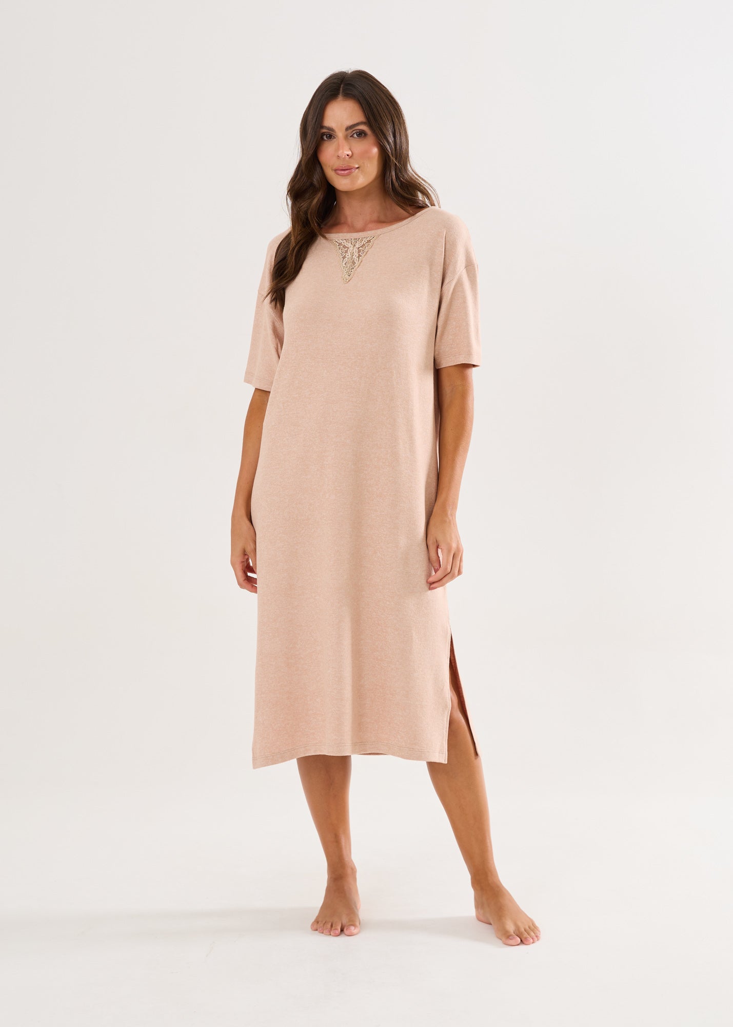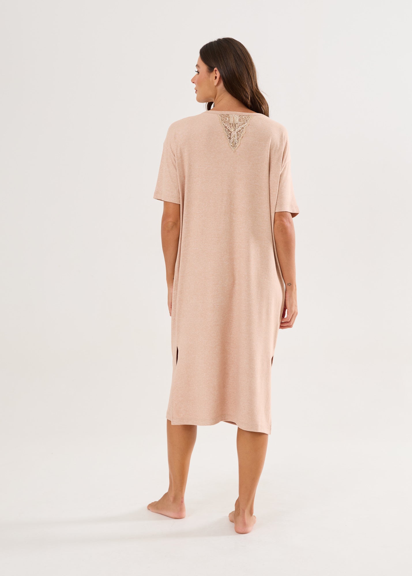 Camisola mangas curtas, comprimento midi que é extremamente elegante e alonga a silhueta, aberturas laterais na barra e o detalhe da renda no decote da frente e nas costas dão o toque delicado à peça.
