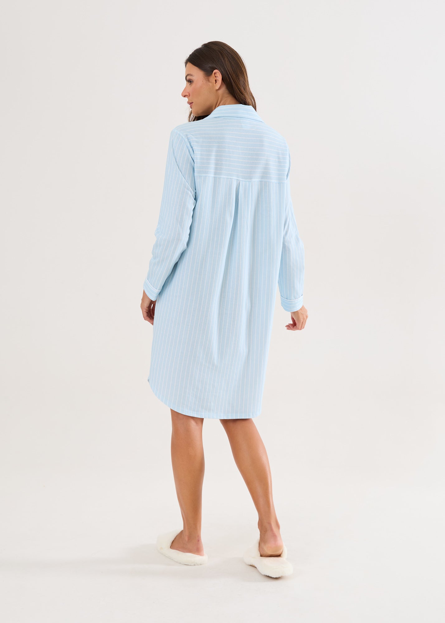 Camisola mangas longas, com botões e gola. Modelagem ampla, comprimento no joelho, barras arredondadas.