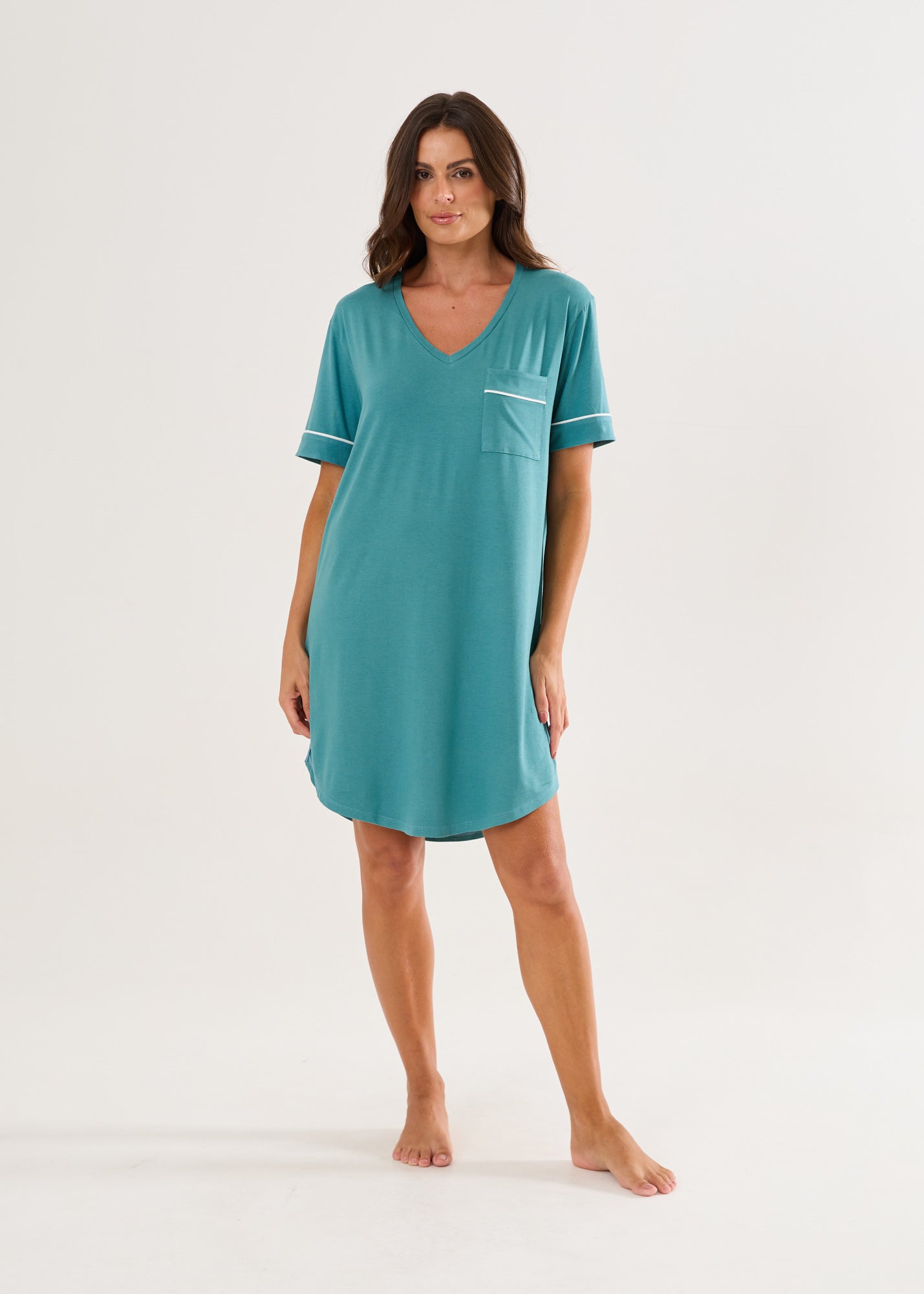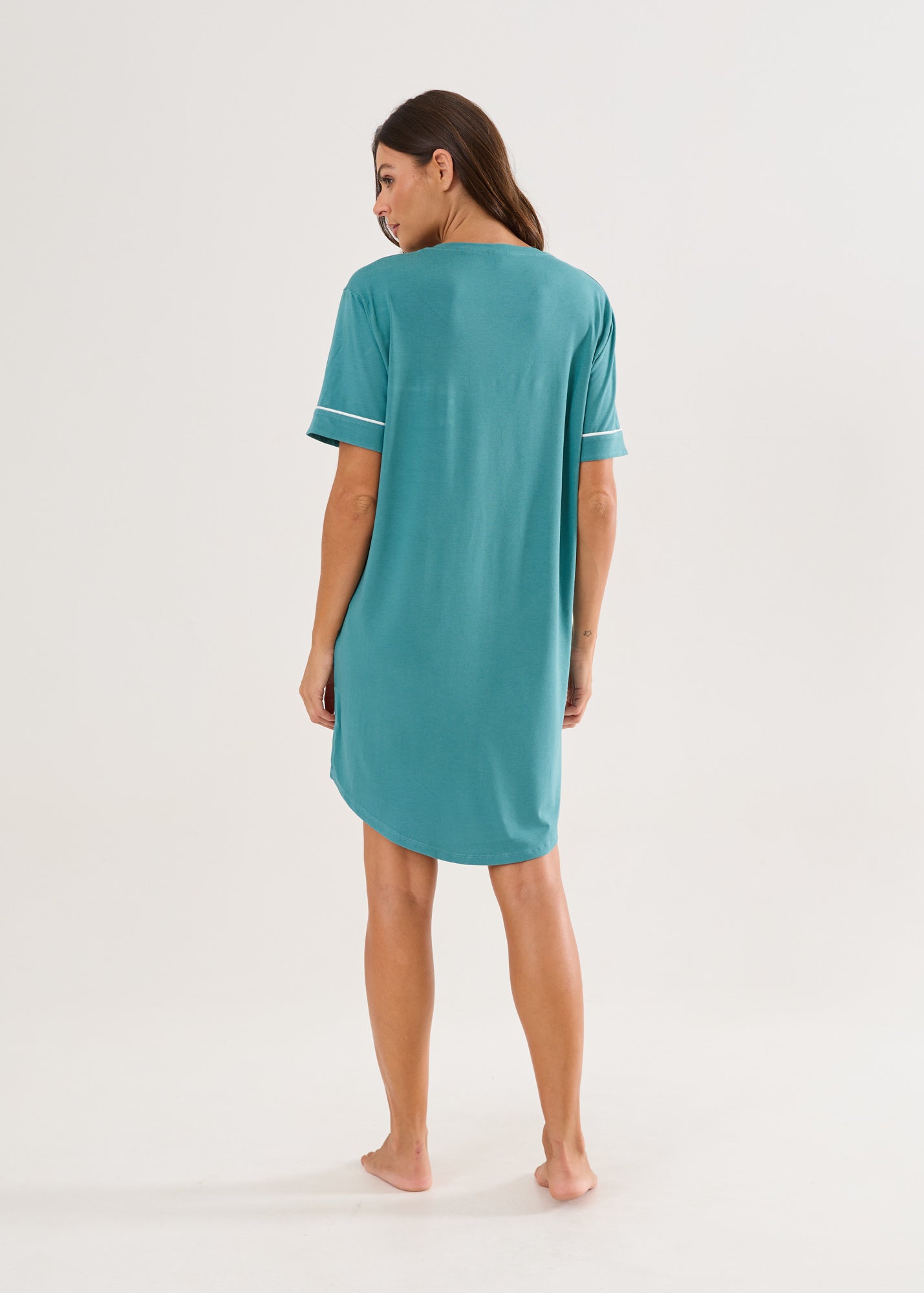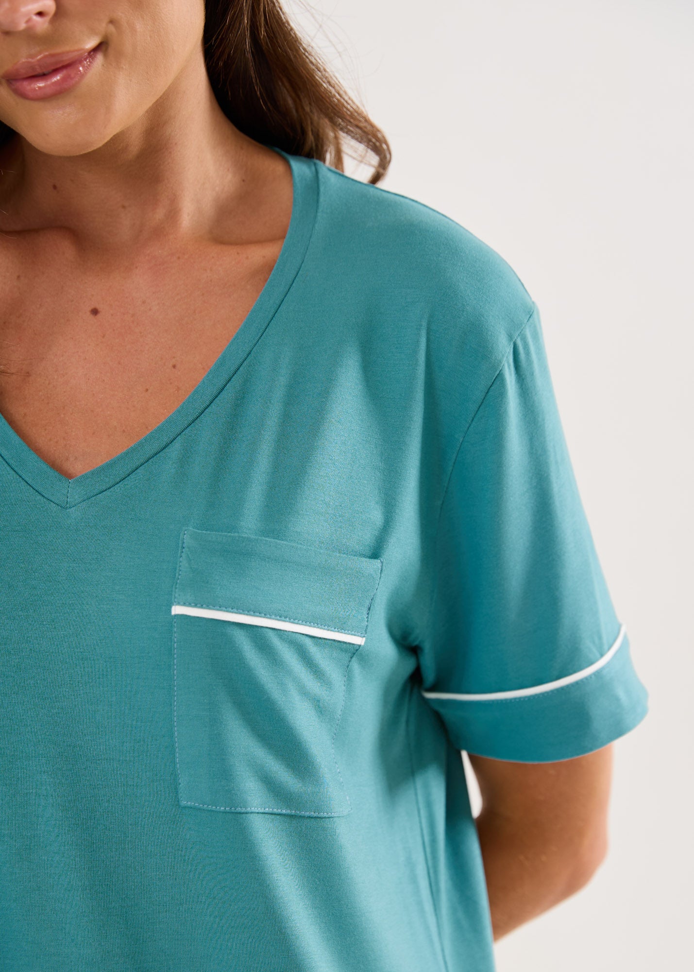 Camisola com mangas curtas, modelagem soltinha, decote V, barra arredondada. Detalhe vivos branco nas mangas e bolso. Num tom azul esverdeado, essa é a cor do ano de 2026! Malha visco super macia, com um toque incrível para que você tenha muito conforto para dormir ou curtir seus momentos em casa relaxando.