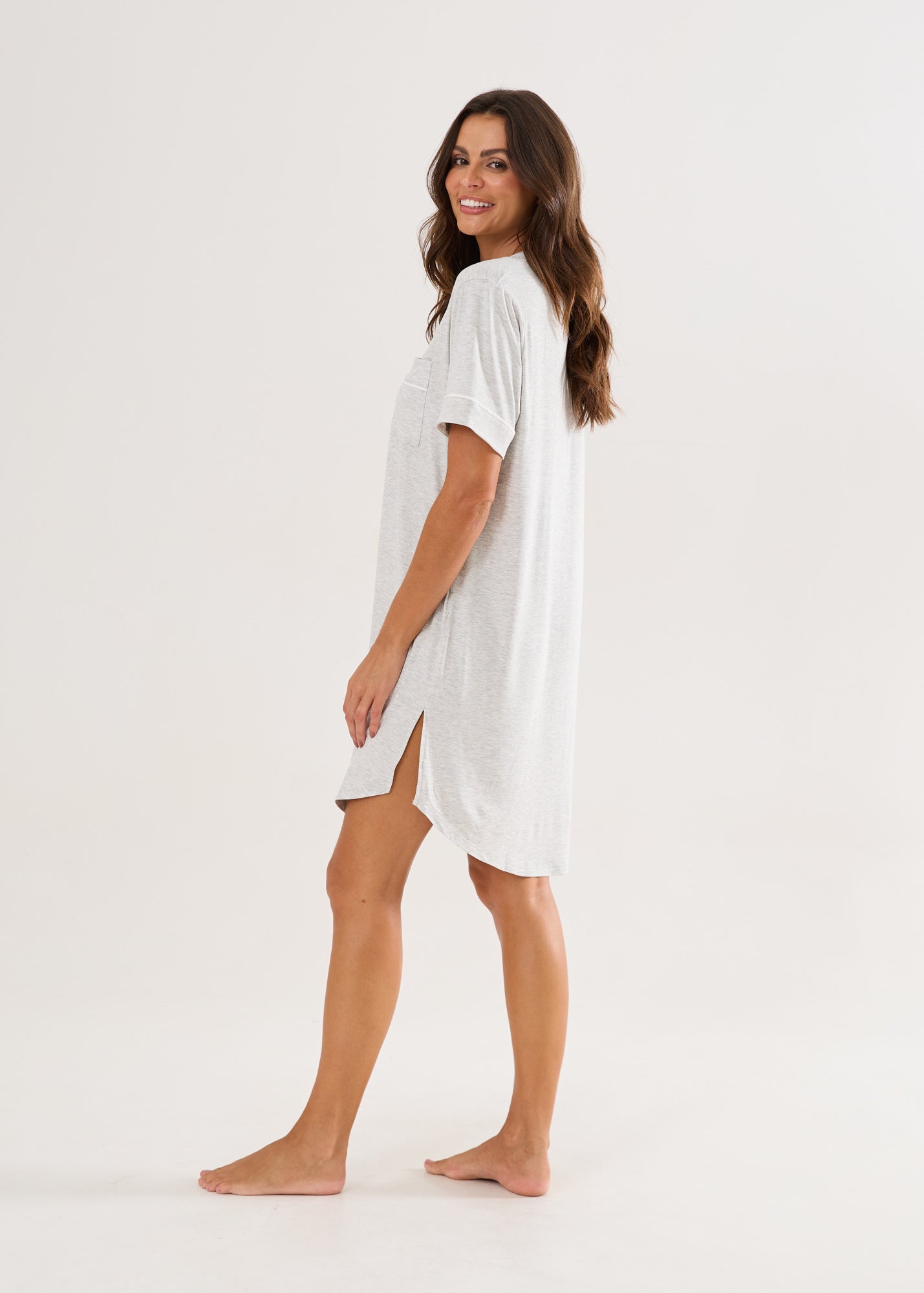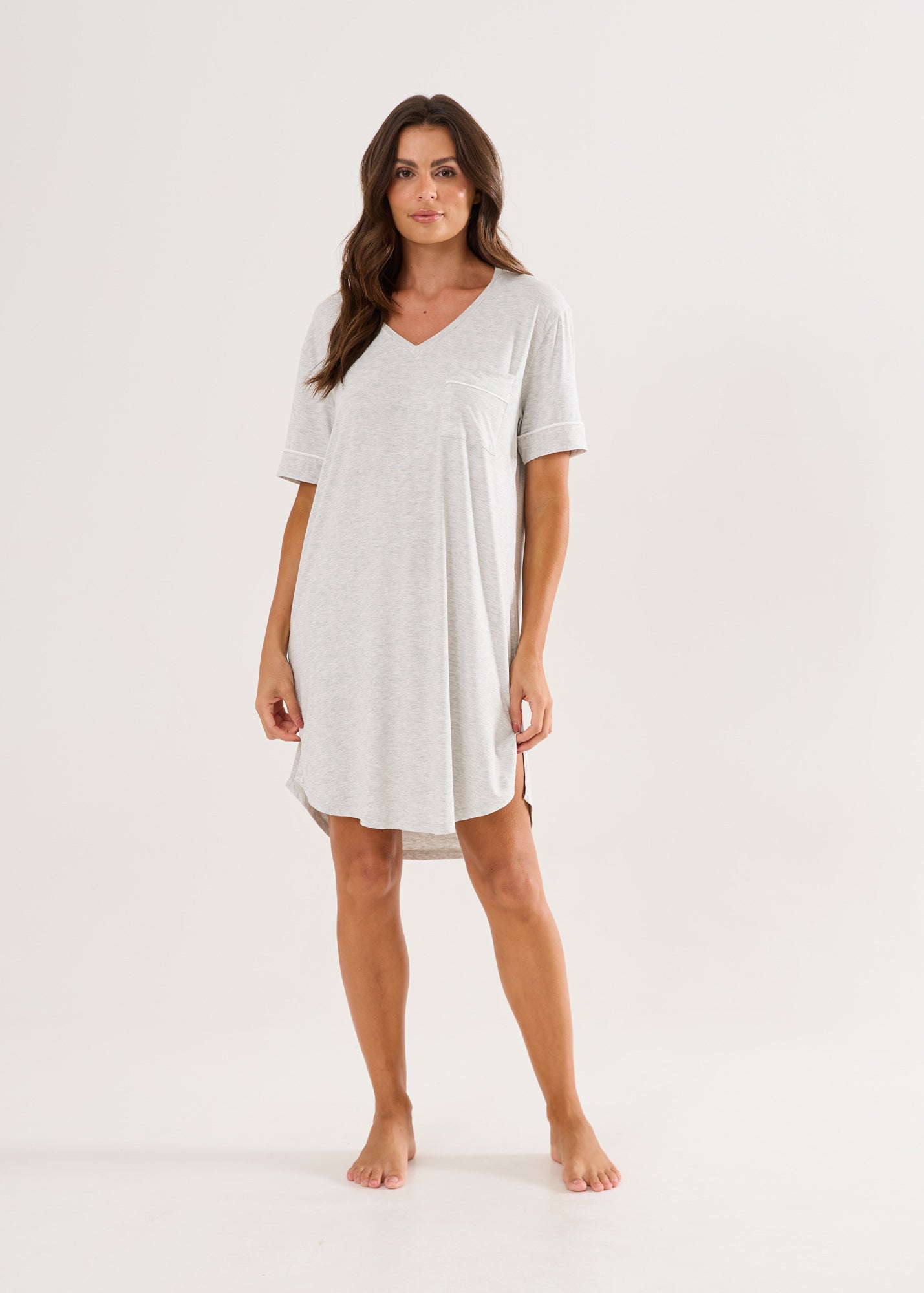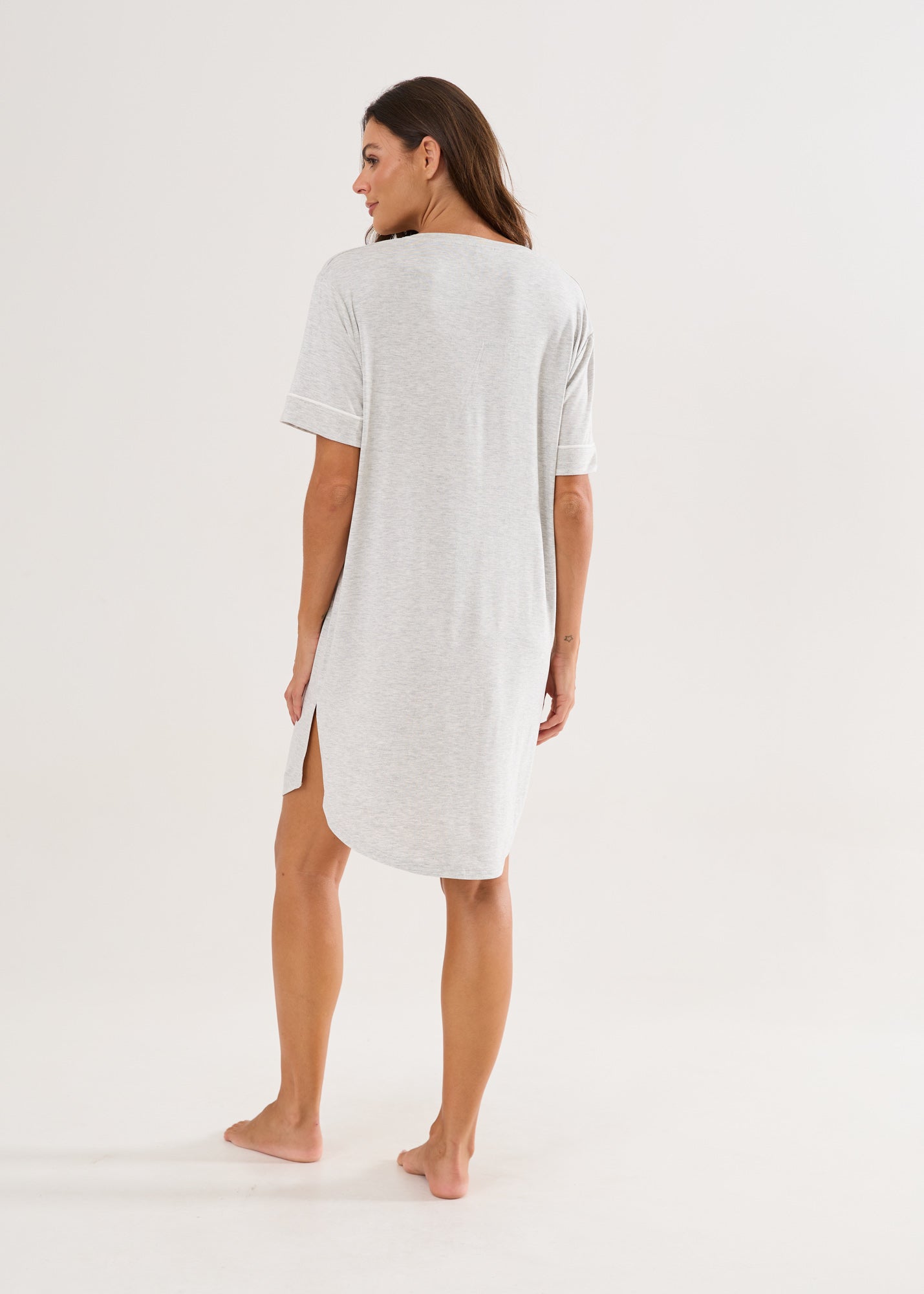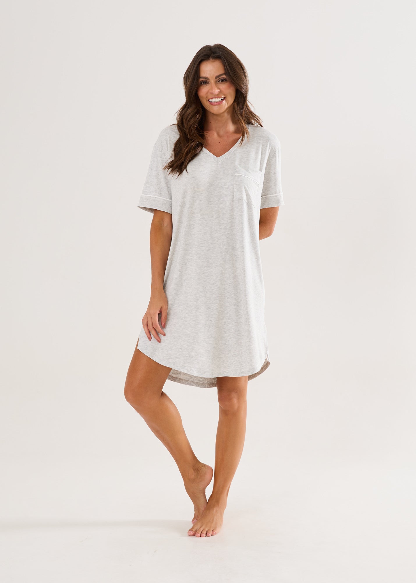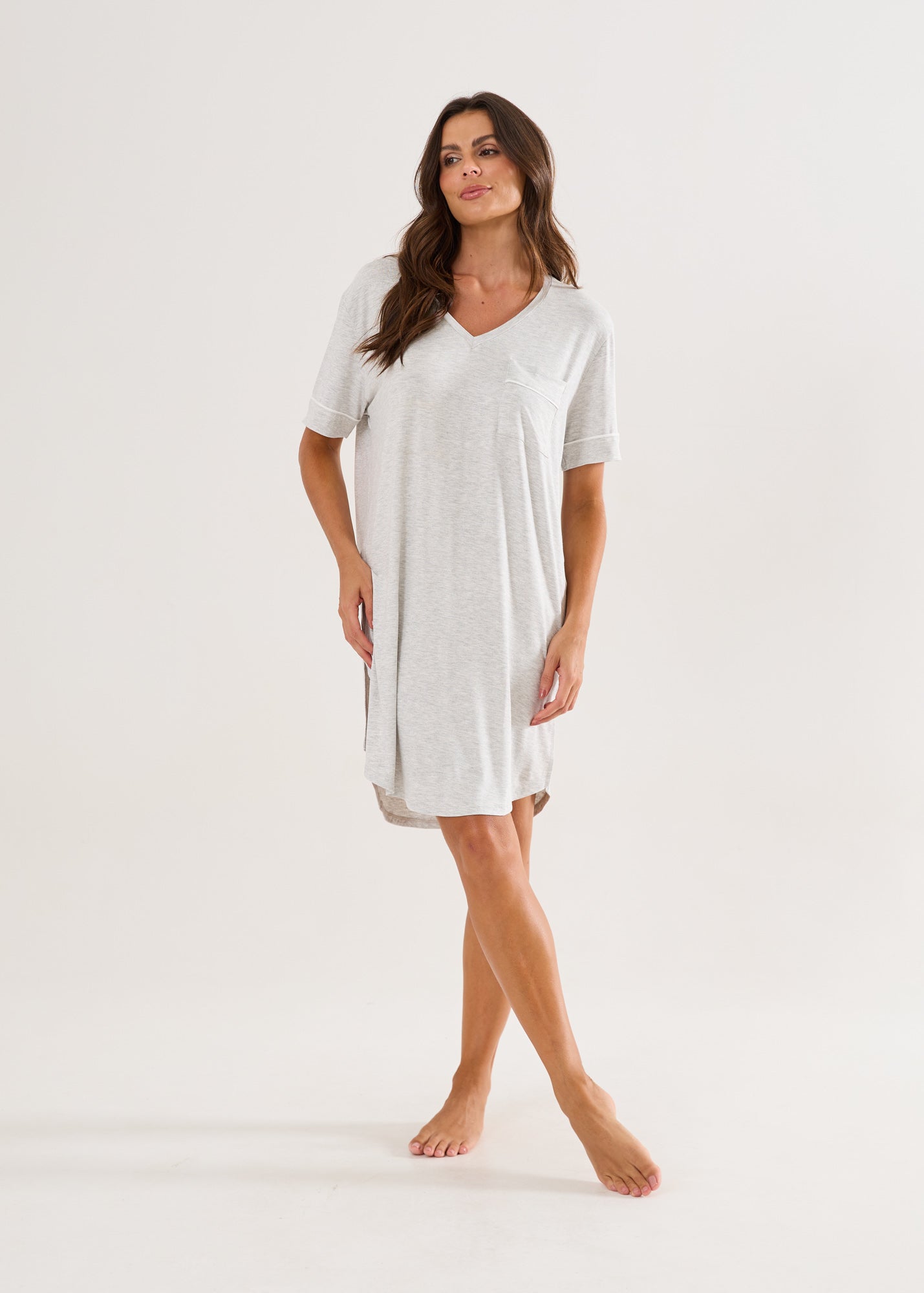 Camisola com mangas curtas, modelagem soltinha, decote V, barra arredondada. Detalhe vivos branco nas mangas e bolso. Malha visco super macia, com um toque incrível para que você tenha muito conforto para dormir ou curtir seus momentos em casa relaxando.