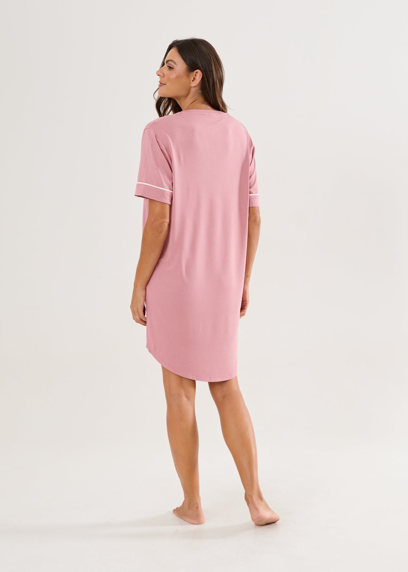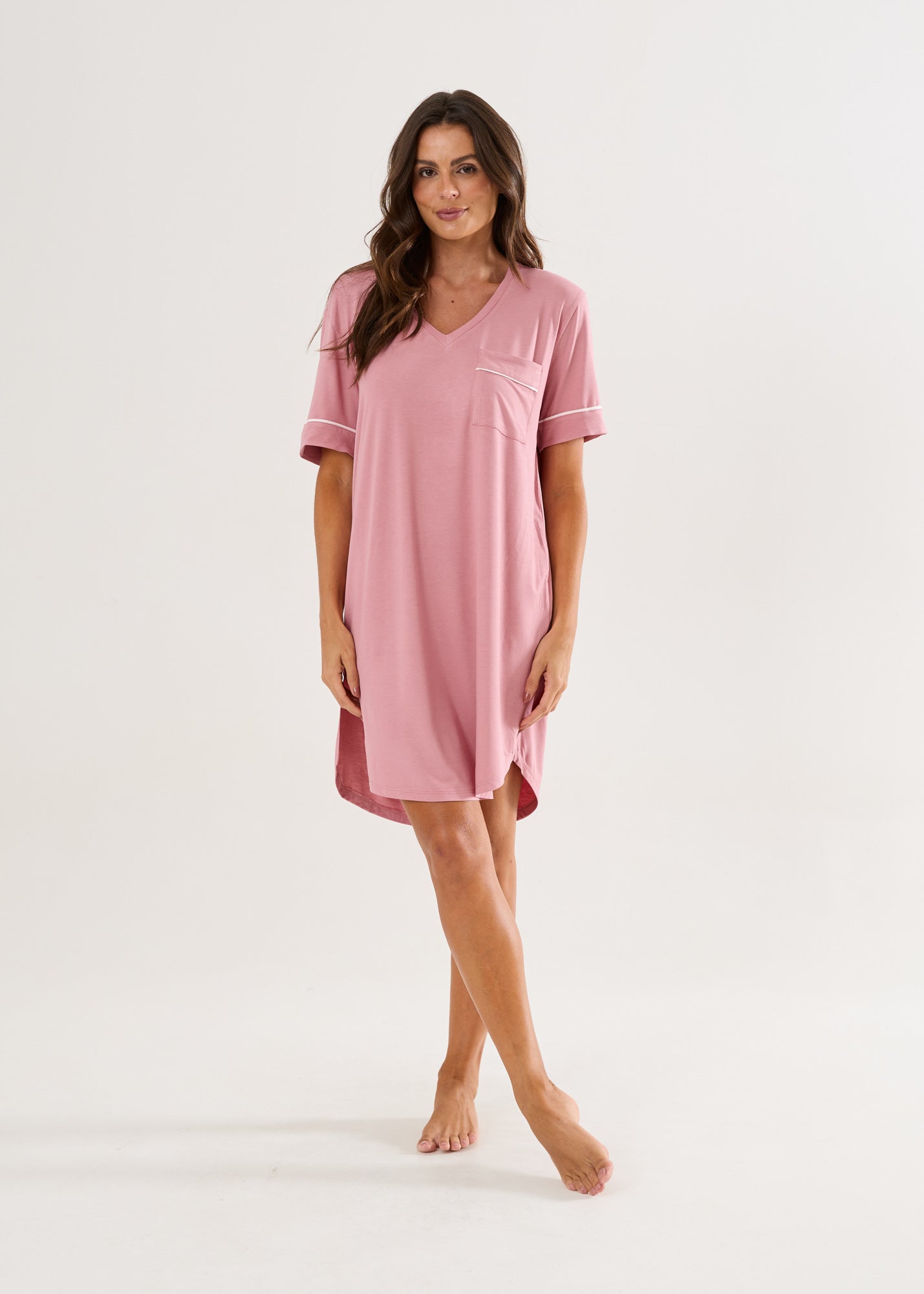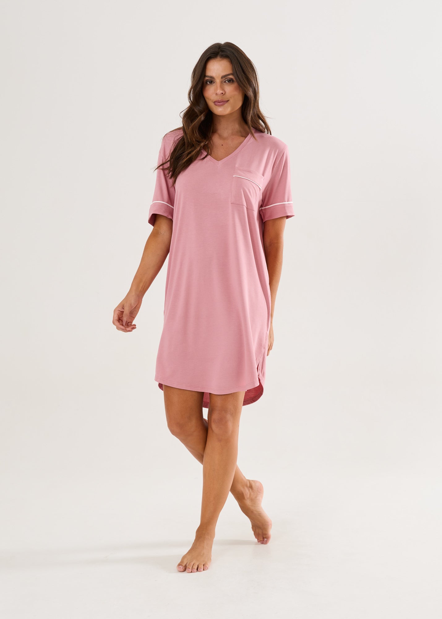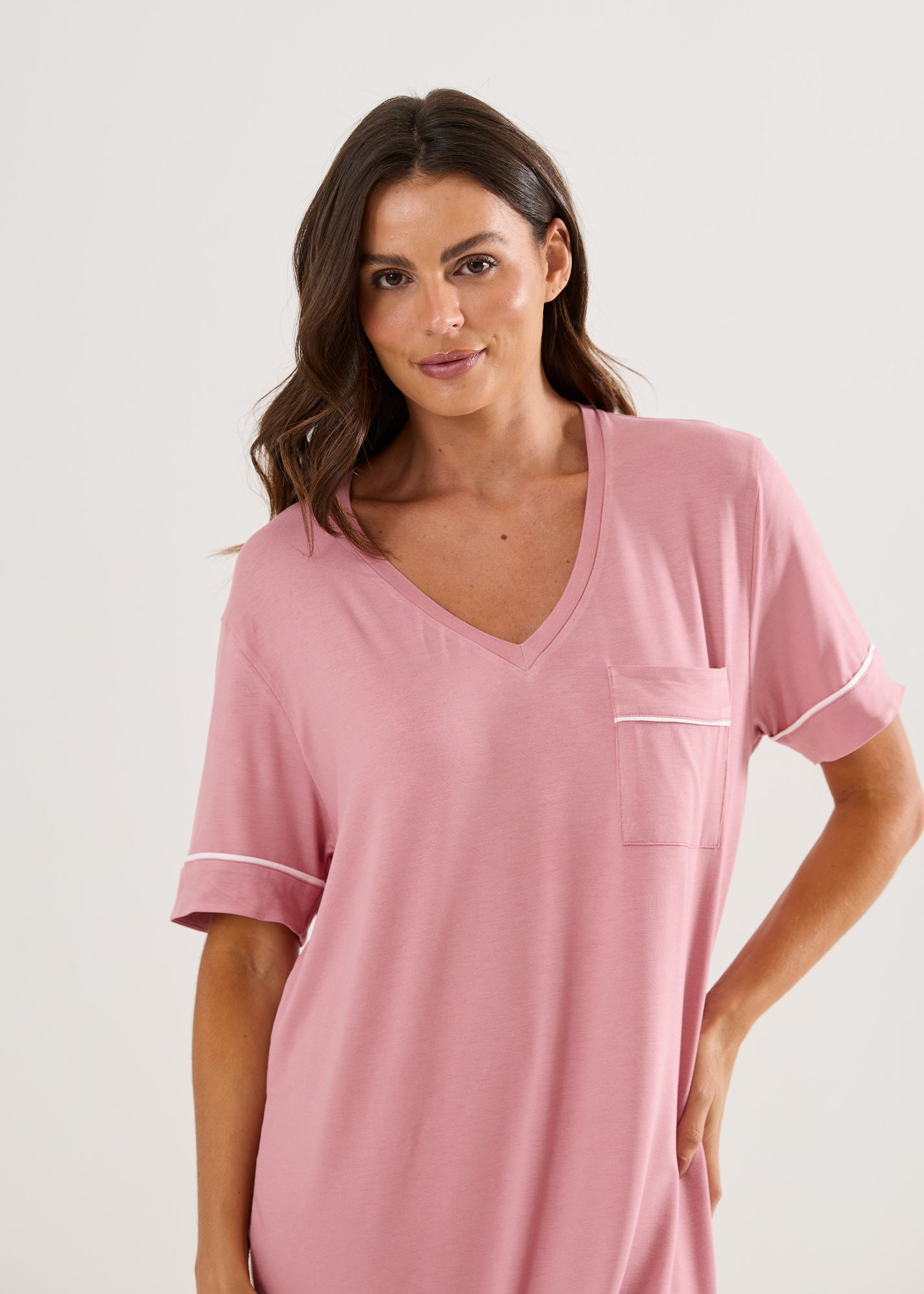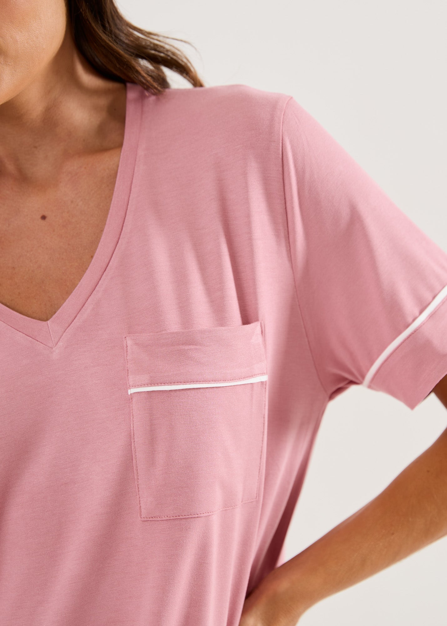 Camisola com mangas curtas, modelagem soltinha, decote V, barra arredondada. Detalhe vivos branco nas mangas e bolso. Malha visco super macia, com um toque incrível para que você tenha muito conforto para dormir ou curtir seus momentos em casa relaxando.