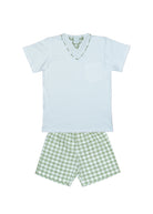 Pijama infantil masculino, bermuda em tecido xadrez 100% algodão, elástico na cintura e blusa em malha de algodão premium na cor branca, gola V, com detalhe do xadrez na gola.