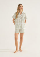 Pijama curto feminino, modelo americano. Blusa mangas curtas com botões, gola e detalhes em vivos e bolsinho lateral. Short com elástico na cintura e bolsos laterais.