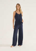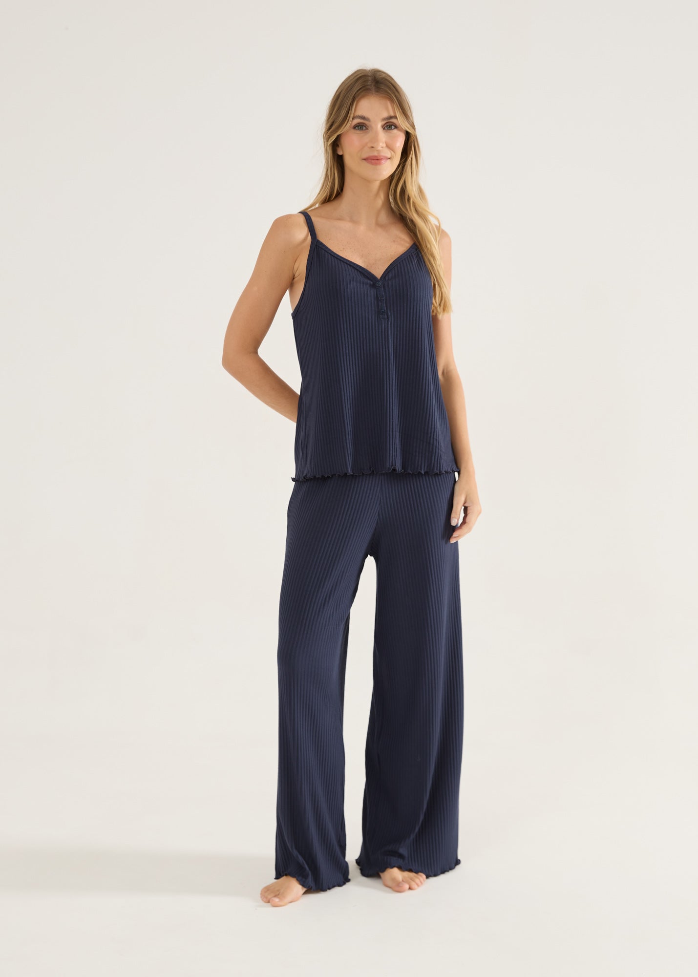 Calça avulsa feminina, em malha canelada com fio da viscose. Elástico na cintura e barra com fru-fru. Leve, confortável, gostosa de usar, não marca. Combine a calça avulsa com as blusas de alças e de mangas da mesma coleção, como sugerimos nas fotos. Você vai querer uma de cada cor!