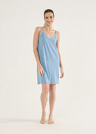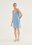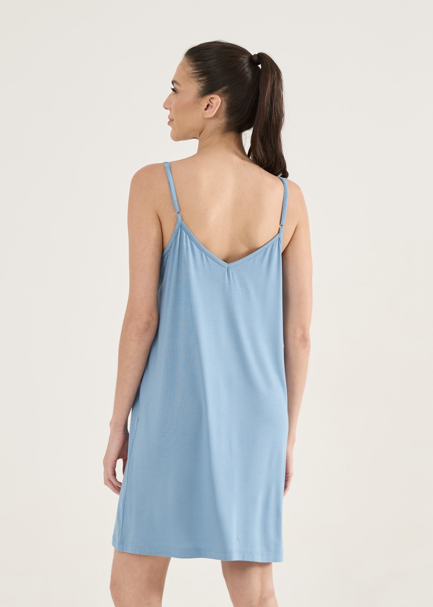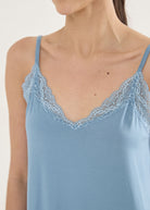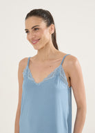 Camisola feminina modelo alças, modelagem soltinha, decote com detalhe em renda no decote. Comprimento acima do joelho.