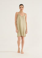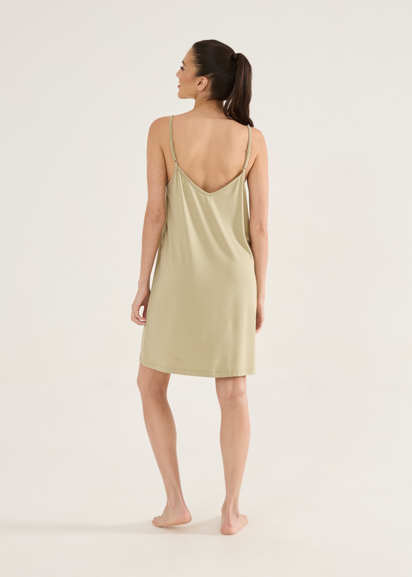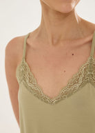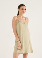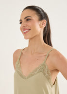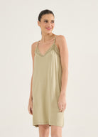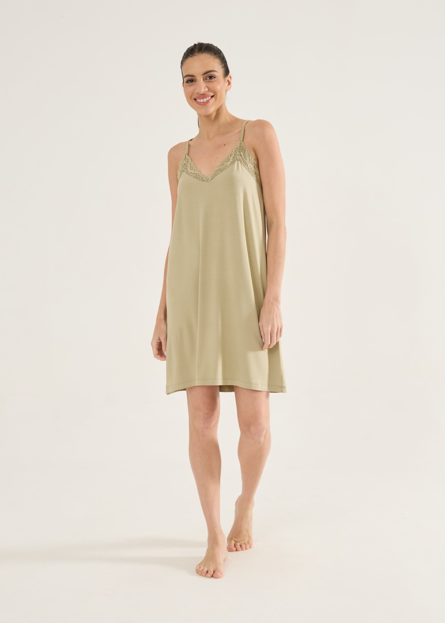 Camisola feminina modelo alças, modelagem soltinha, decote com detalhe em renda no decote. Comprimento acima do joelho.
