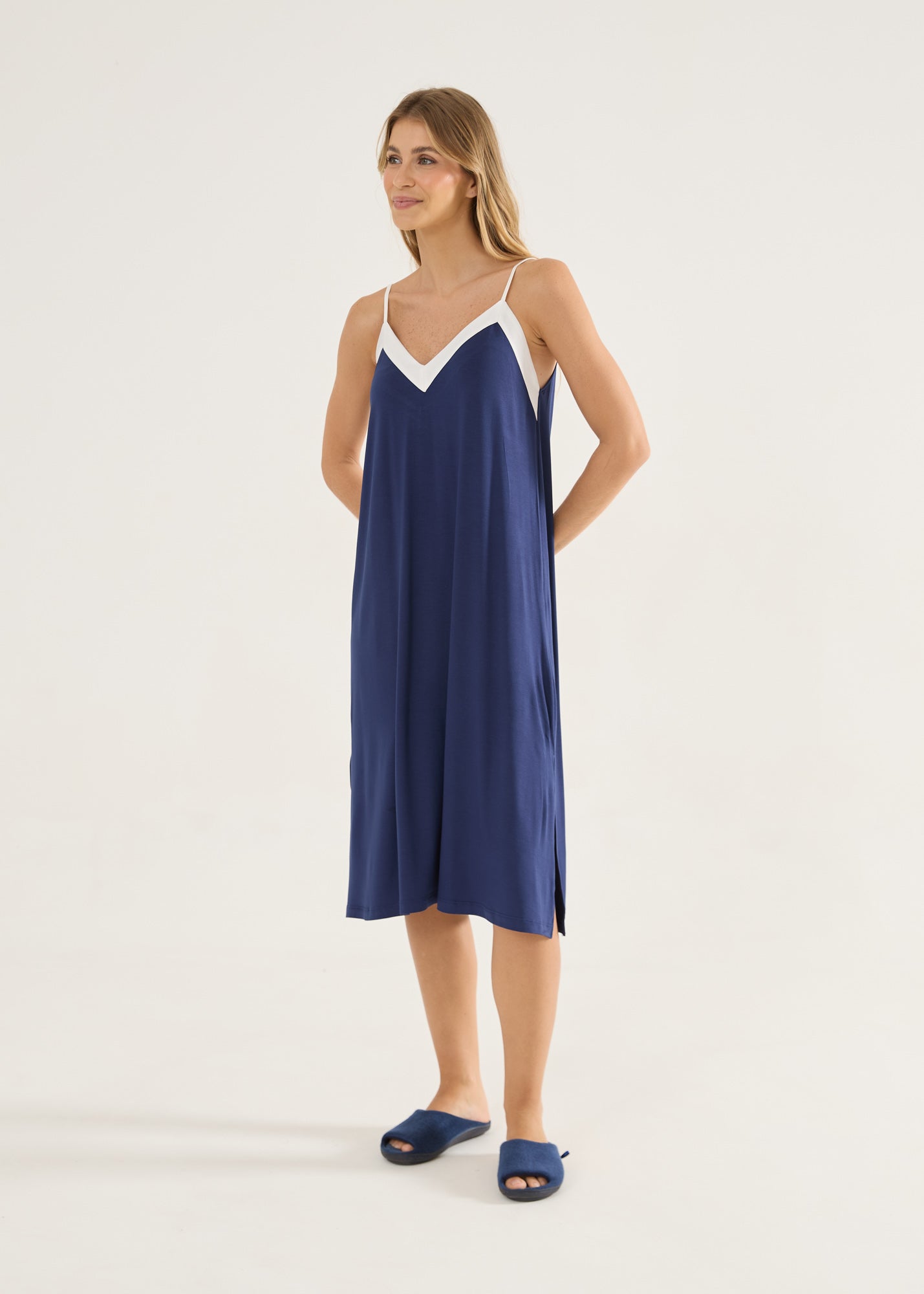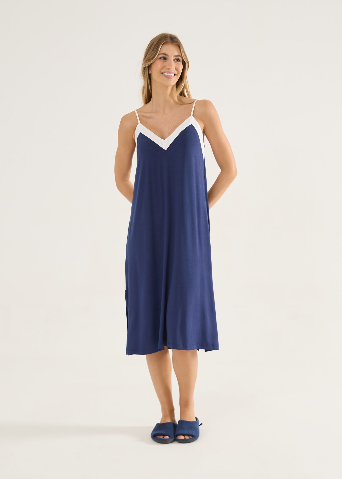 Camisola feminina, modelo alças com detalhe em cetim decote. O comprimento midi alonga a silhueta. Fendas laterais na barra. Uma camisola confortável pela sua modelagem soltinha e elegante pelo comprimento que alonga a silhueta e pela sua combinação de cores clássicas e atemporais. O detalhe em cetim traz a sofisticação para essa linda camisola!
