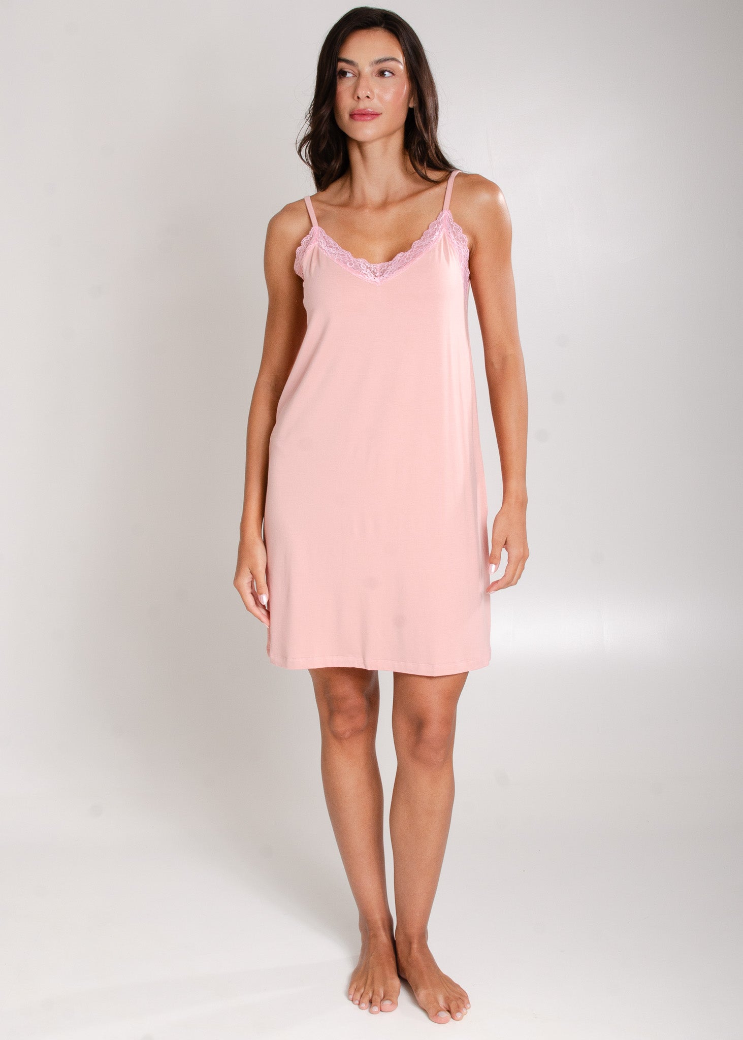 Camisola feminina, modelagem soltinha, decote com detalhe em renda, alças para ficar bem fresquinha para o verão. A malha visco é confortável e leve, com toque muito macio. Comprimento no joelho.