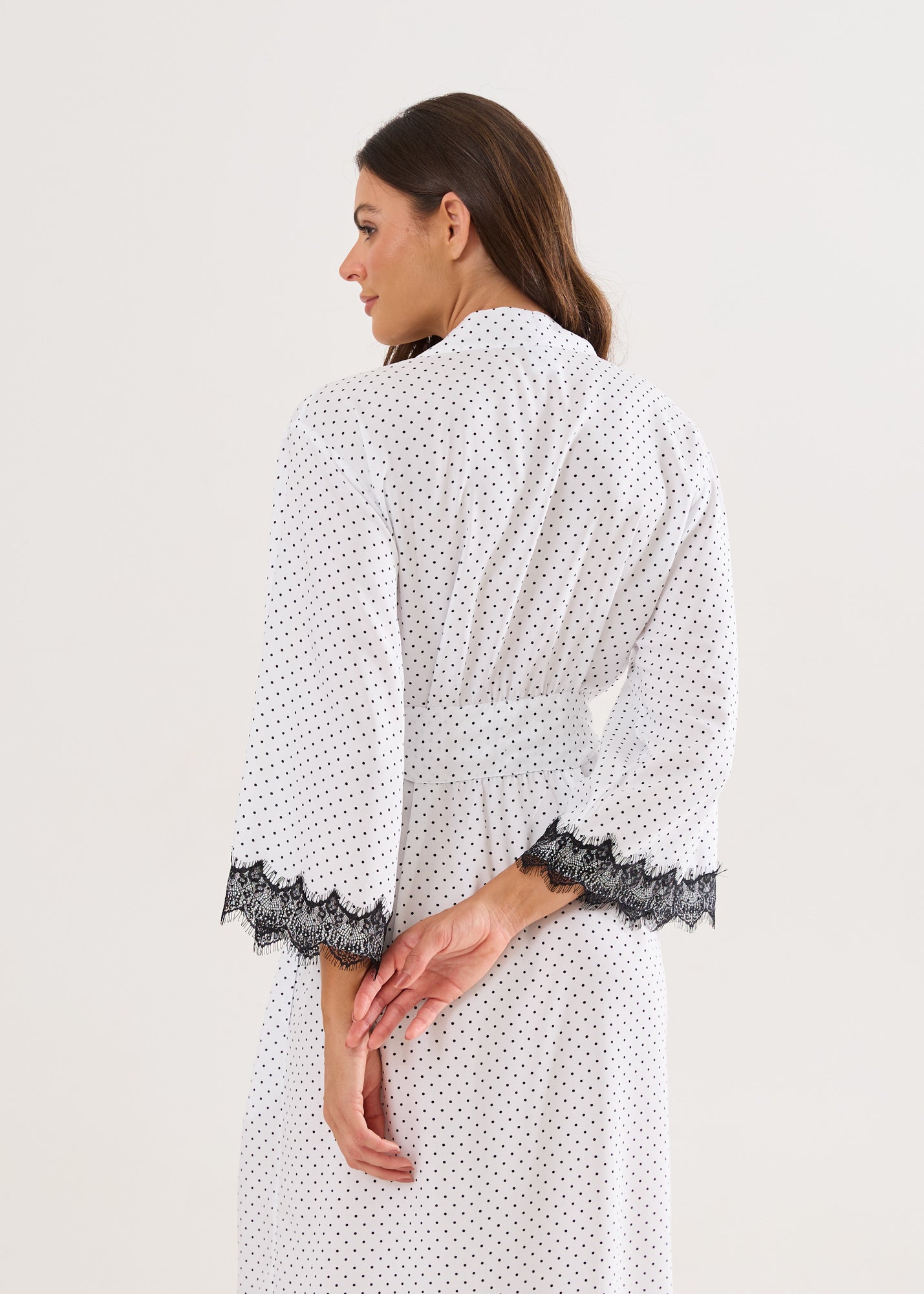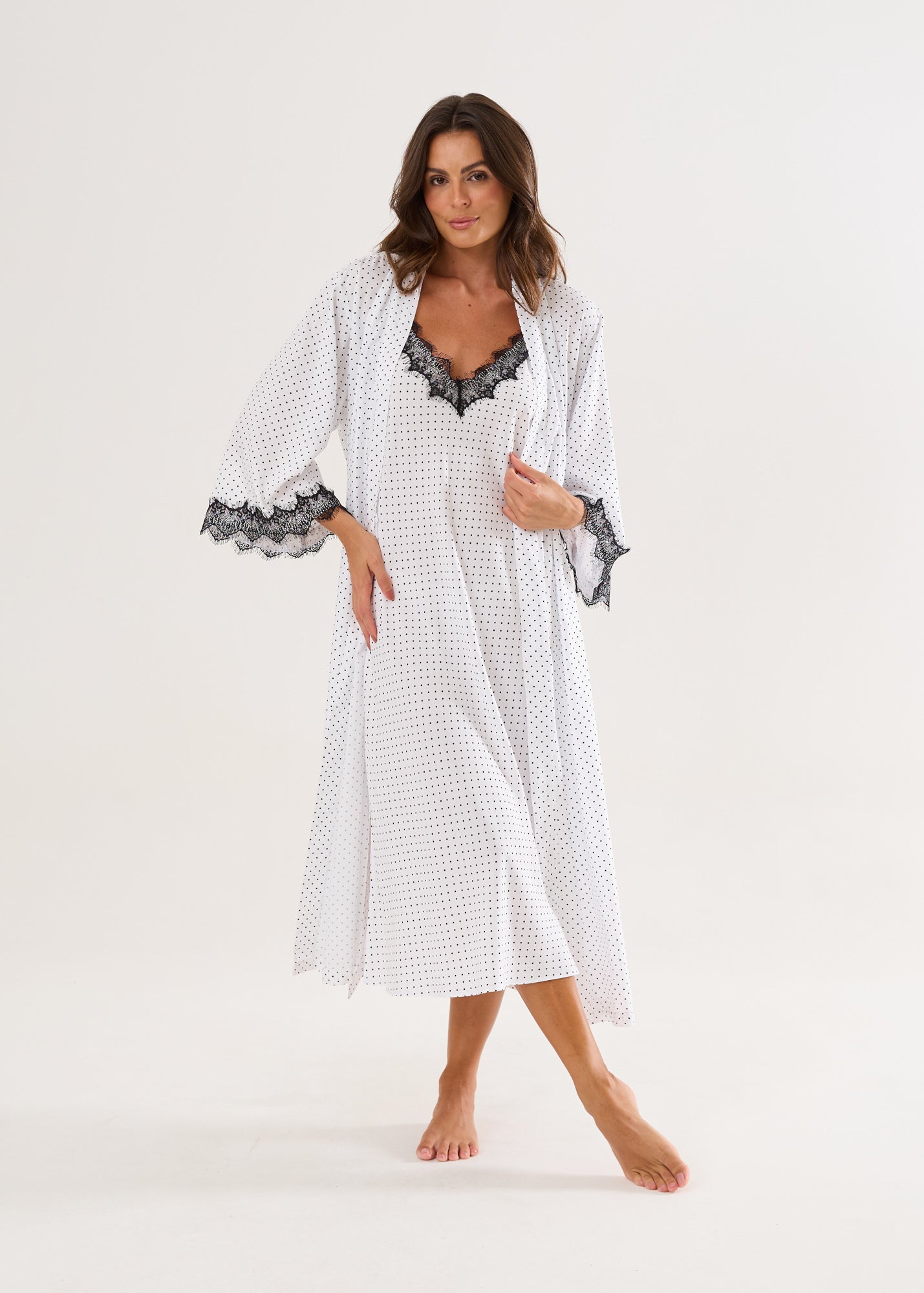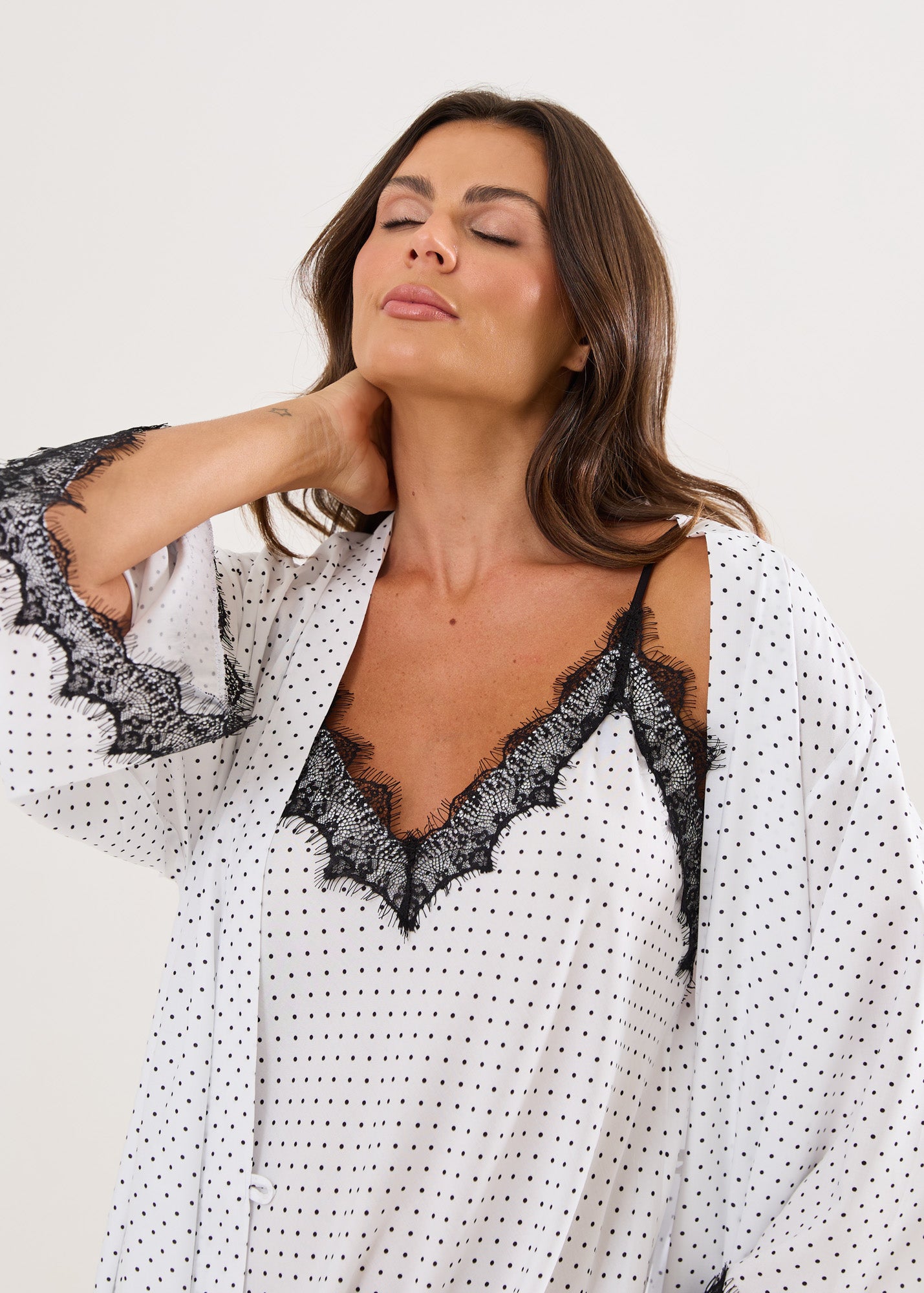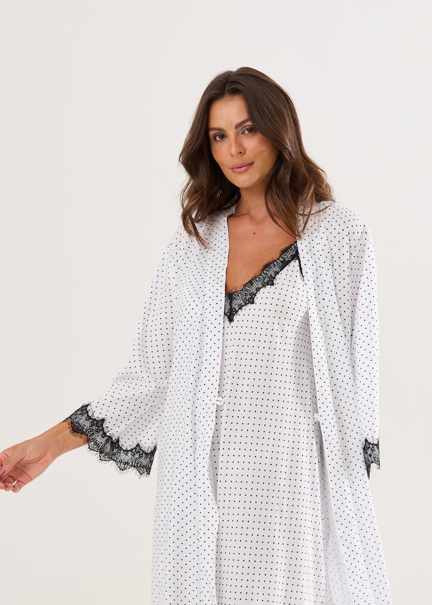 Robe com detalhe em renda francesa nas mangas, comprimento midi. Combine o robe com a camisola na mesma estampa e faça um lindo conjunto!