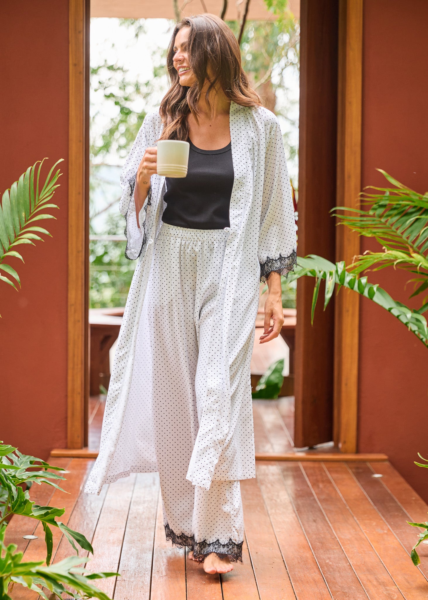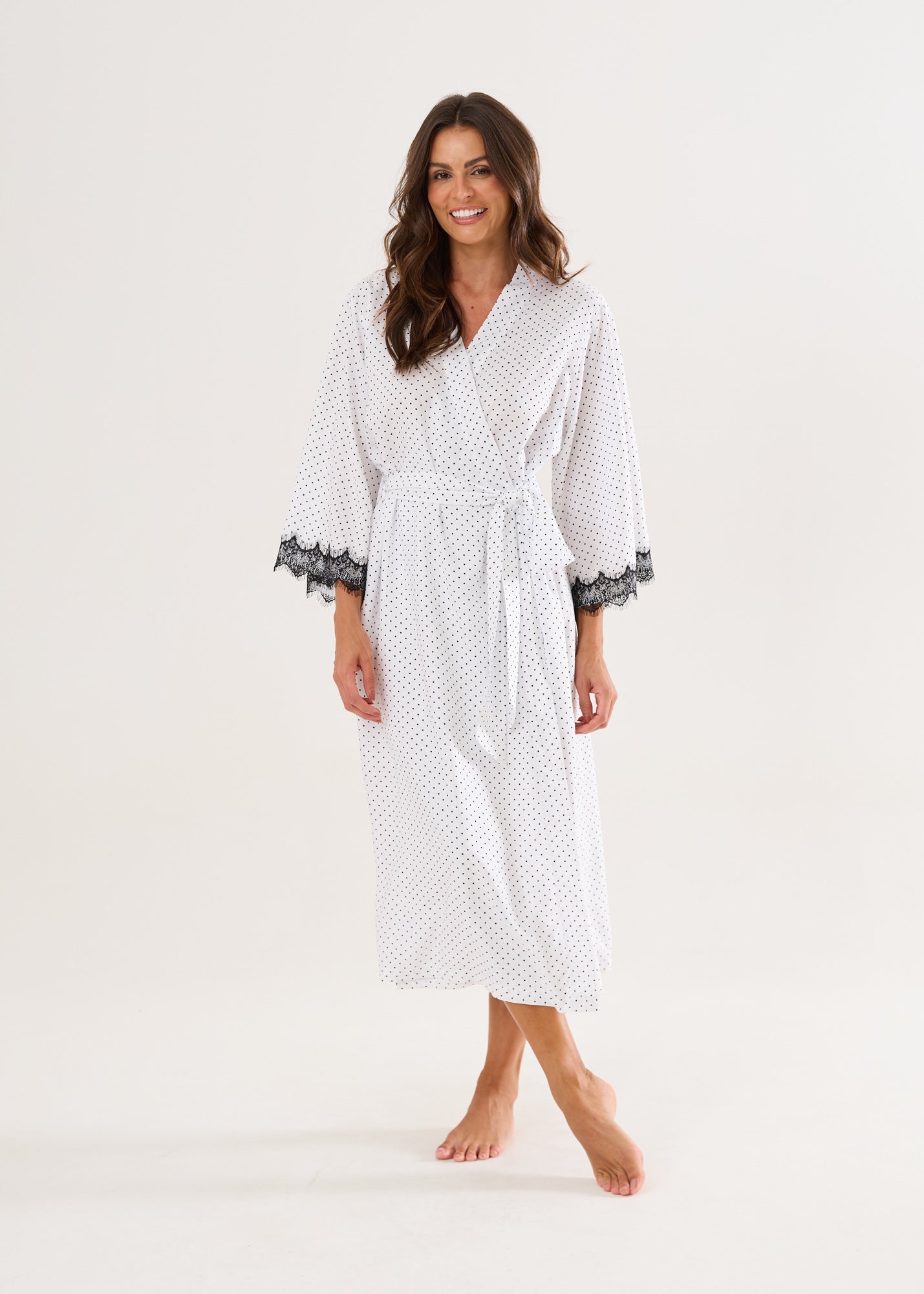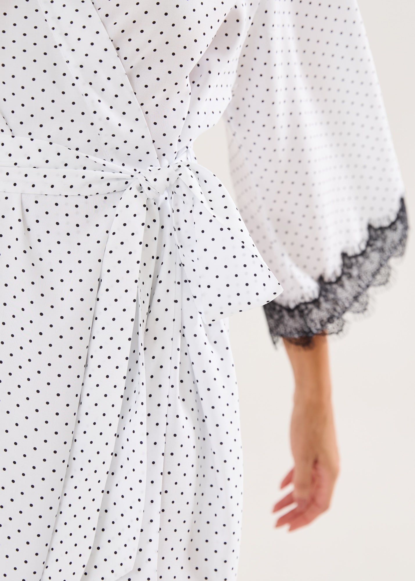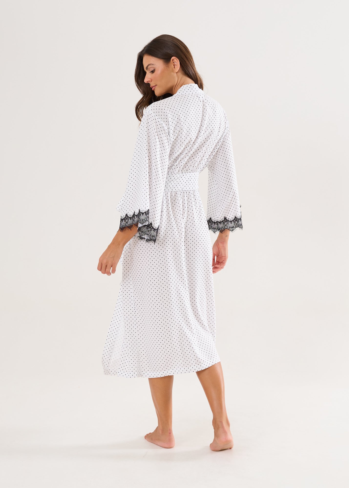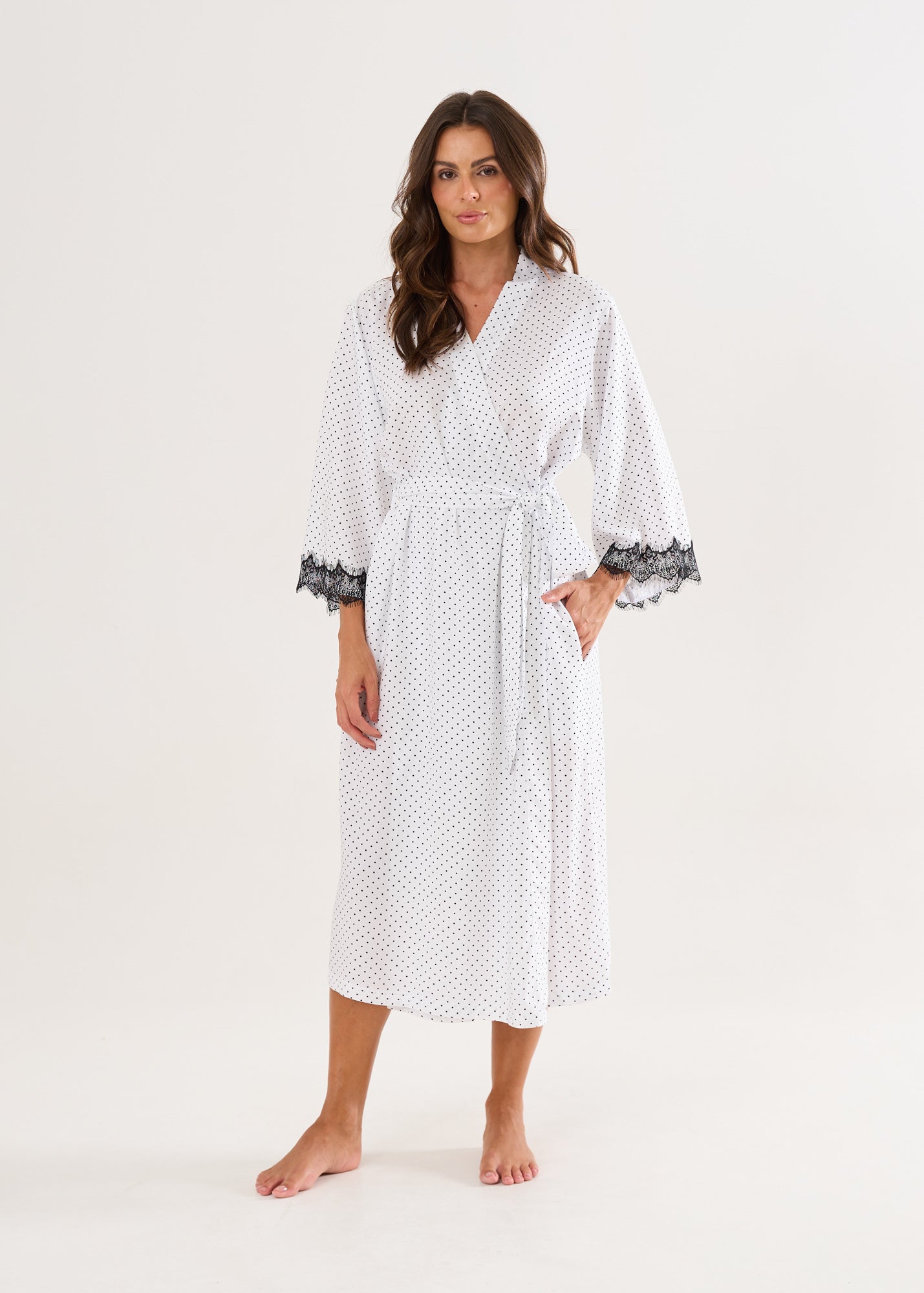 Robe com detalhe em renda francesa nas mangas, comprimento midi. Combine o robe com a camisola na mesma estampa e faça um lindo conjunto!
