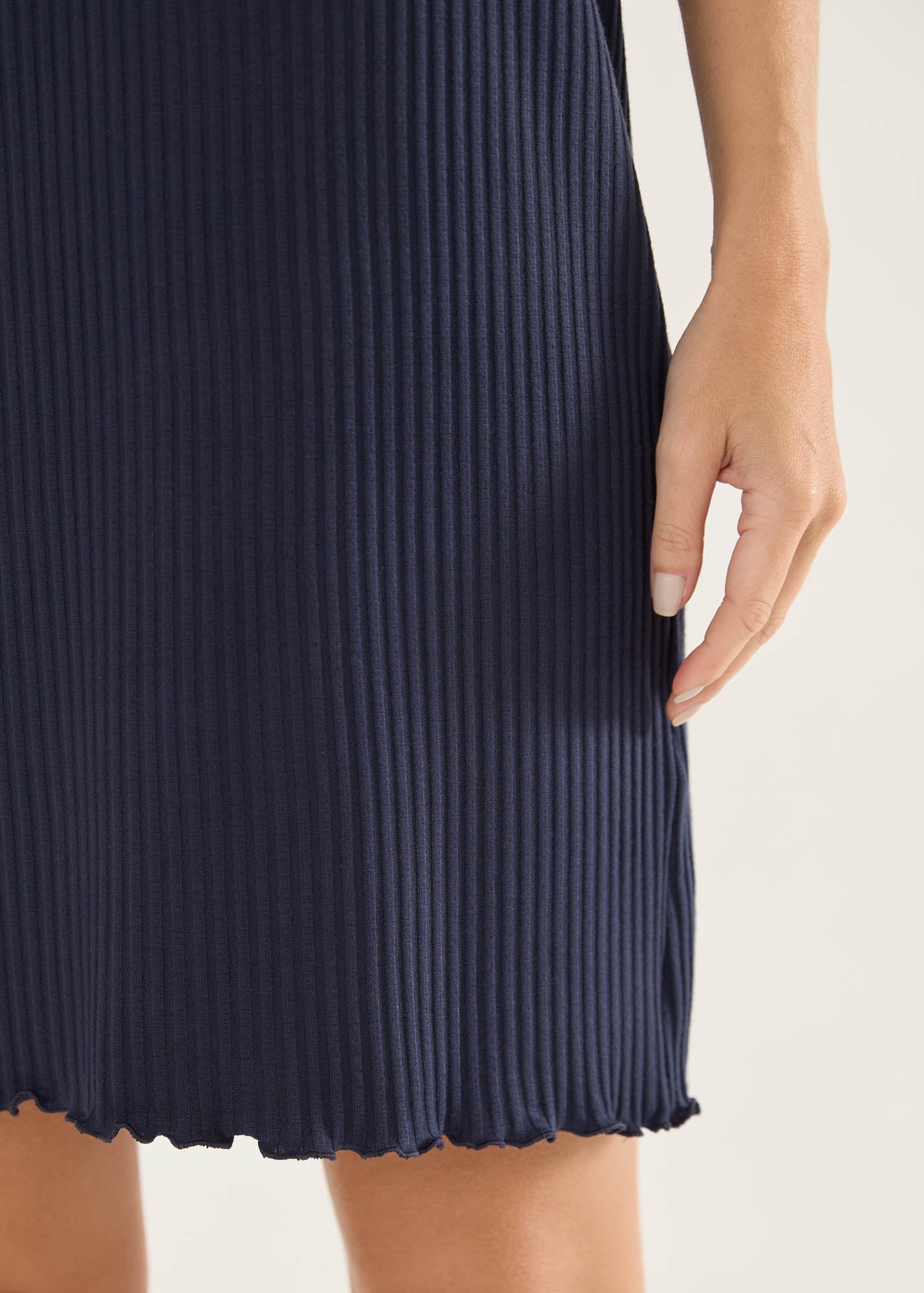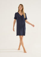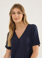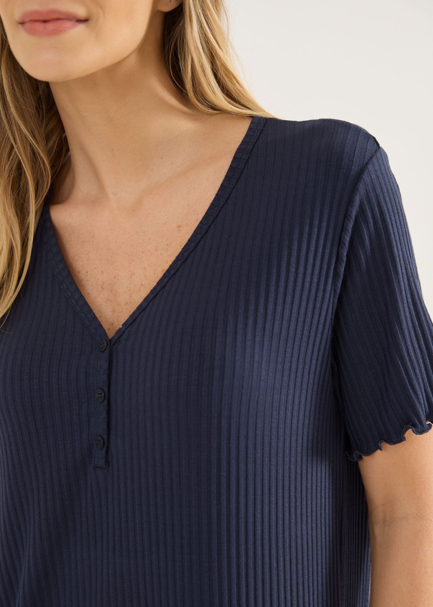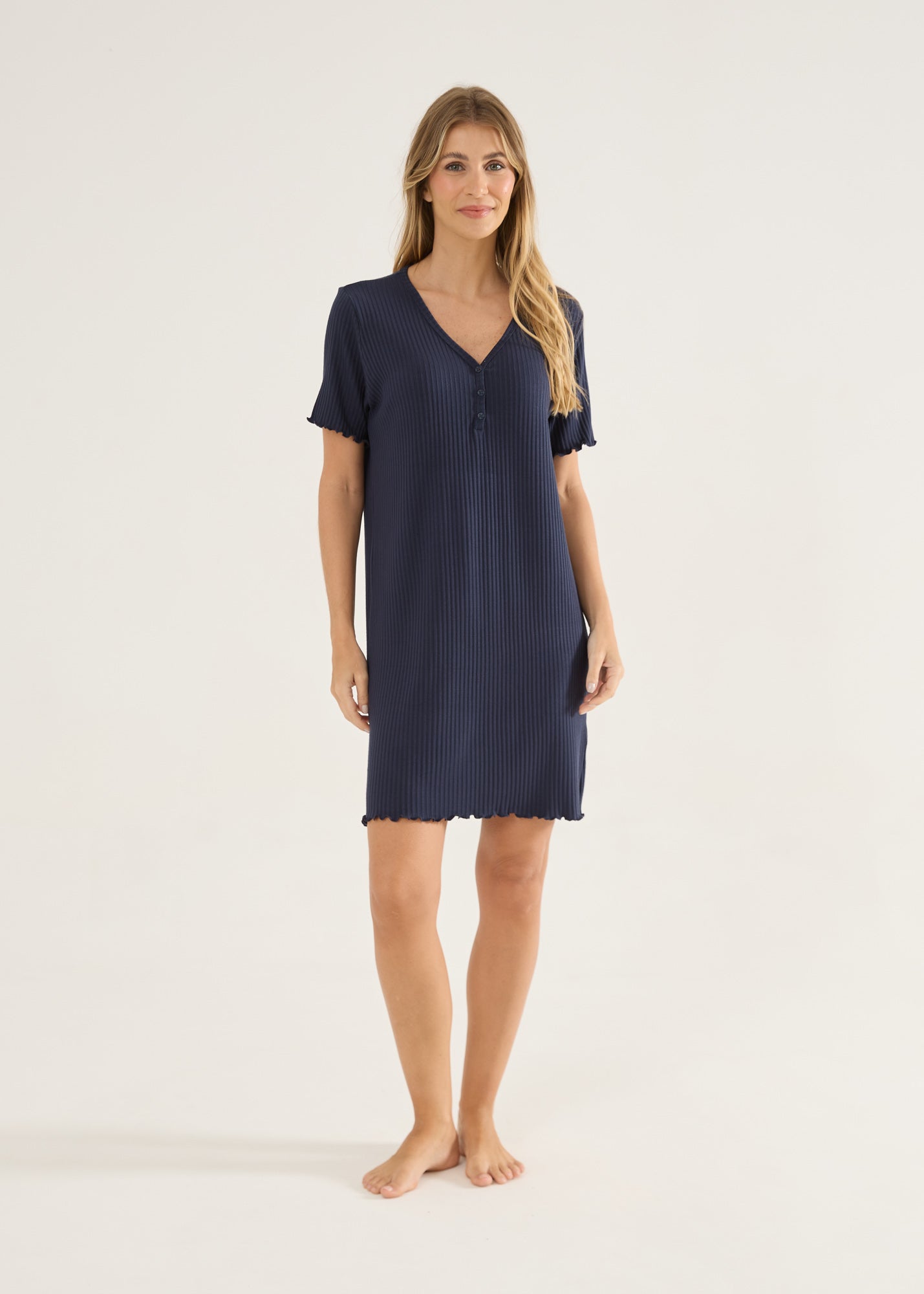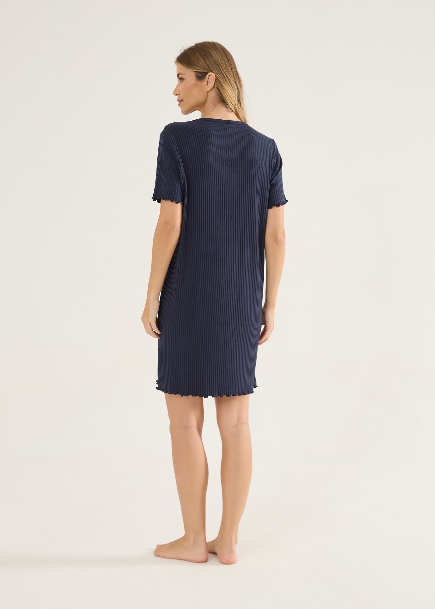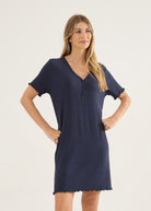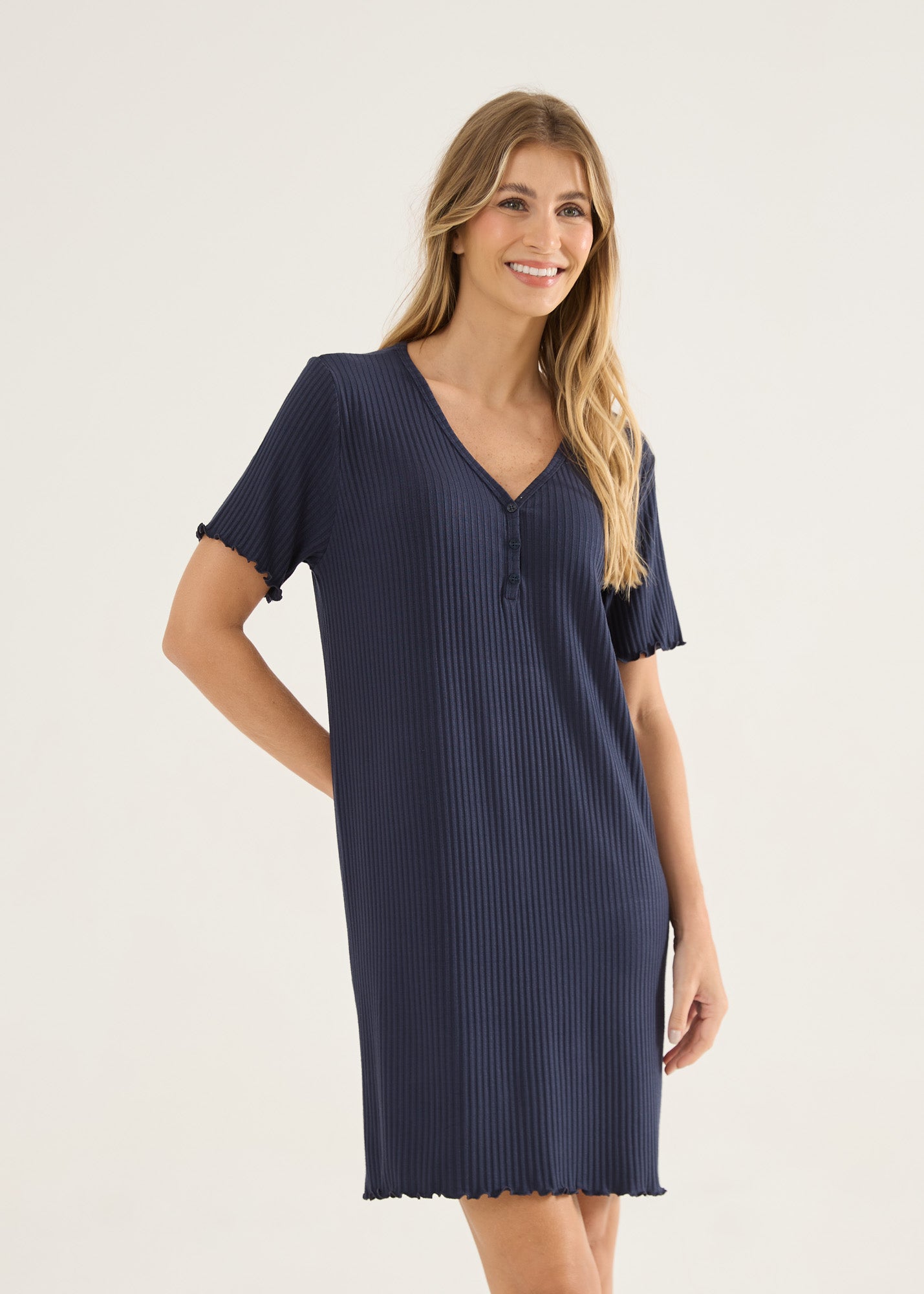 Camisola feminina com mangas curtas, em malha canelada com fio da viscose. Detalhe botões no decote e barra com fru-fru. Comprimento acima do joelho. Leve, confortável, gostosa de usar, não marca. Você vai querer uma de cada cor!