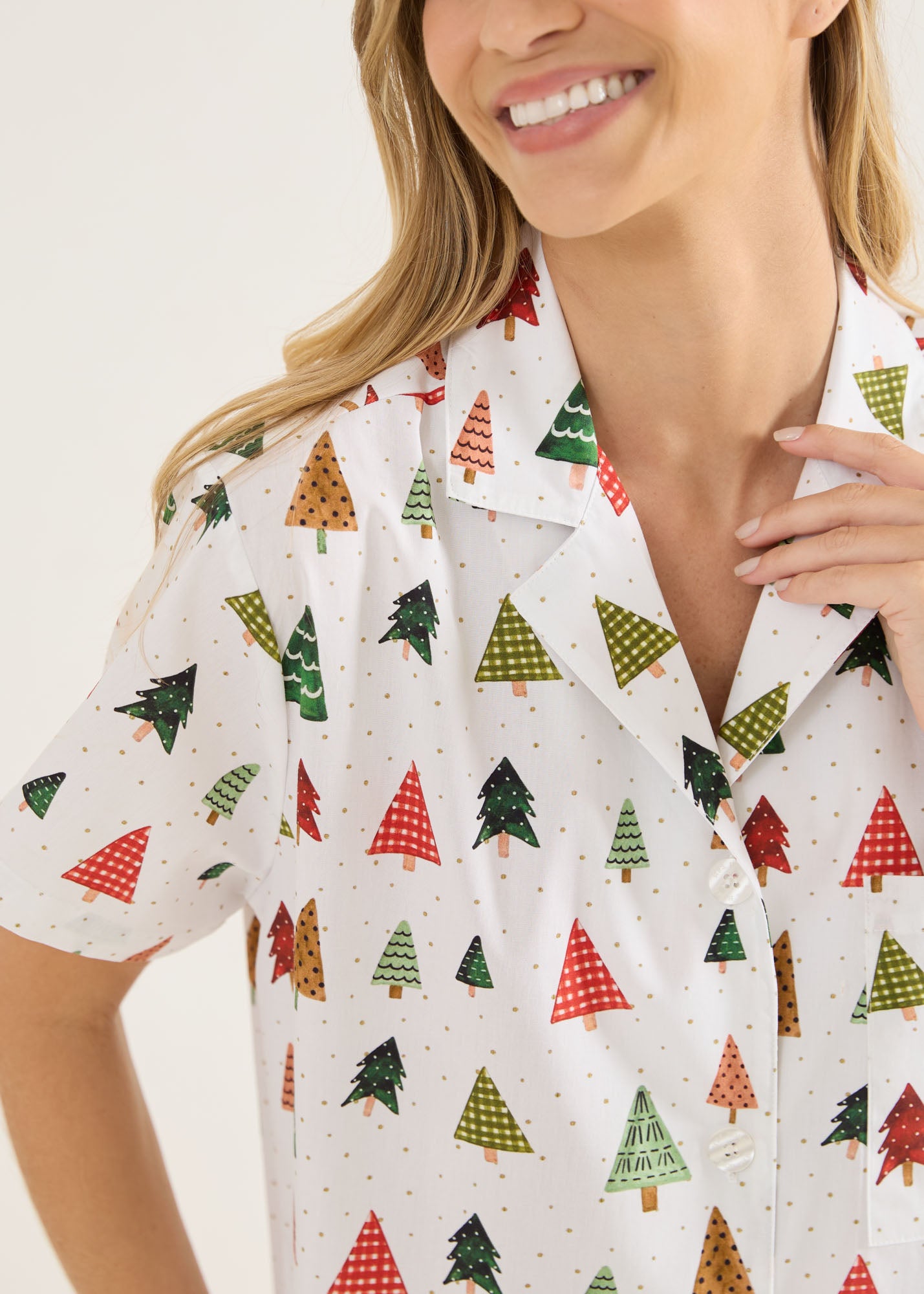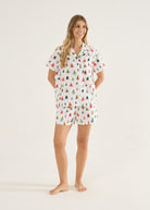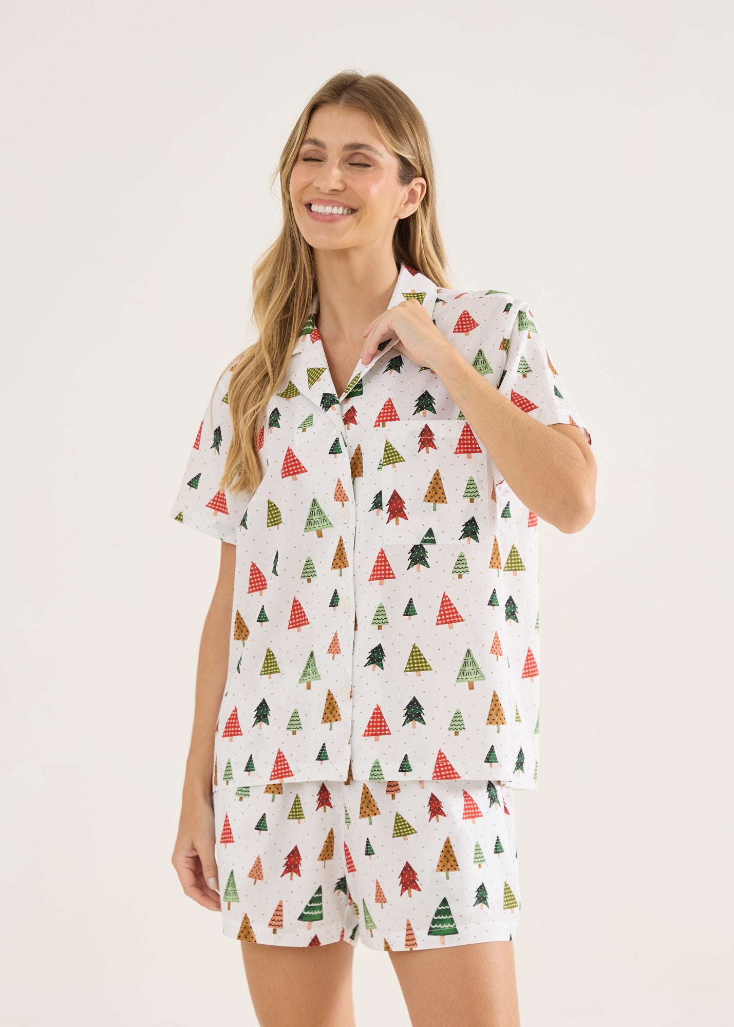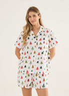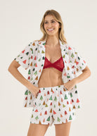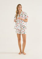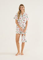 Pijama curto feminino, modelo americano com botões, blusa com mangas curtas e bermuda com elástico na cintura e bolsos laterais. Em tecido 100% algodão. Seu pijama vem embalado no saquinho com a mesma estampa.