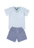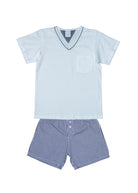 Pijama infantil masculino, bermuda em tecido xadrez 100% algodão, elástico na cintura. Blusa em malha de algodão premium na cor branca, gola V, com detalhe do xadrez na gola. Bermuda xadrez marinho e branco.
