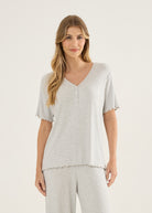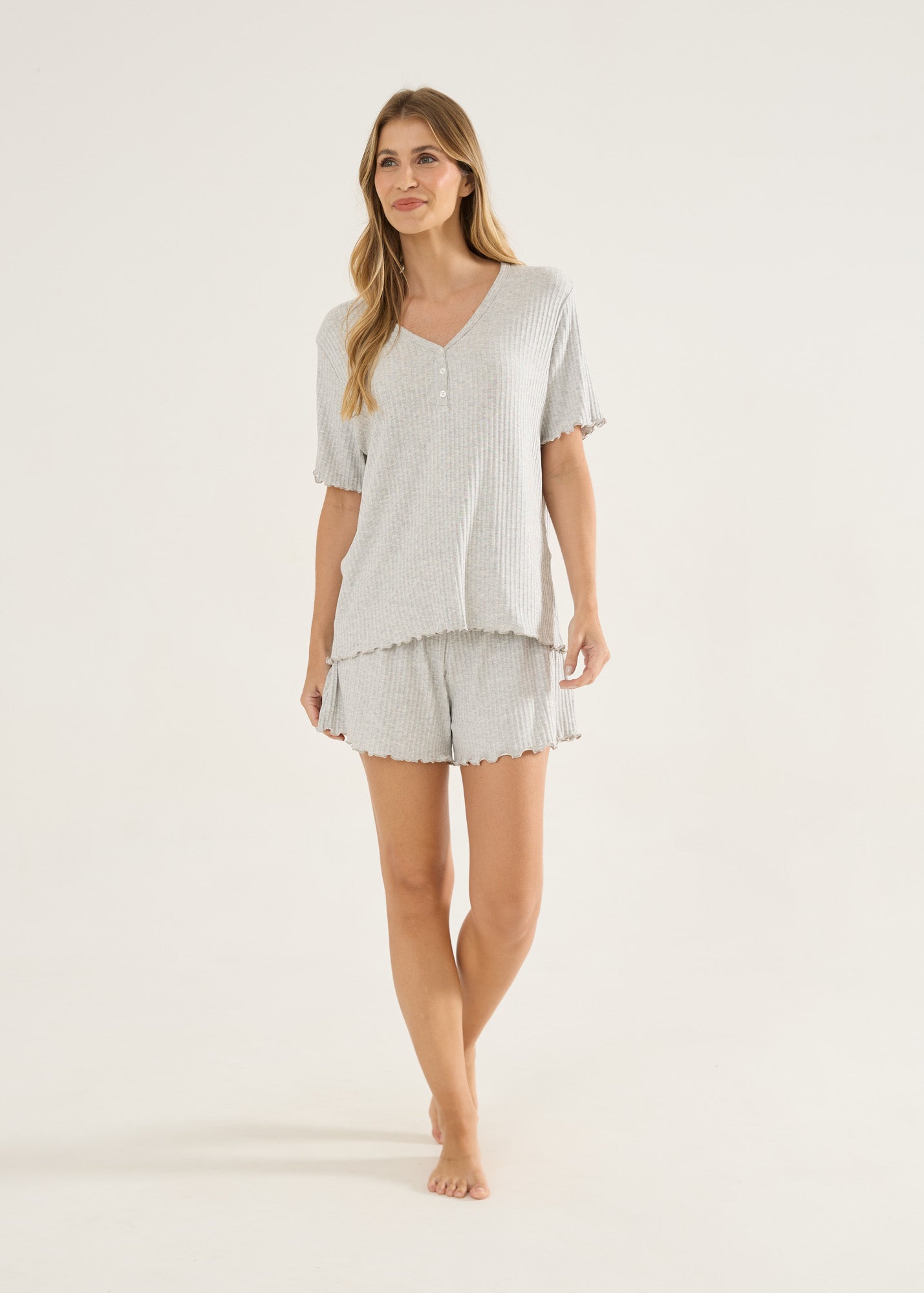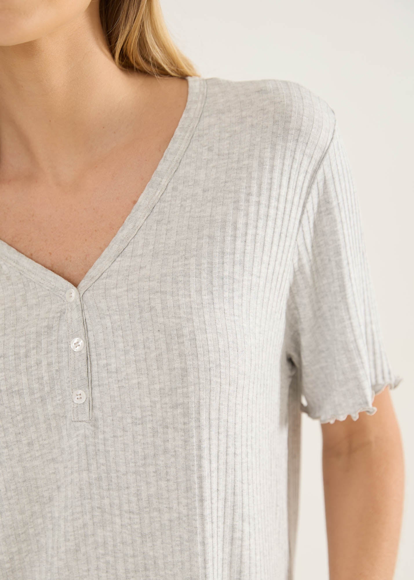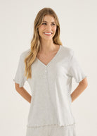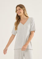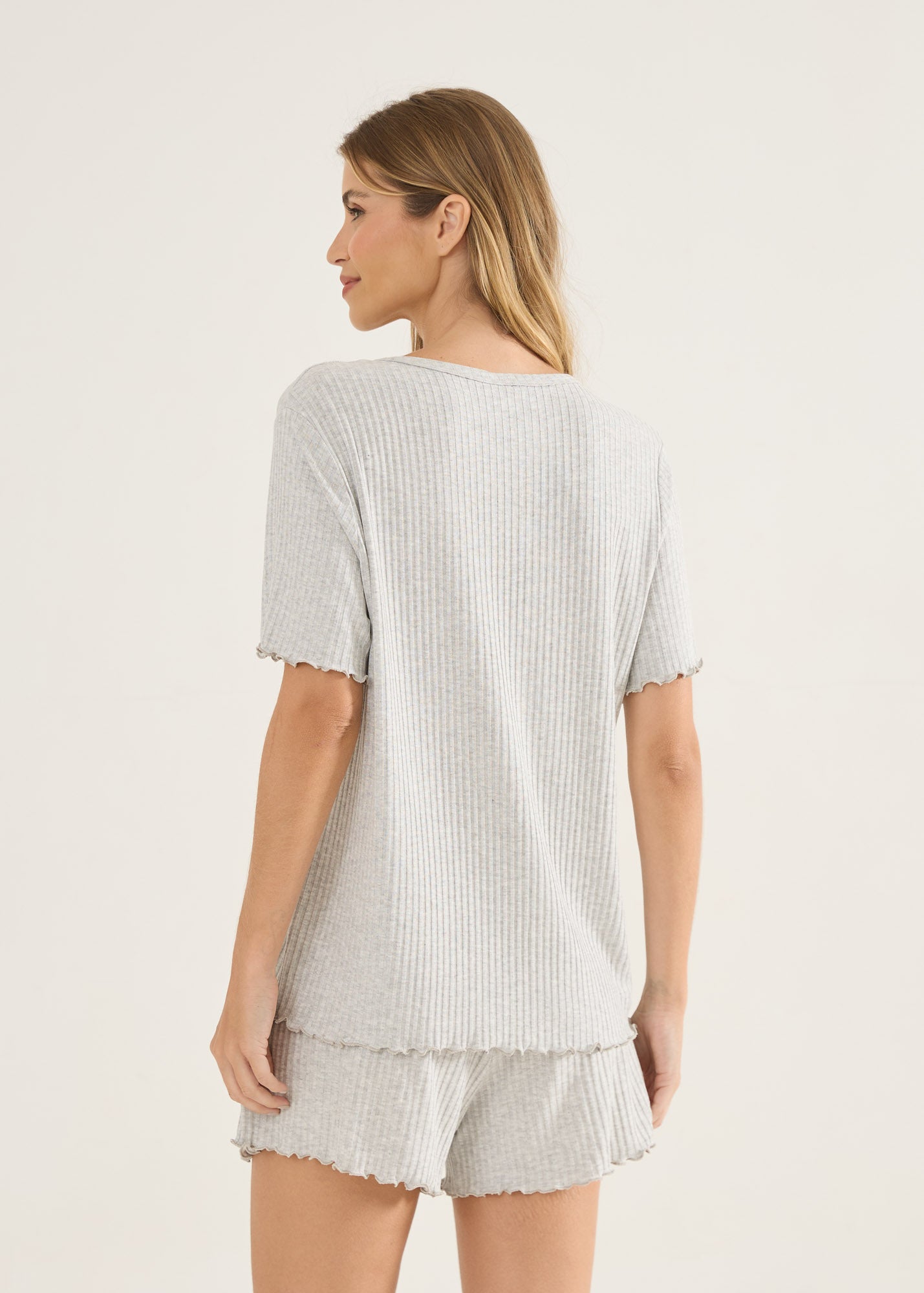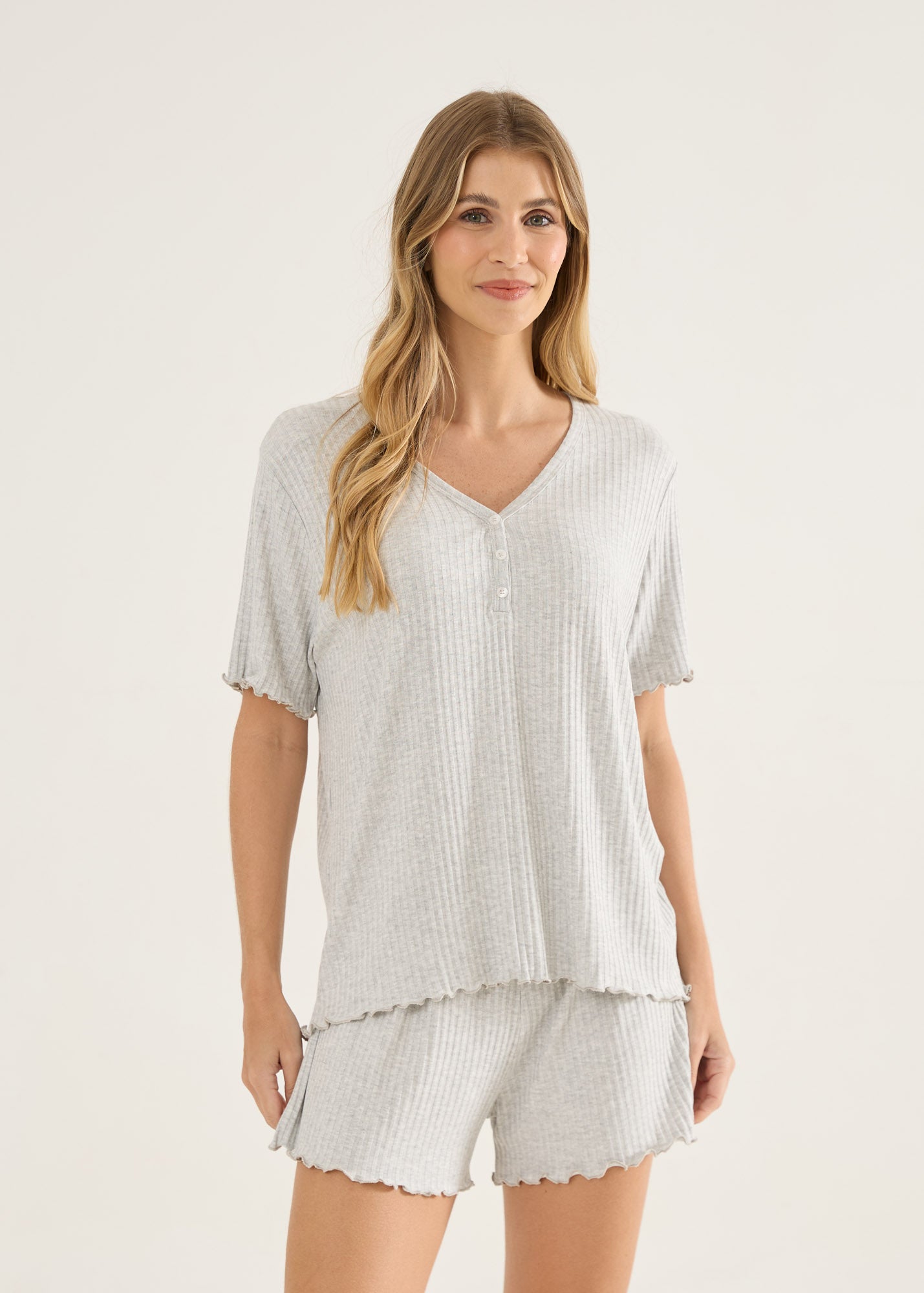 Blusa avulsa com mangas curtas, em malha canelada com fio da viscose. Detalhe botões no decote e barra com fru-fru. Combine a blusa avulsa com o short ou a calça da mesma coleção, como sugerimos nas fotos, e combine seu pijama do seu jeito. Você vai querer uma de cada cor!