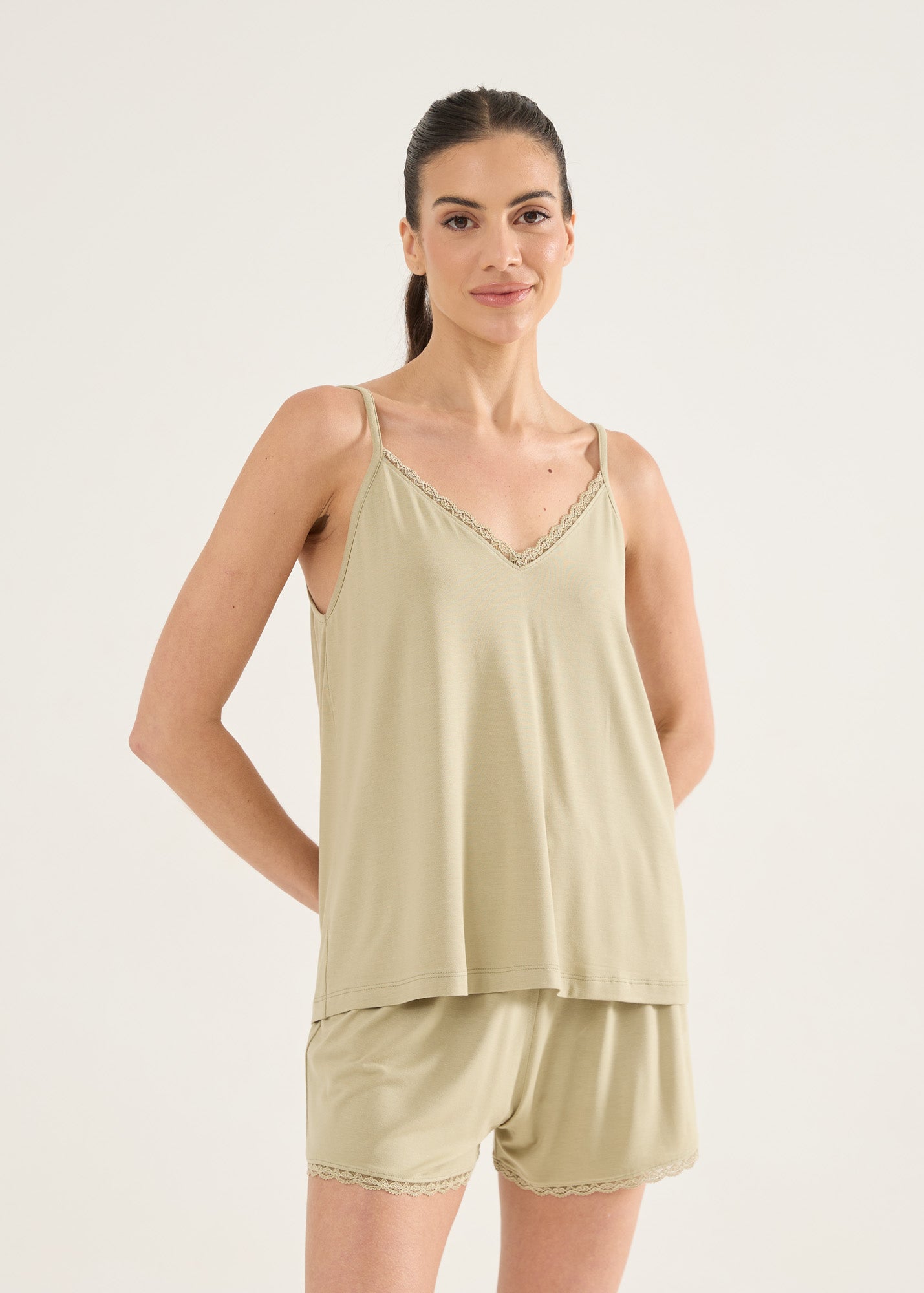 Pijama curto feminino com o toque inigualável da malha modal, modelo de alças, bermuda com elástico na cintura. Delicado detalhe em renda no decote e na barra da bermuda. Combine seu pijama com o robe em modal da mesma coleção e tenha um lindo conjunto!