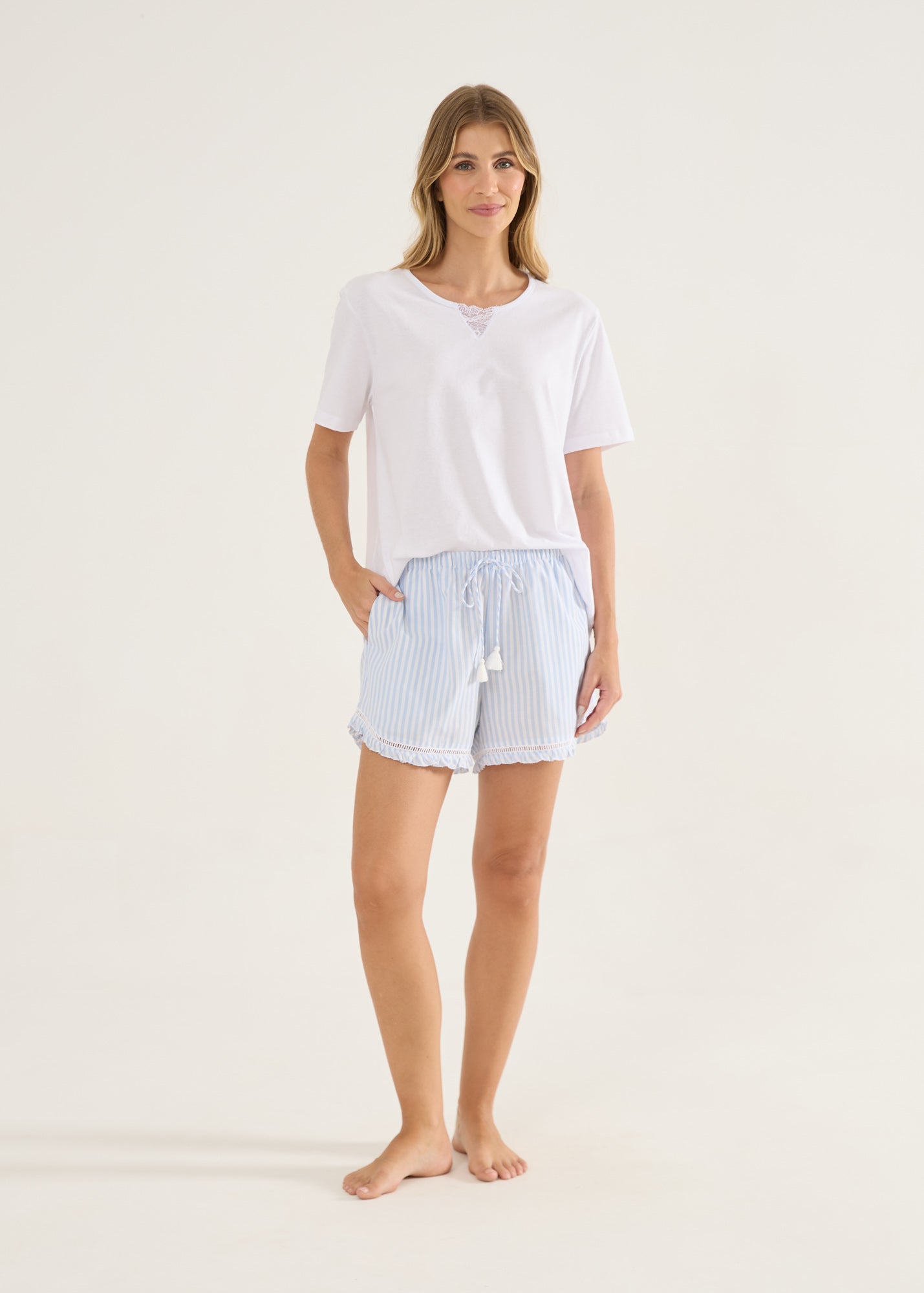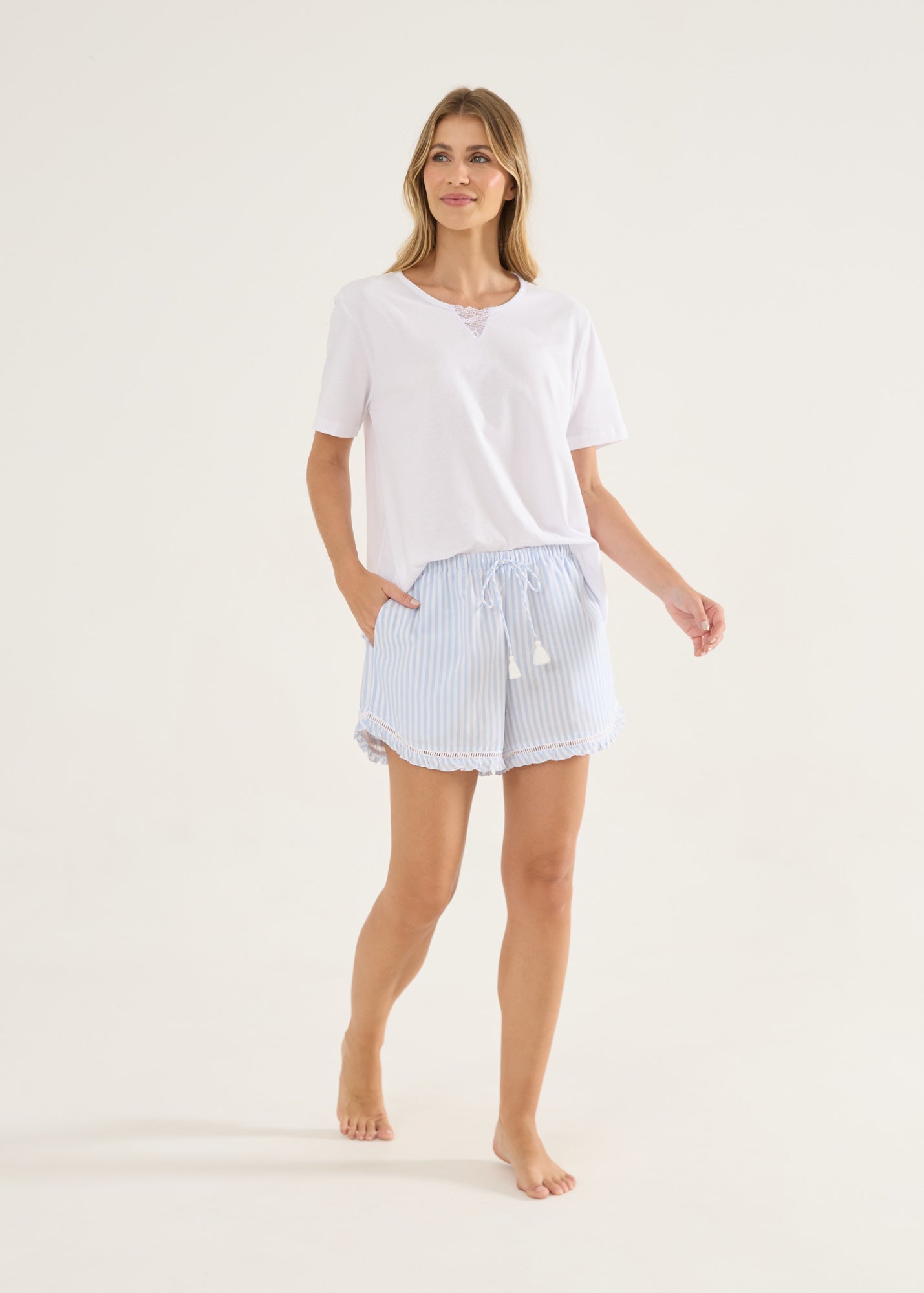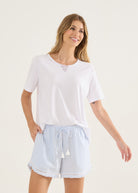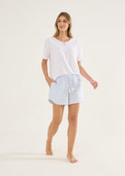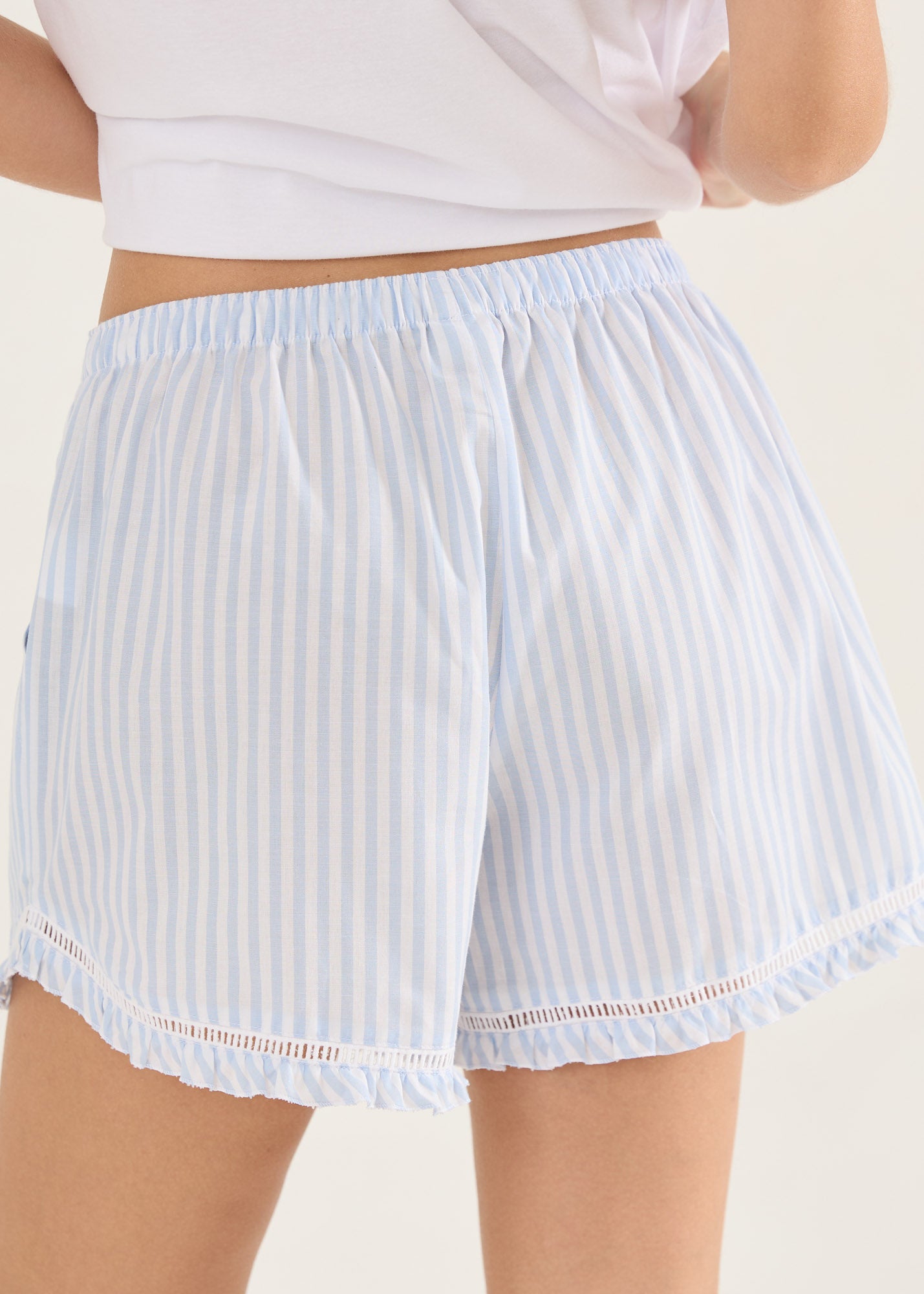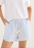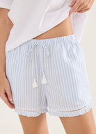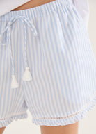 Short avulso em tecido 100% algodão, listrado, com detalhe na barra e um lindo tassel de linha feito à mão exclusivamente para a Mrs. Home. Bolsos laterais e elástico na cintura. Combine o short avulso da Coleção Nina com uma blusa branca como sugerimos nas fotos e monte seu pijama do seu jeito.