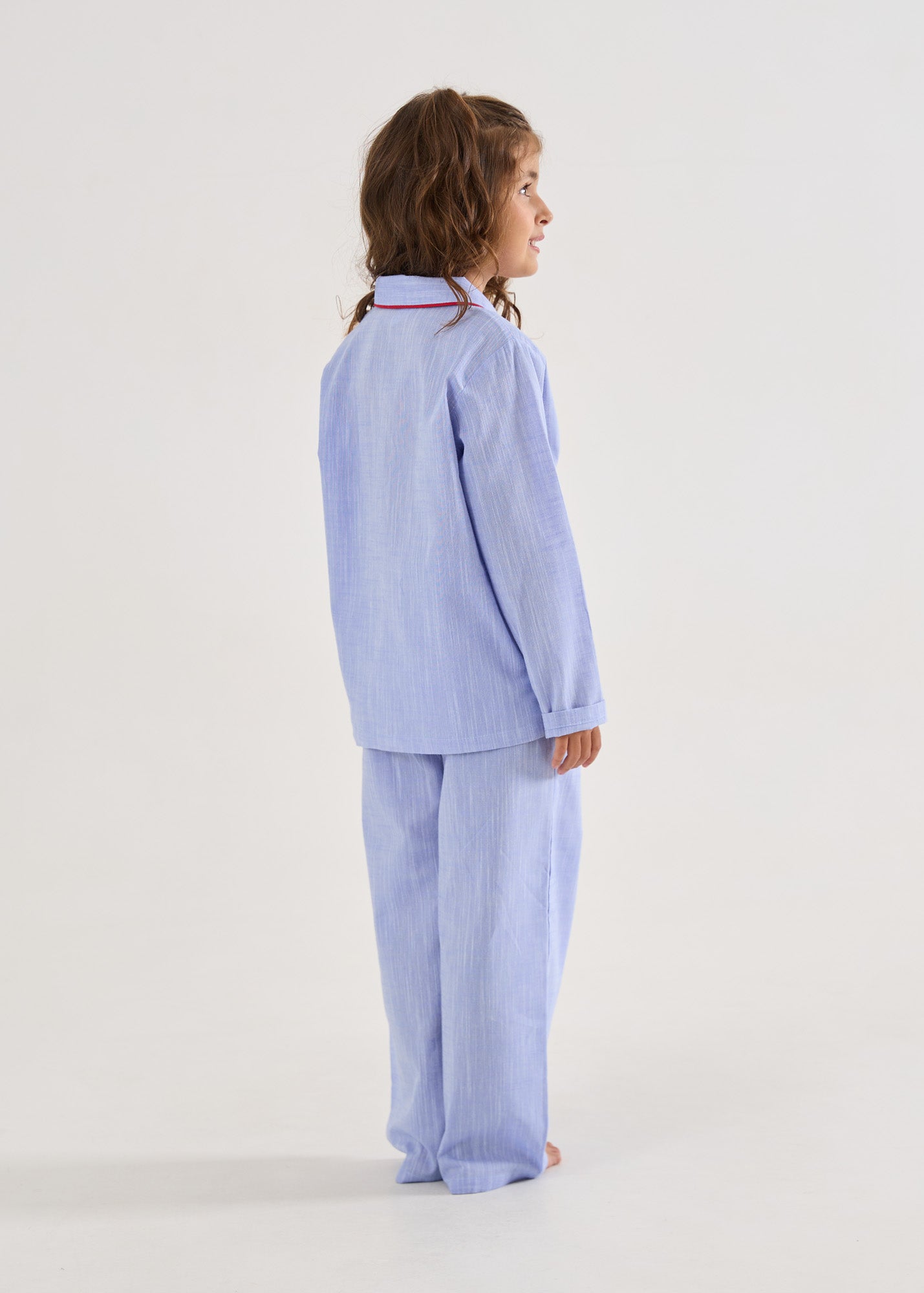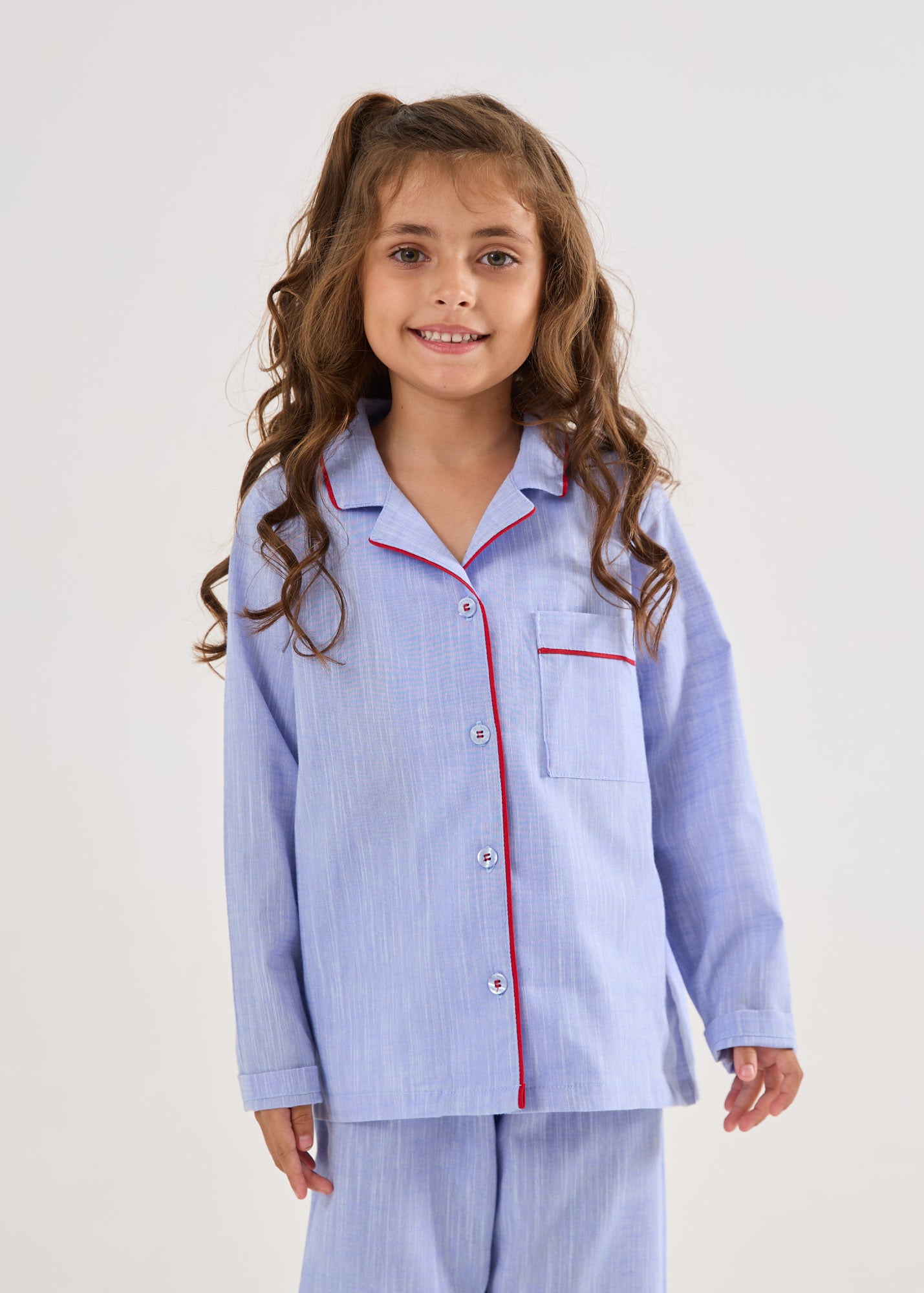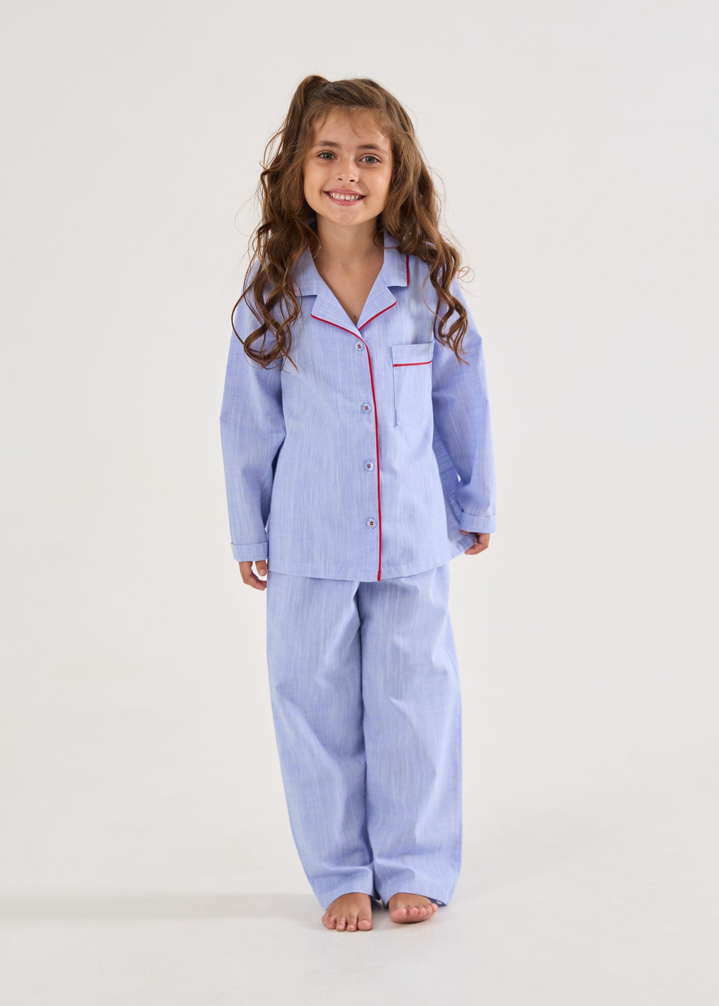 Pijama longo infantil para meninas, modelo calça com elástico na cintura. Blusa mangas longas, com gola e botões personalizados, e detalhe em vivos vermelho. Em tecido 100% algodão.