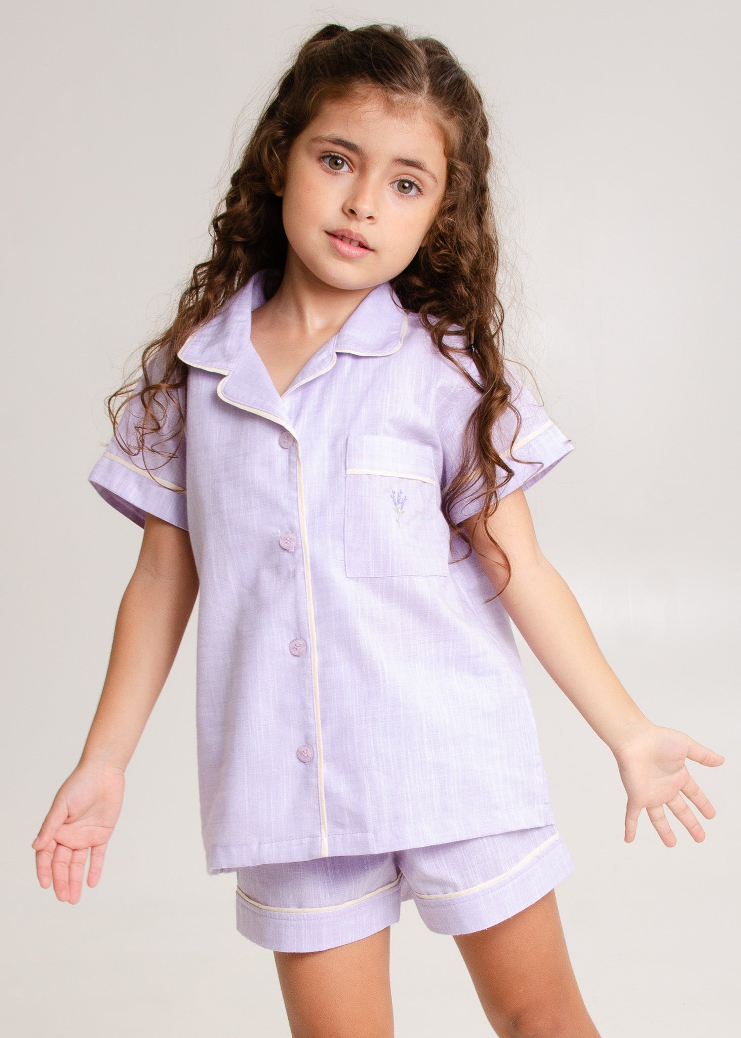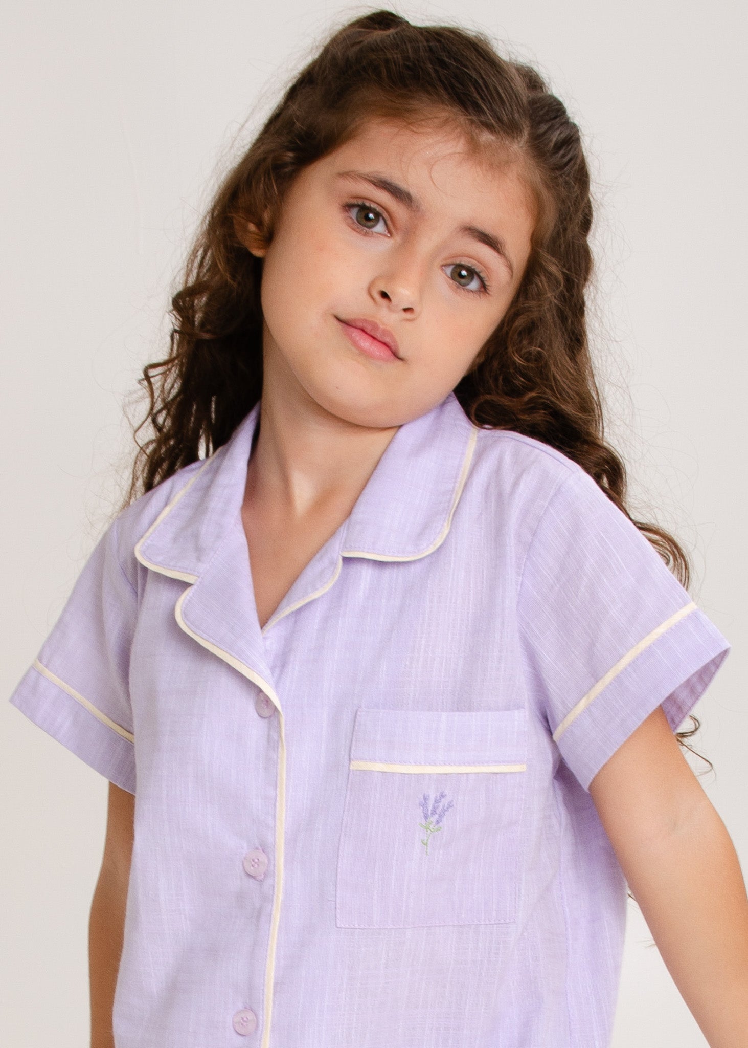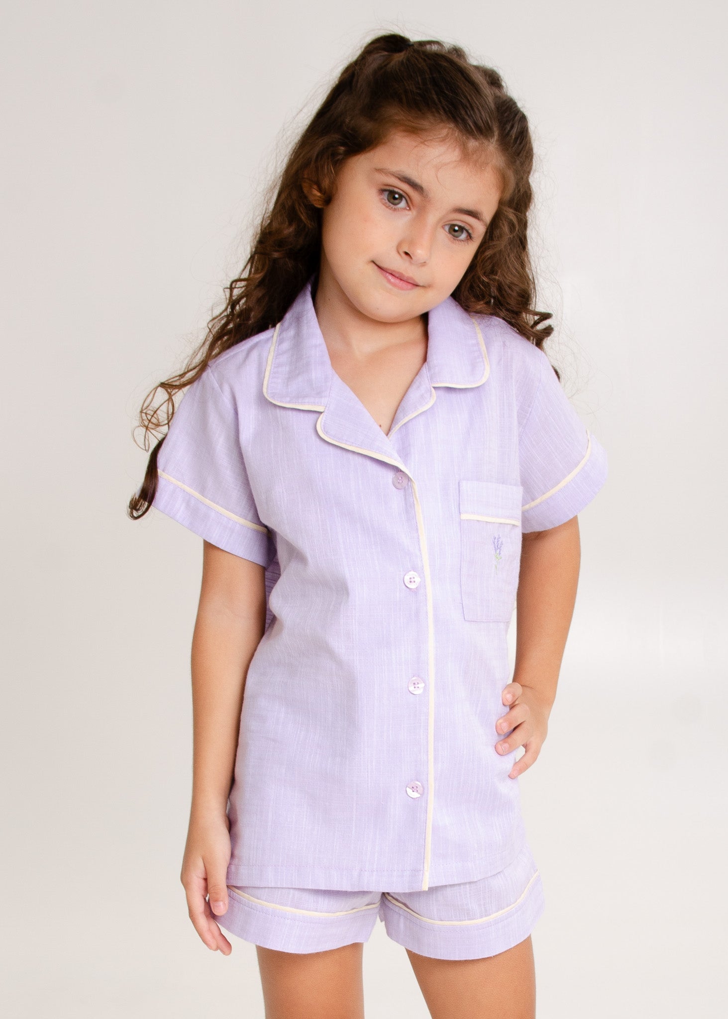 Pijama infantil feminino, em tecido 100% algodão, botões personalizados, e a delicadeza do mini bordado de lavanda no bolsinho. Blusa abotoada, com gola e mangas curtas. Short com elástico na cintura.