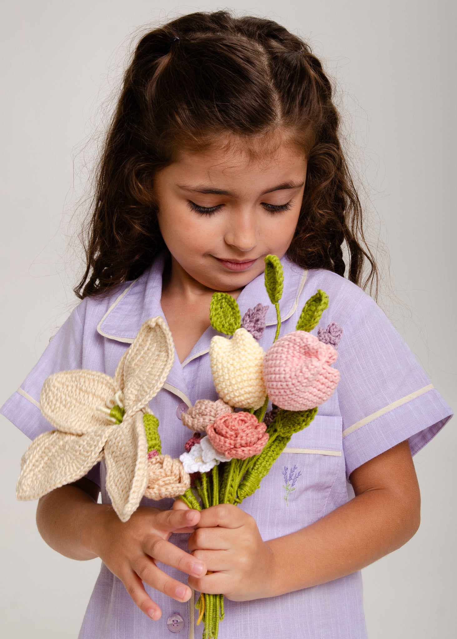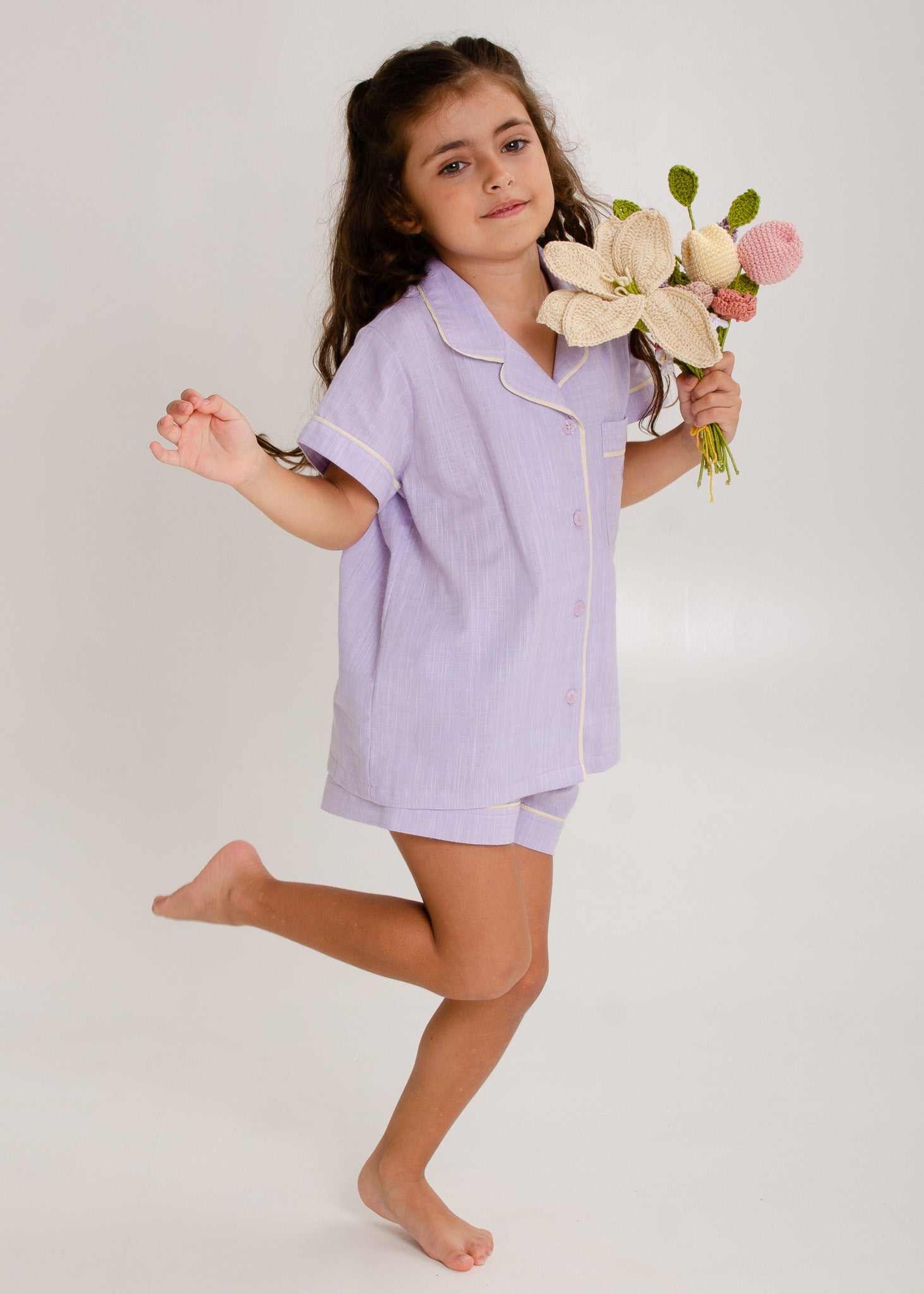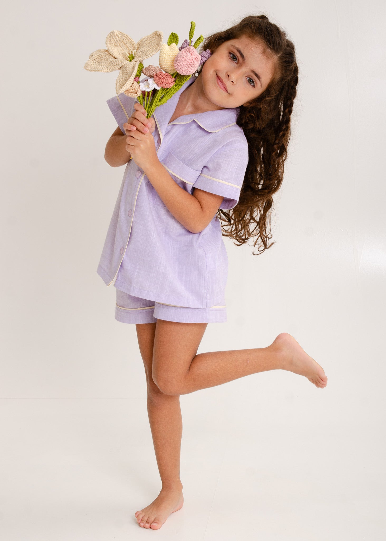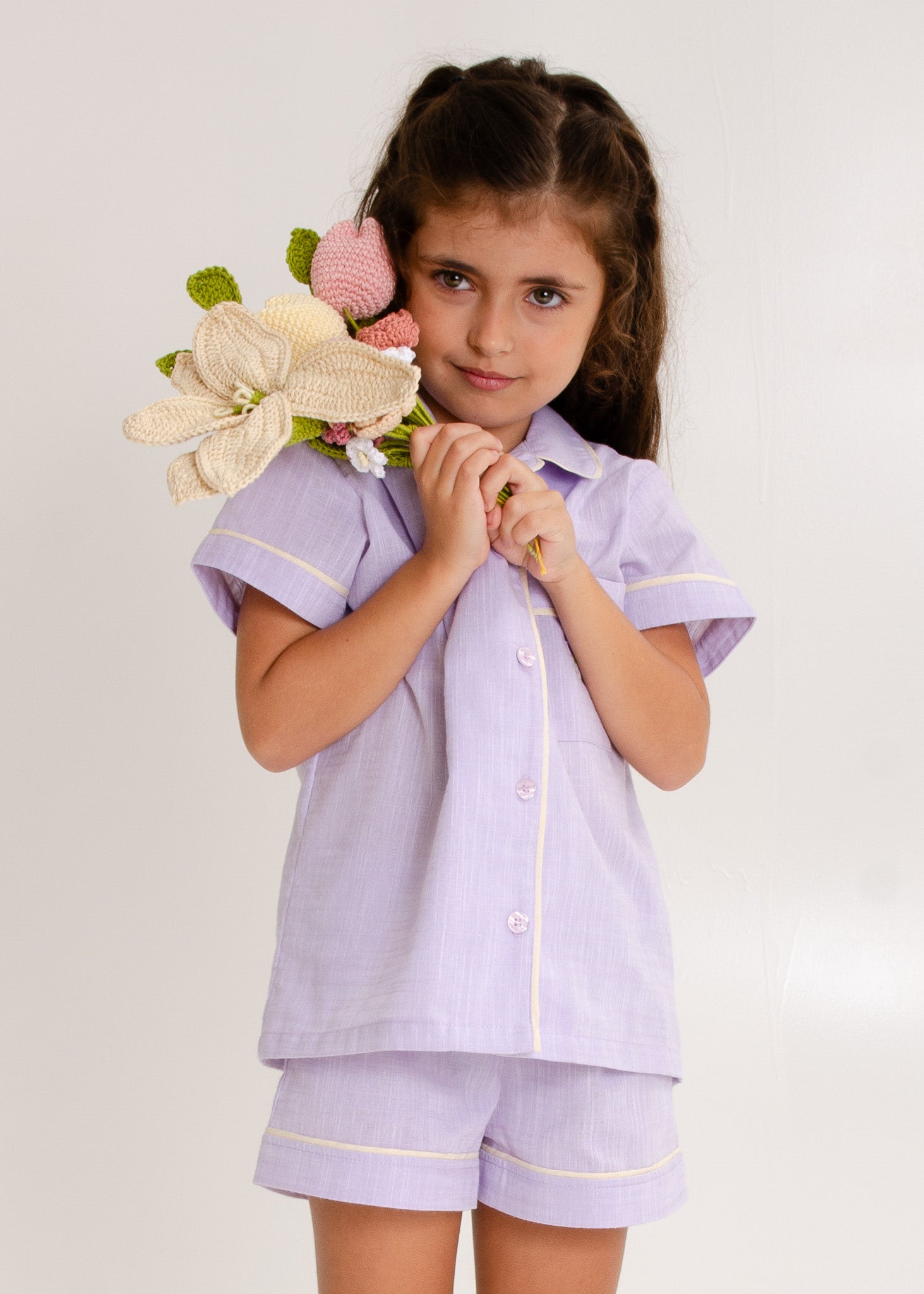 Pijama infantil feminino, em tecido 100% algodão, botões personalizados, e a delicadeza do mini bordado de lavanda no bolsinho. Blusa abotoada, com gola e mangas curtas. Short com elástico na cintura.