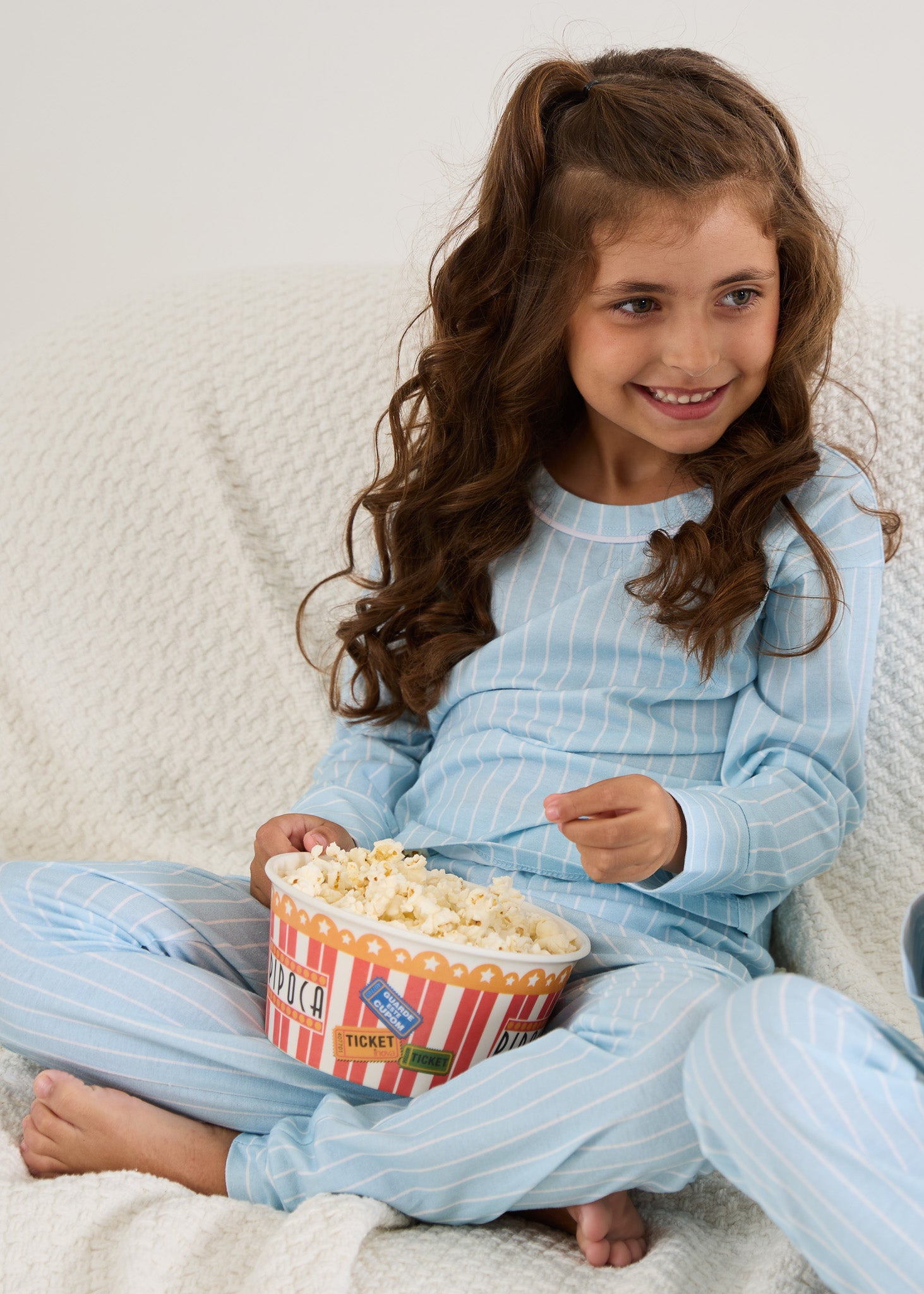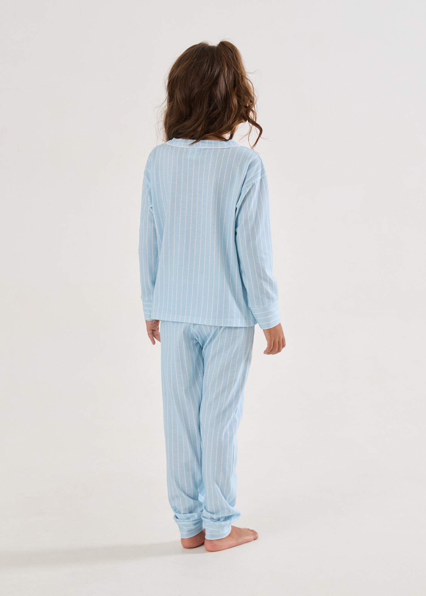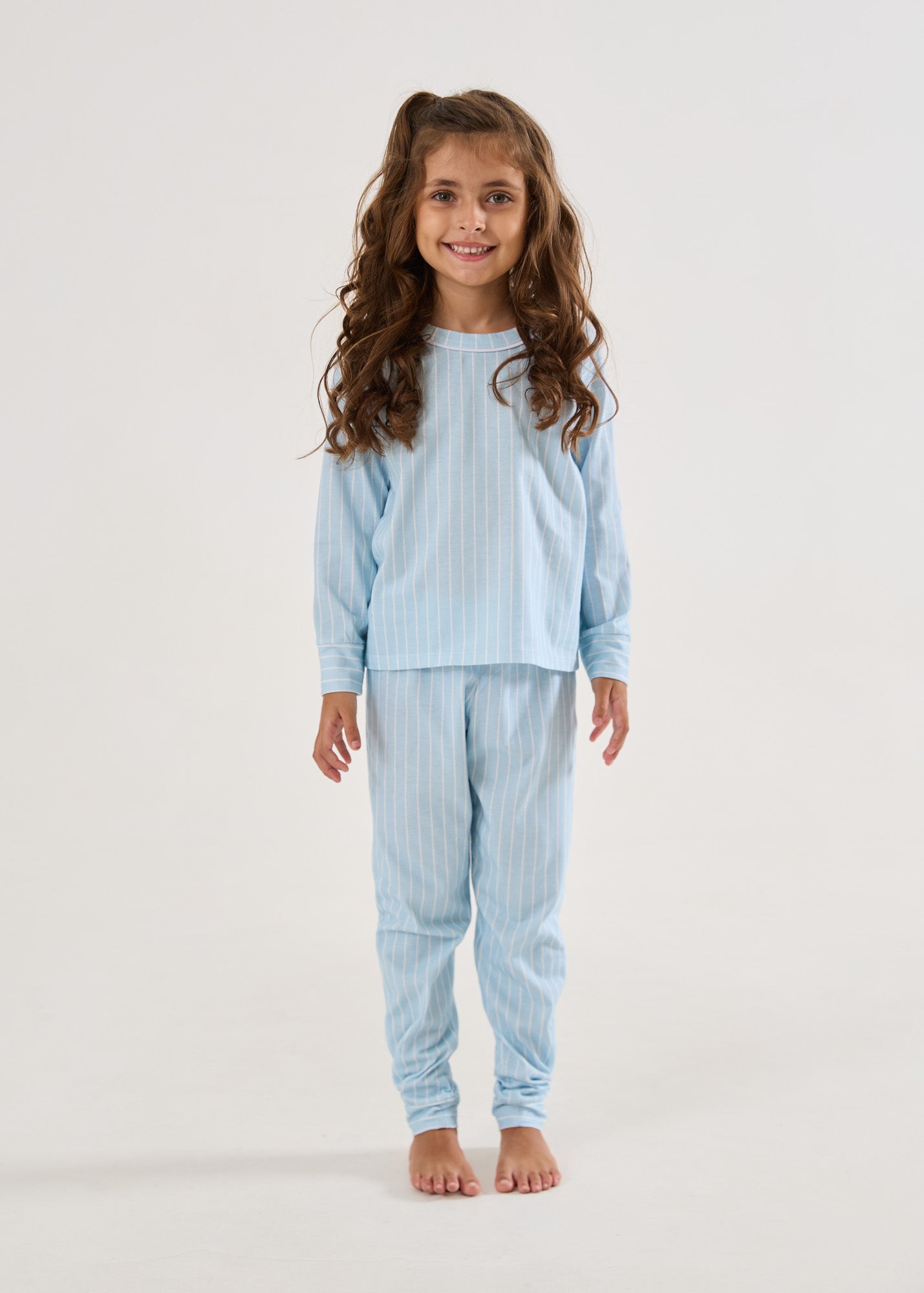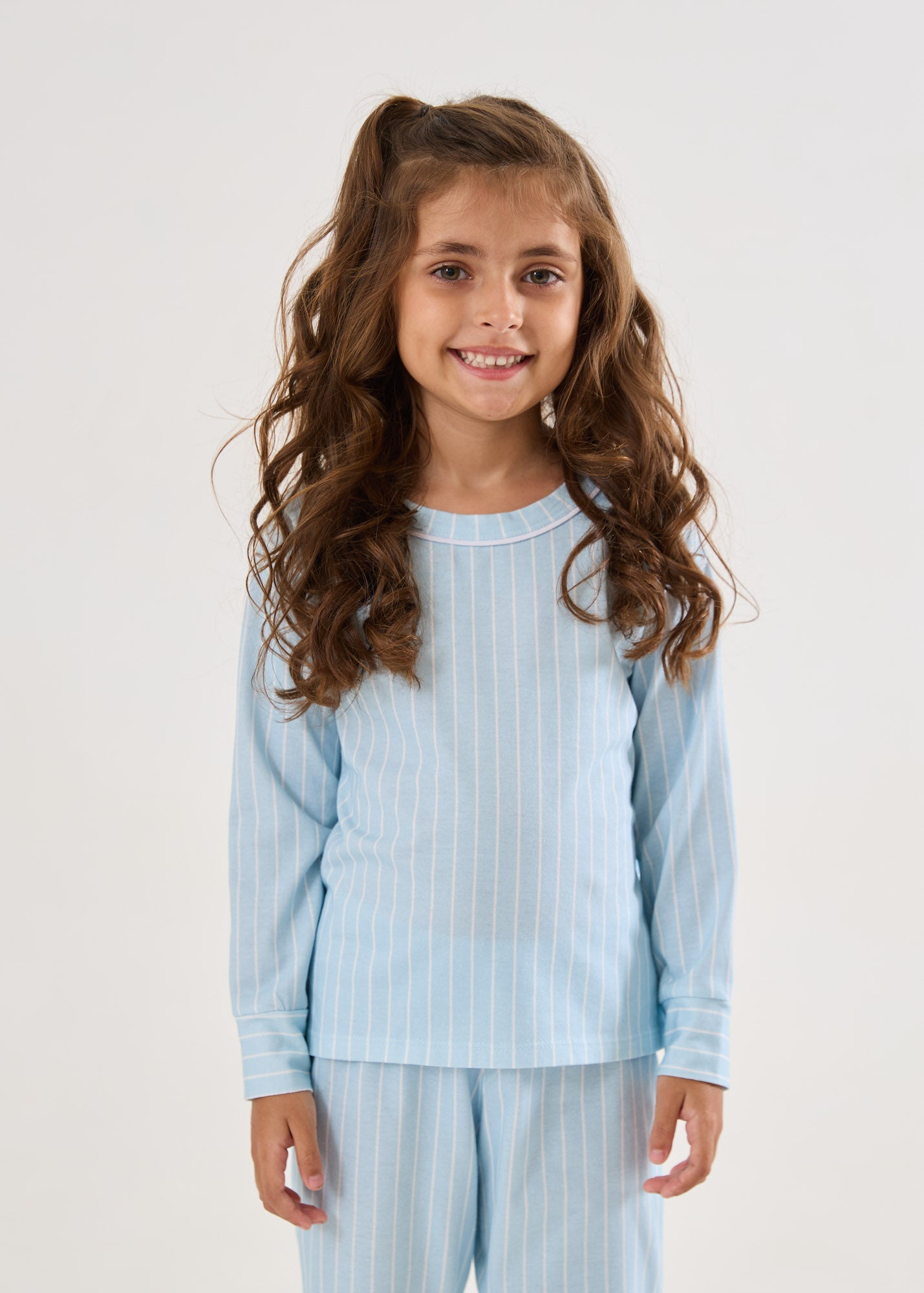 Pijama longo infantil, em malha ultrasoft 100% algodão, listrado em azul clarinho e branco. Pijama infantil modelo de calça com elástico na cintura, blusa mangas longas e gola redonda.
