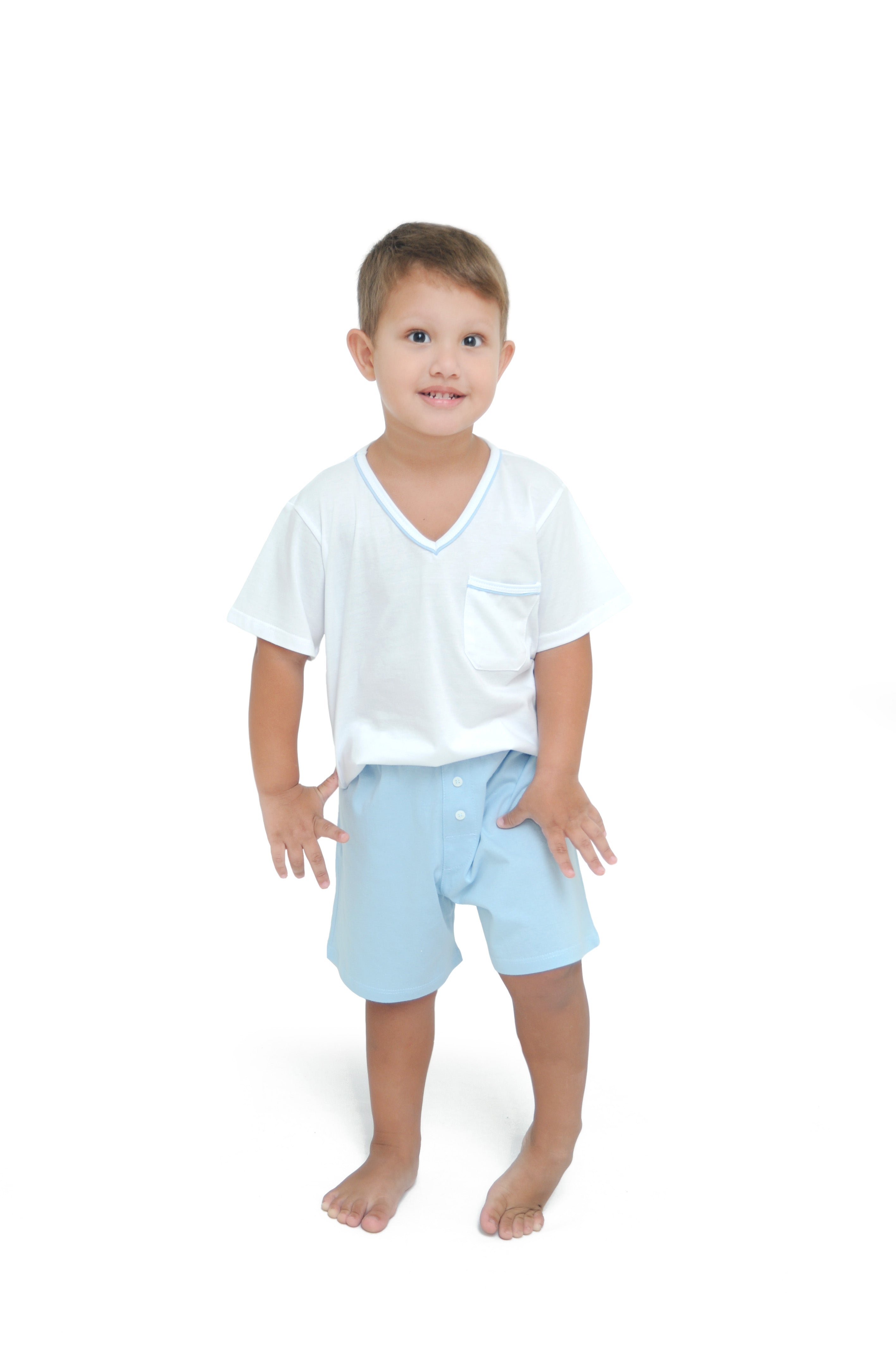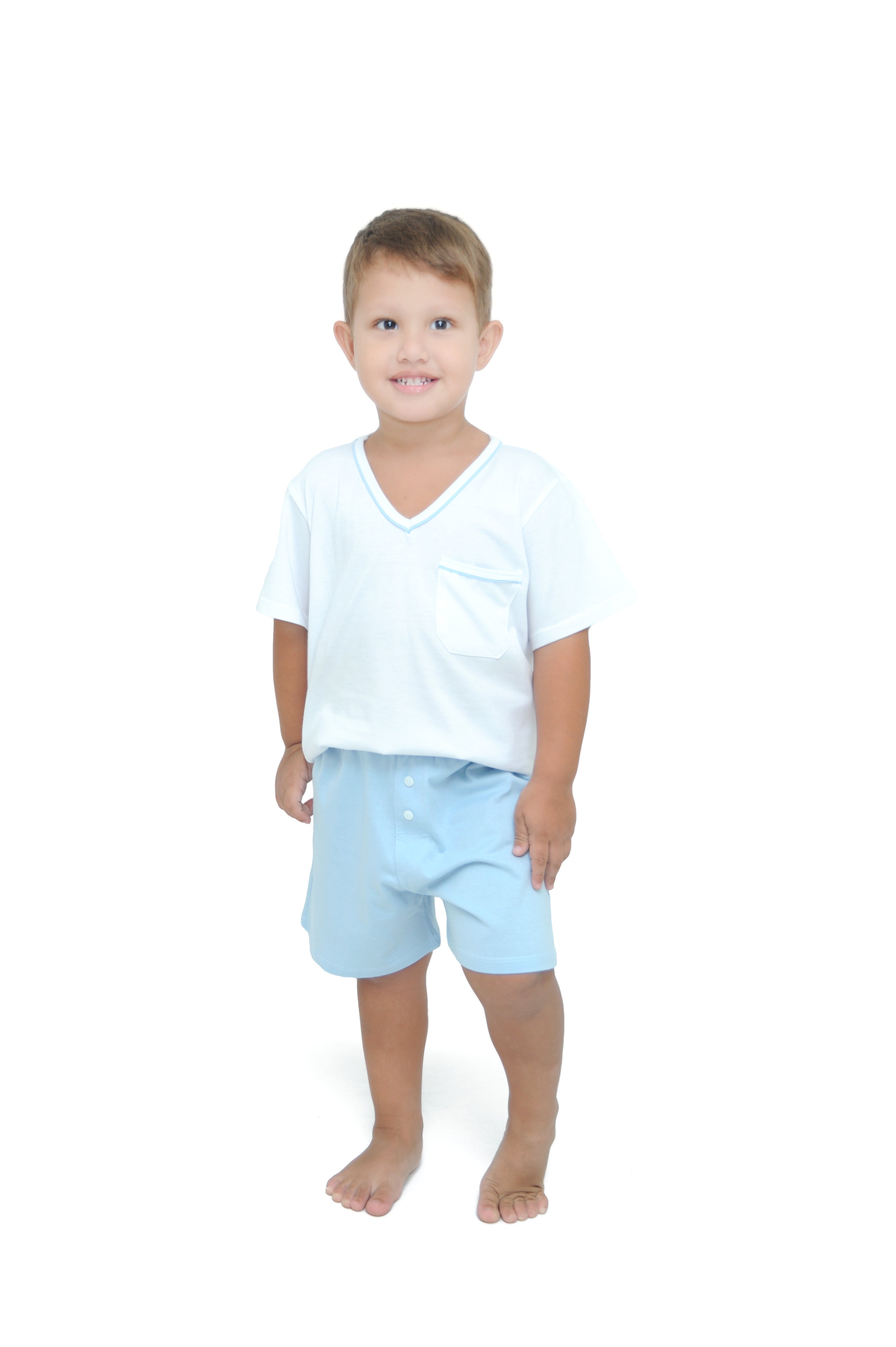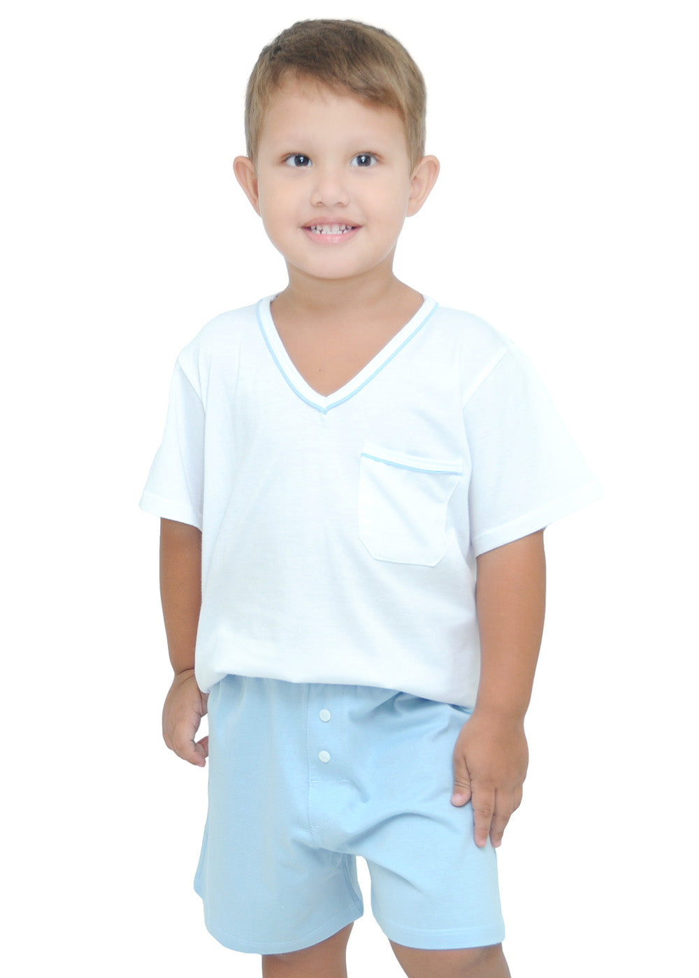 Pijama infantil masculino malha 100% algodão. Modelo básico e confortável com camiseta branca com decote V e detalhe na gola em vivo na cor da bermuda. Bermuda na cor azul clara com elástico no cós.