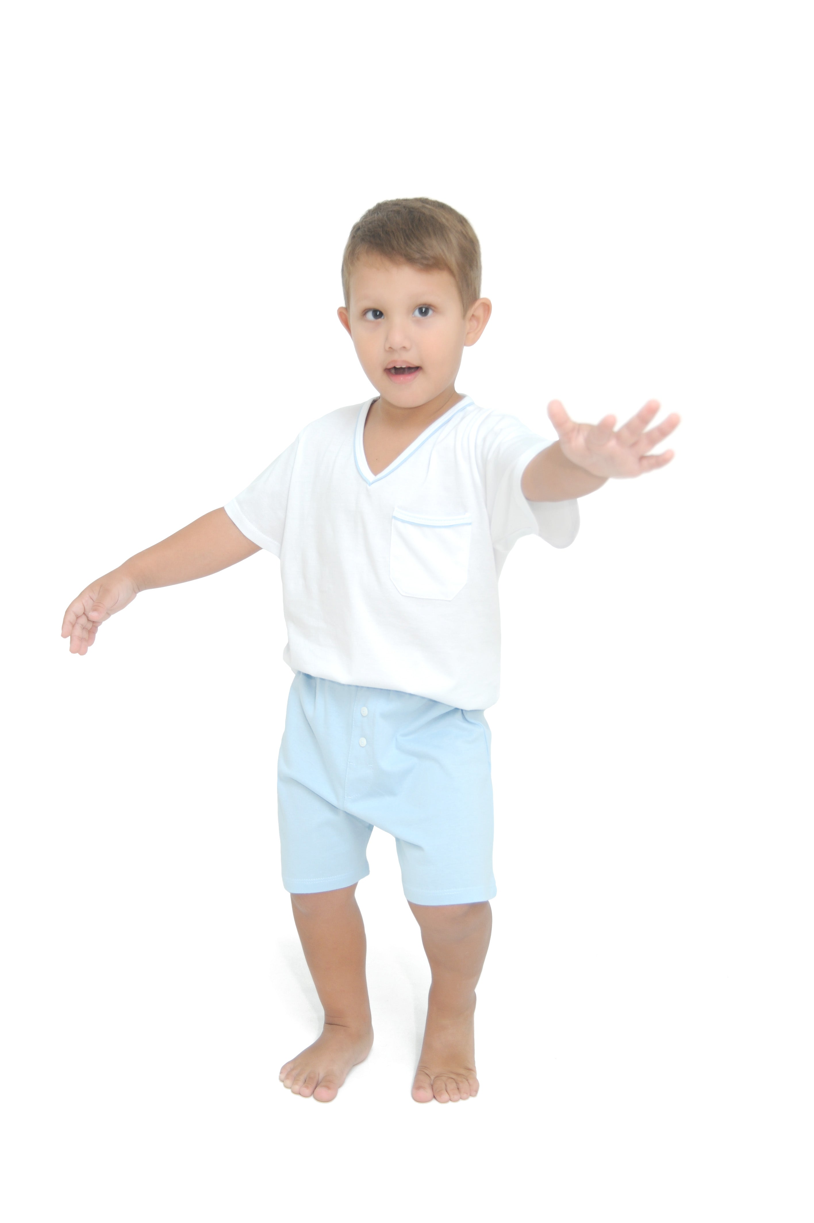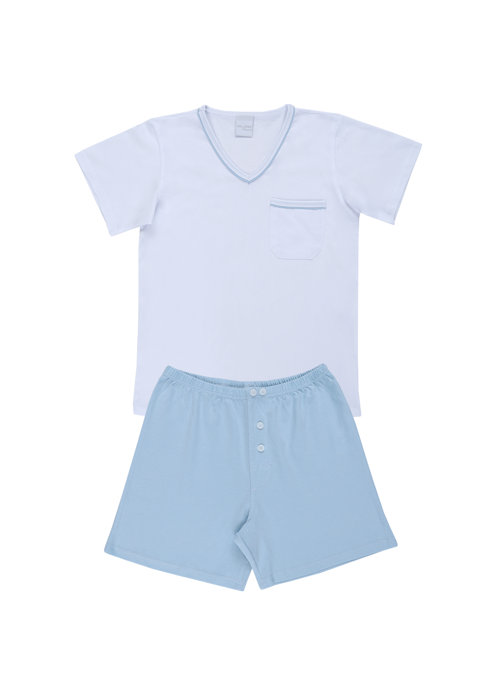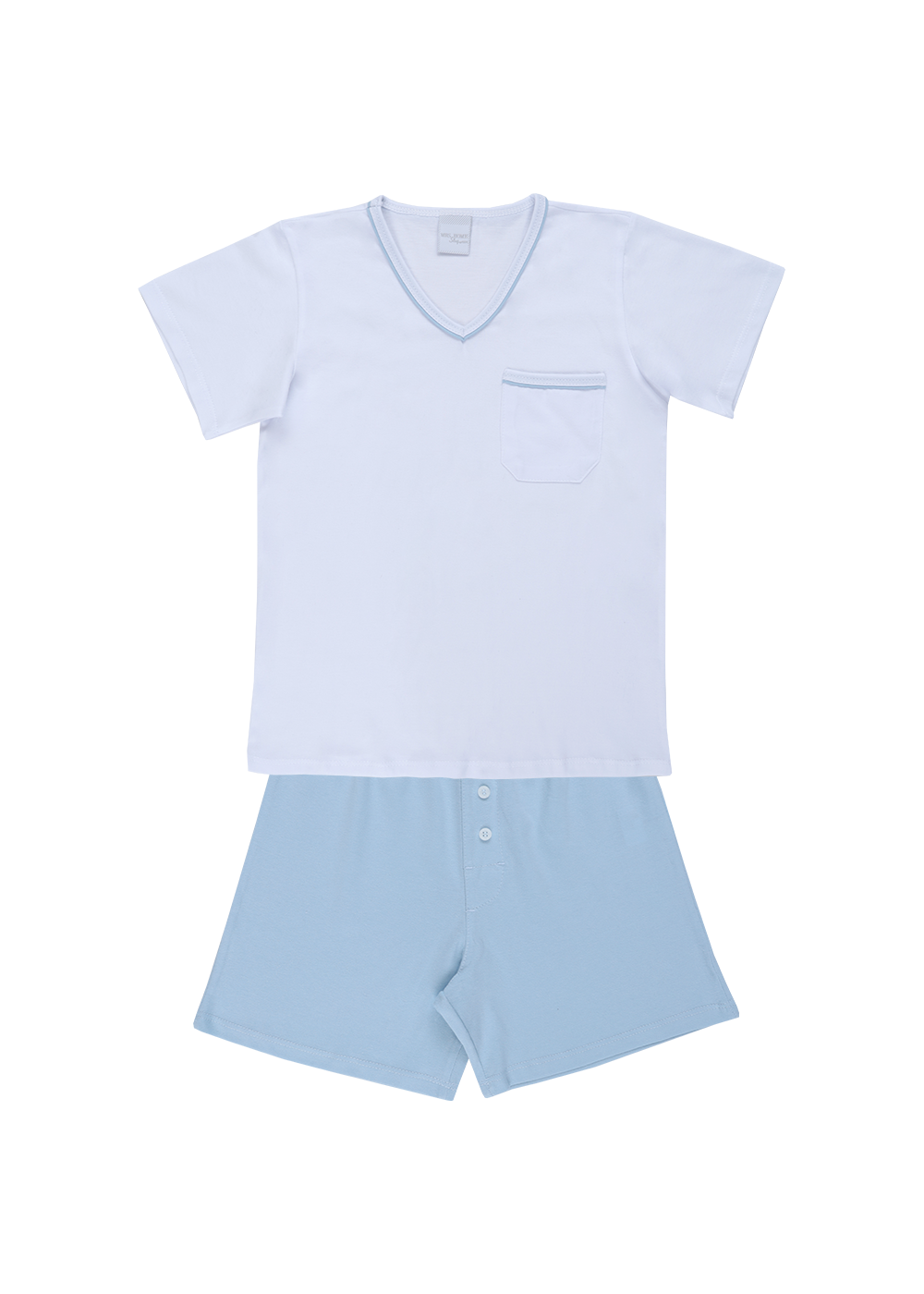 Pijama infantil masculino malha 100% algodão. Modelo básico e confortável com camiseta branca com decote V e detalhe na gola em vivo na cor da bermuda. Bermuda na cor azul clara com elástico no cós.