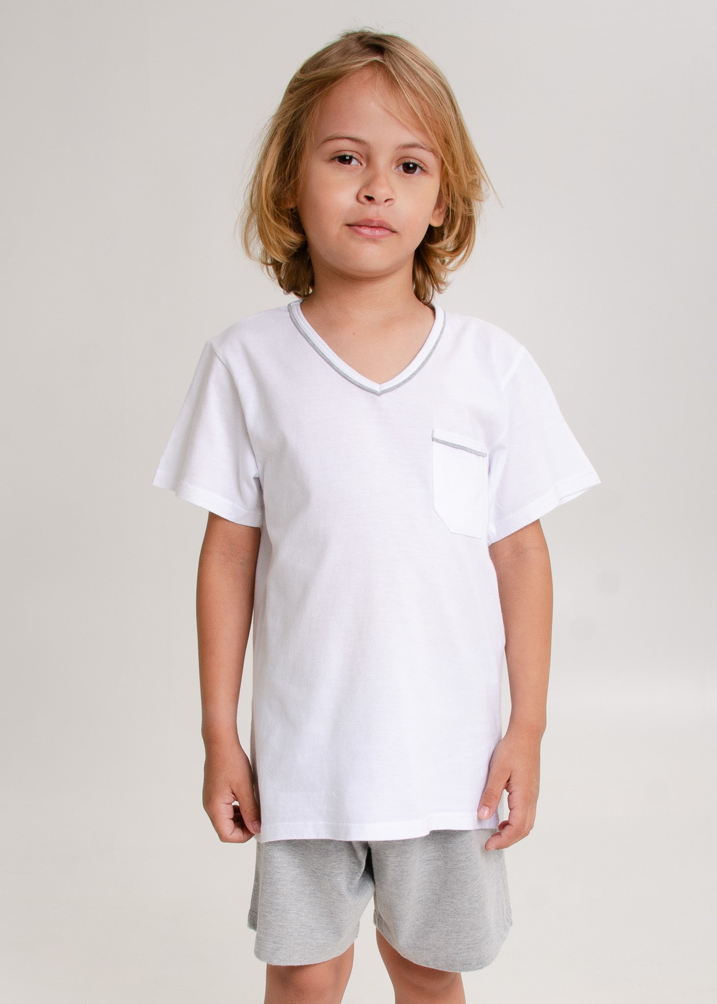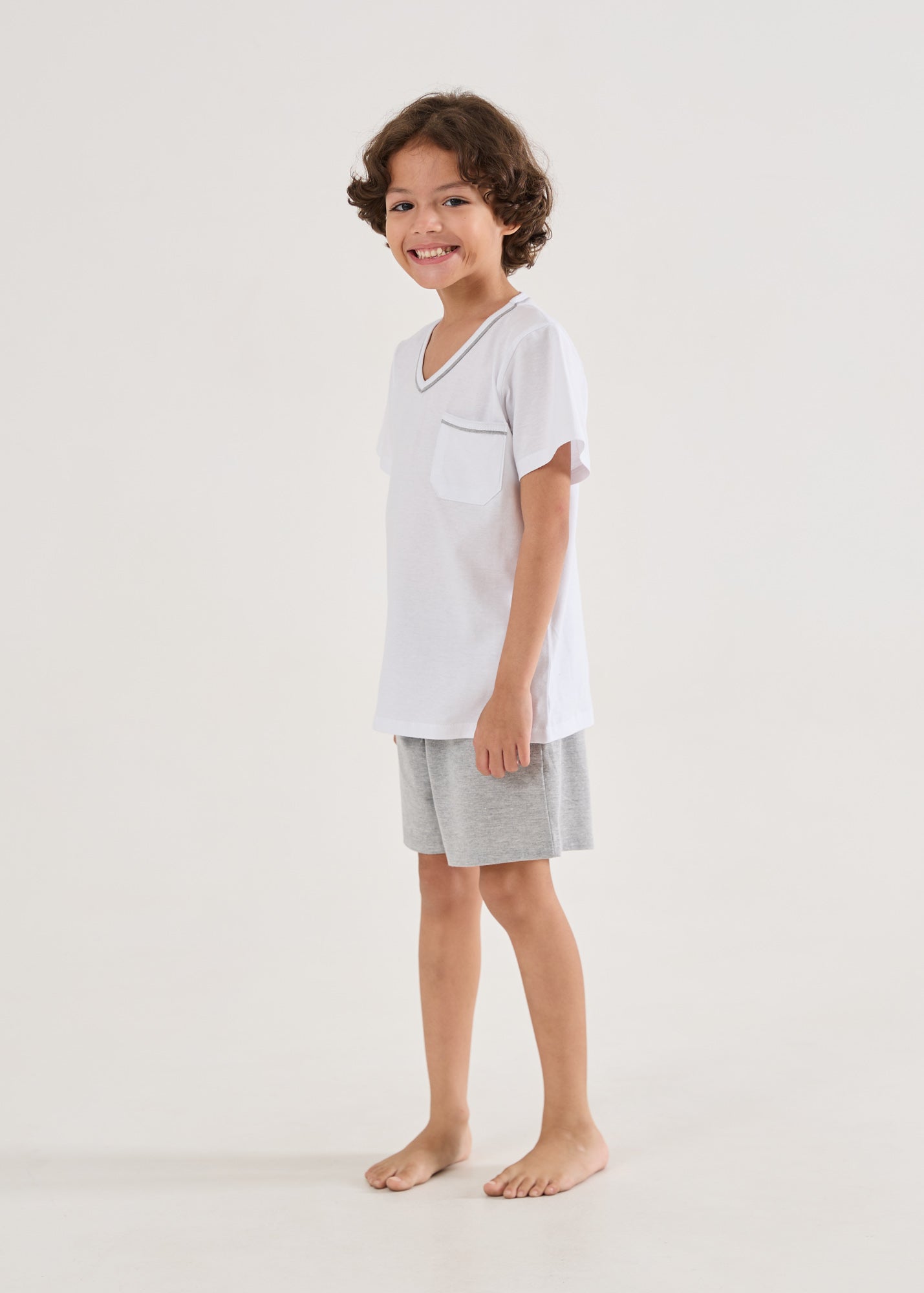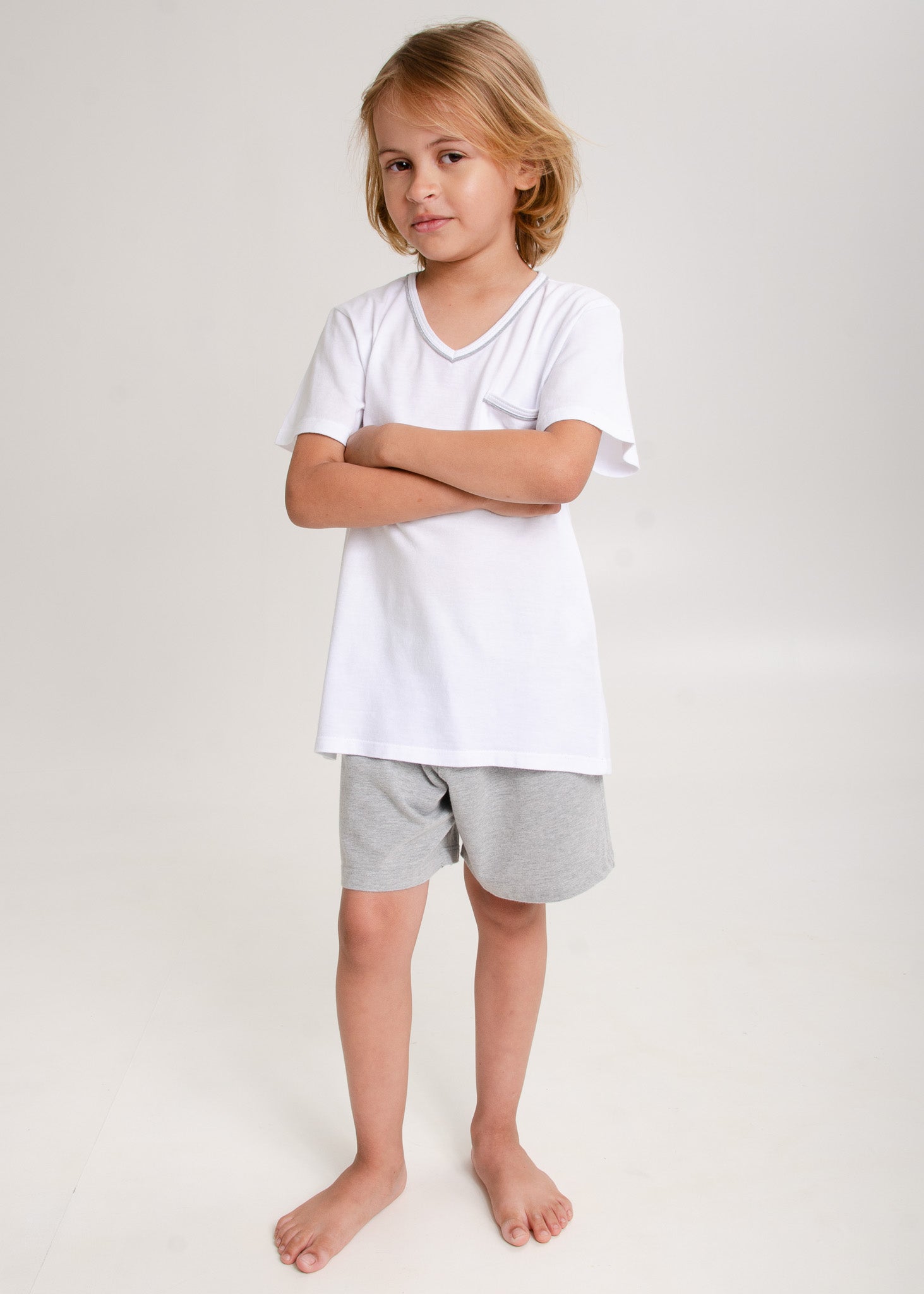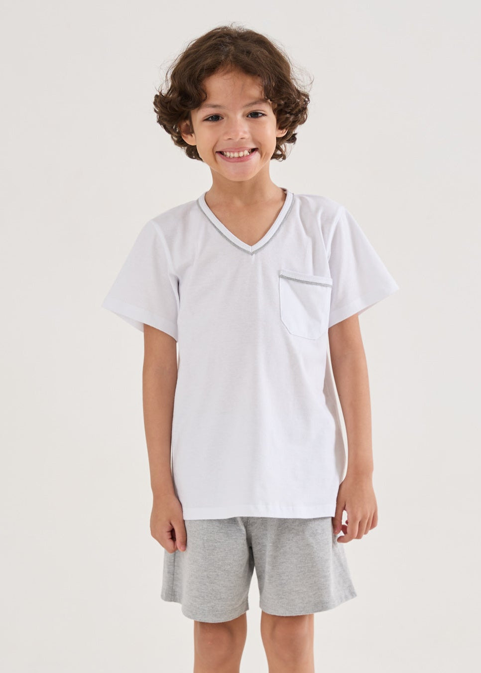Pijama infantil masculino malha premium. Modelo básico e confortável com camiseta branca com decote V e detalhe na gola em vivo na cor da bermuda.