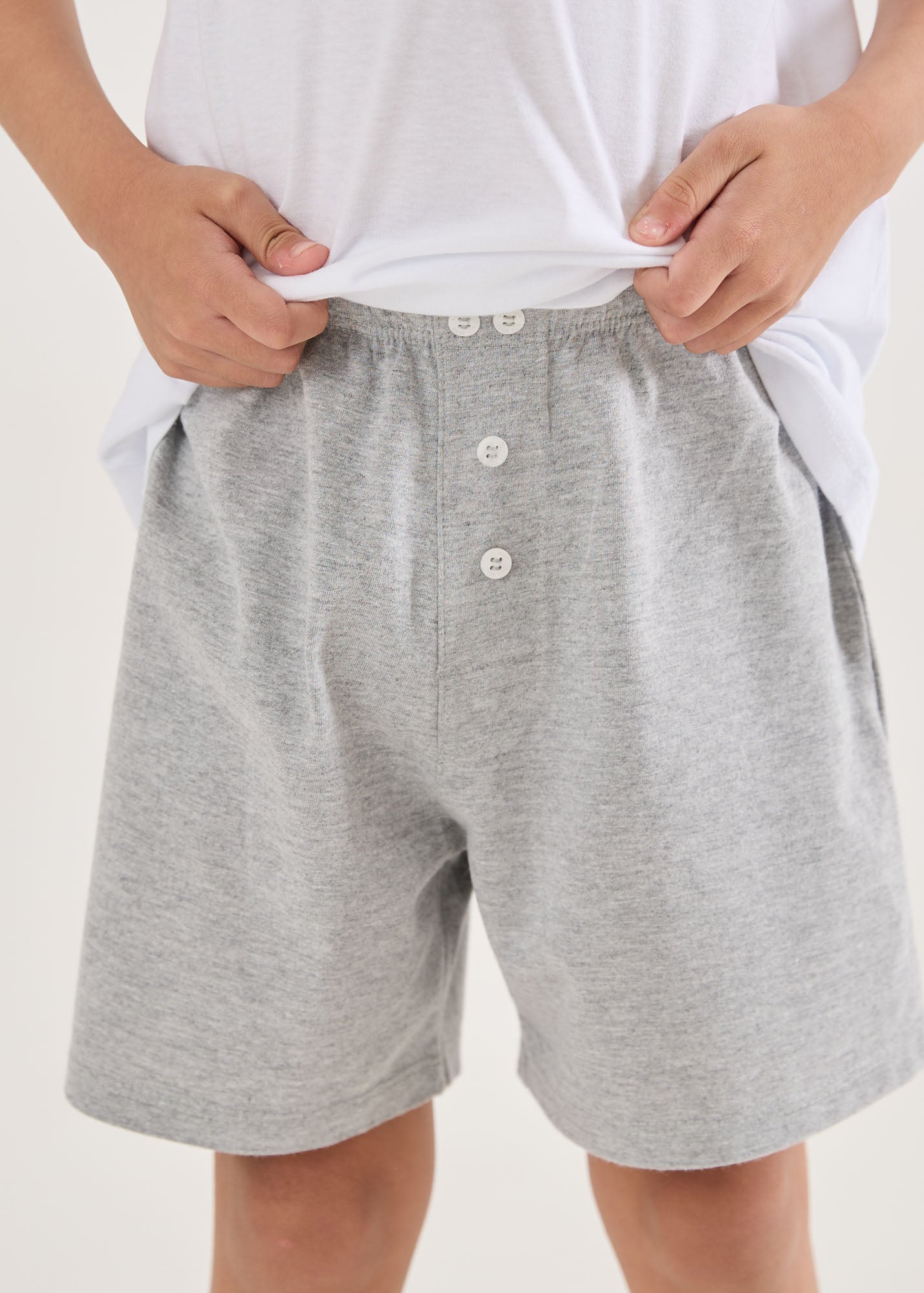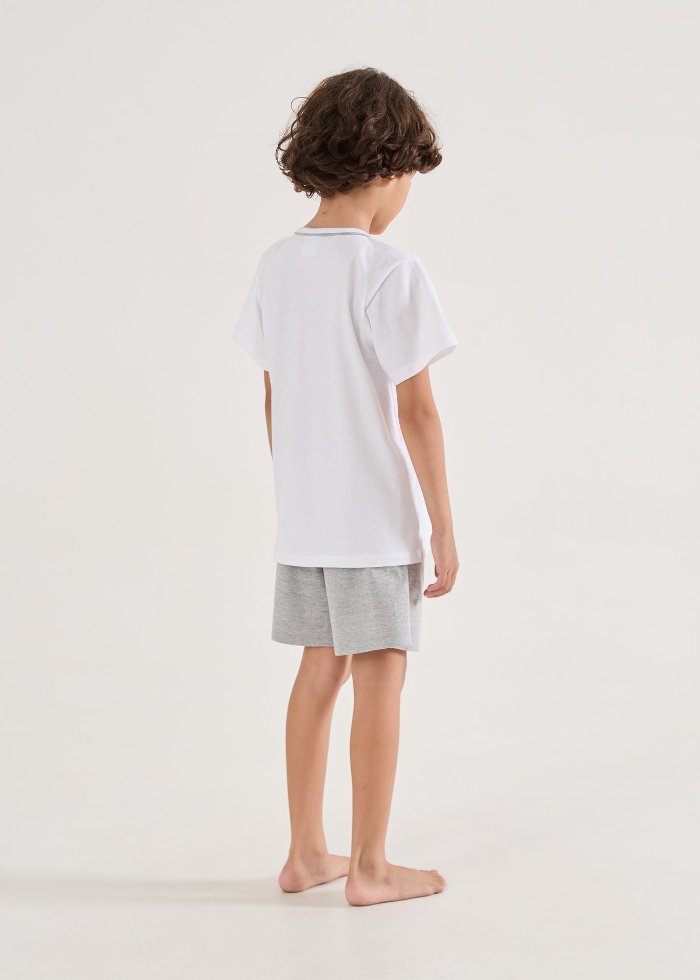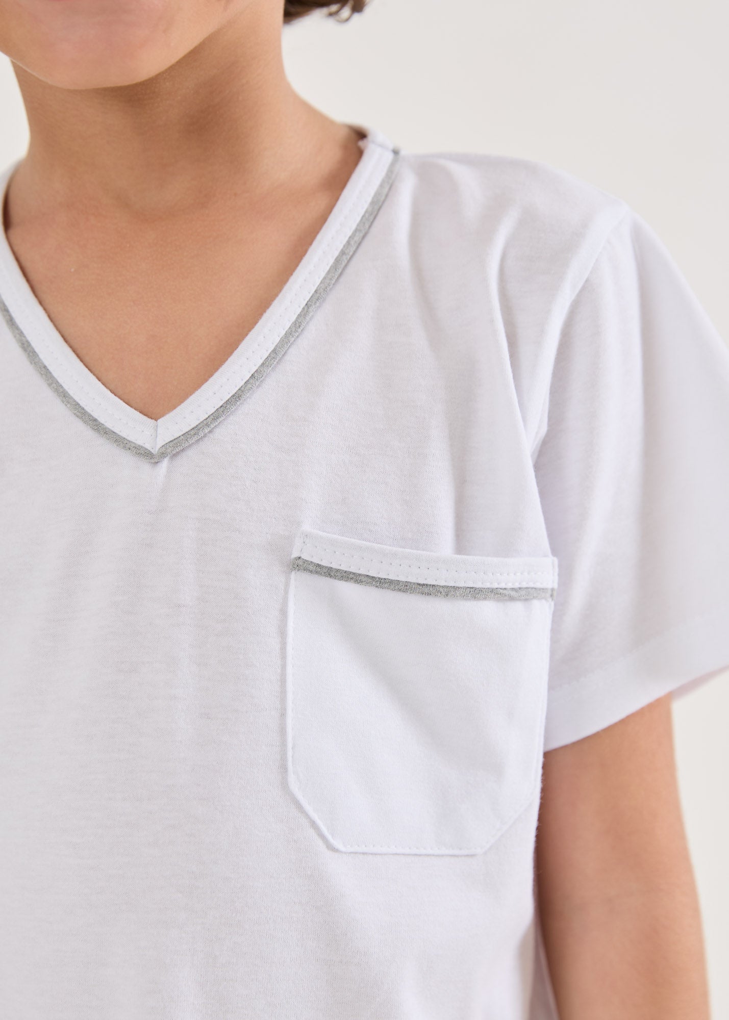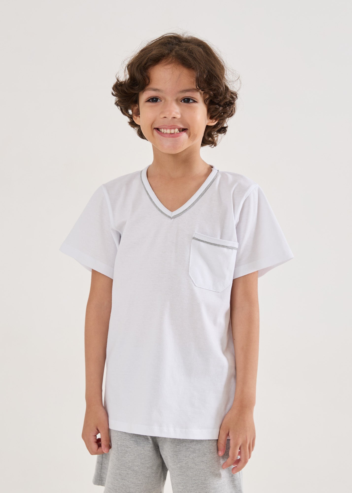 Pijama infantil masculino malha premium. Modelo básico e confortável com camiseta branca com decote V e detalhe na gola em vivo na cor da bermuda.