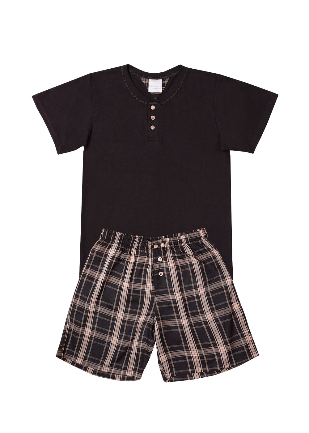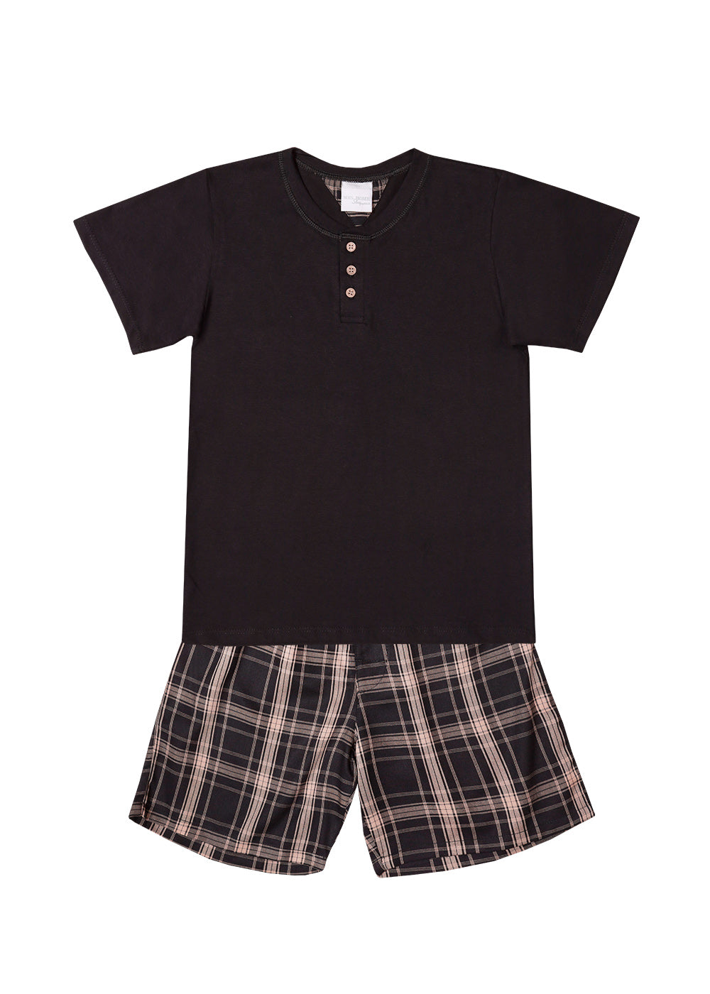 Pijama infantil masculino, modelo bermuda em tecido com toque super macio, elástico na cintura e blusa em malha 100% algodão na cor preta, mangas curtas e gola polo com botões e detalhe xadrez. A padronagem xadrez em tons neutros com fundo preto para combinar com o papai ou a mamãe.