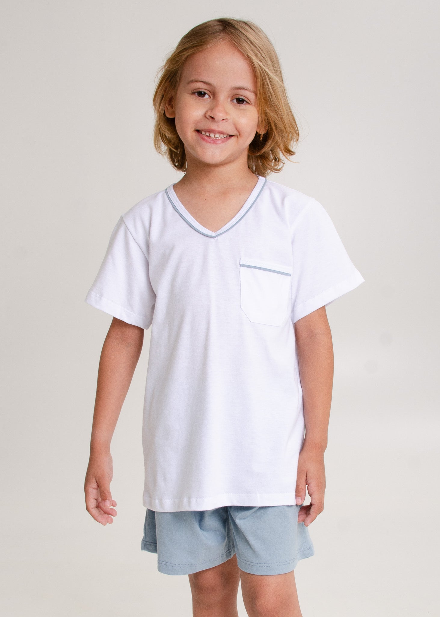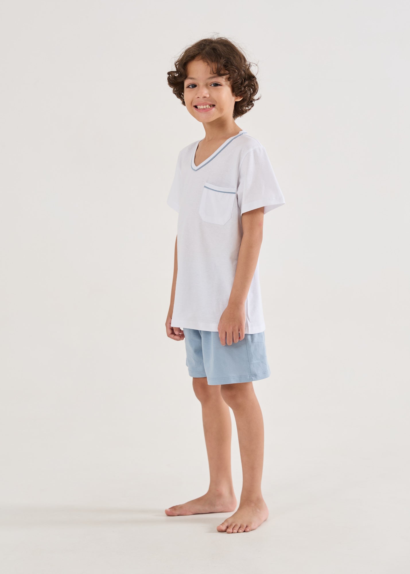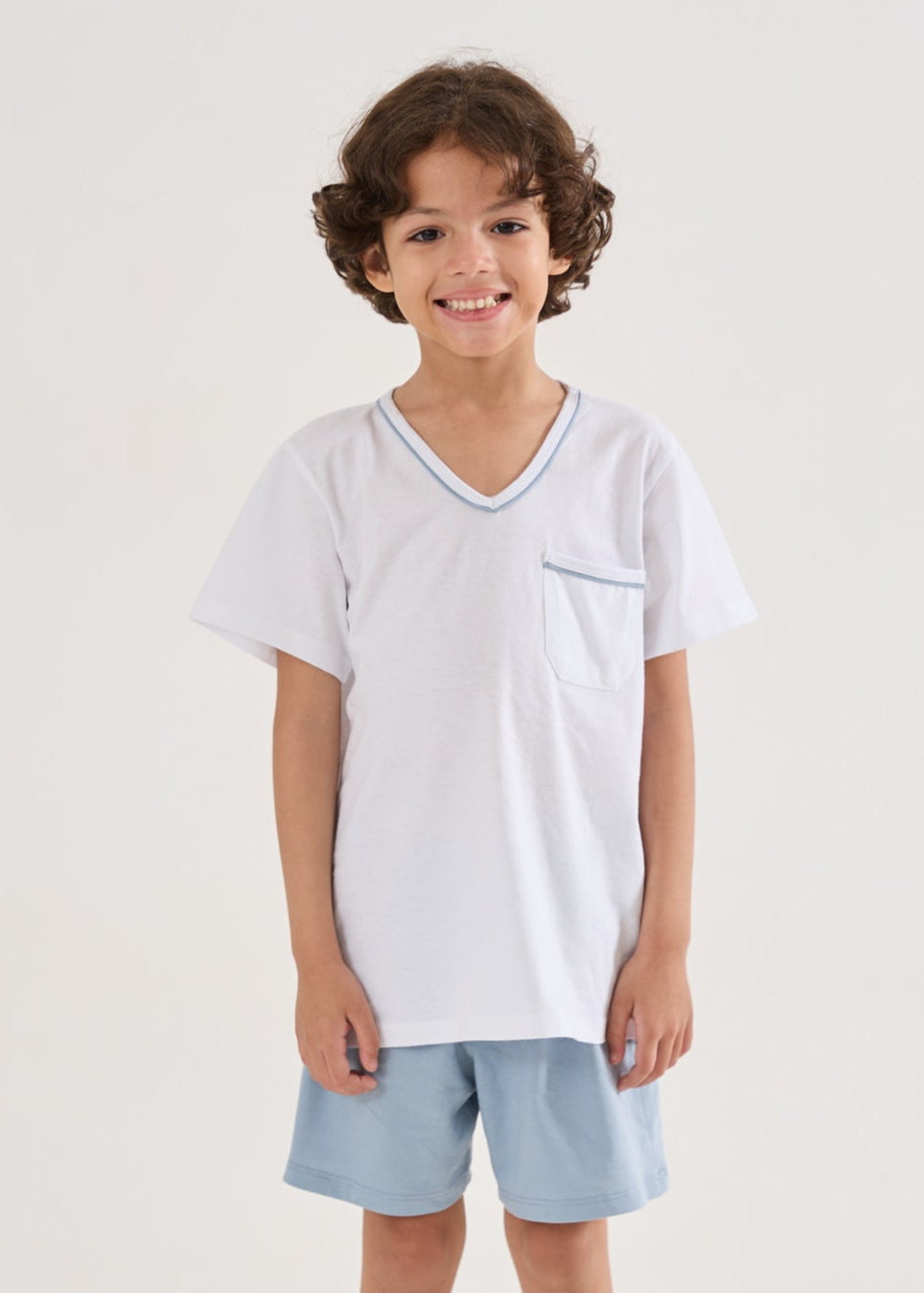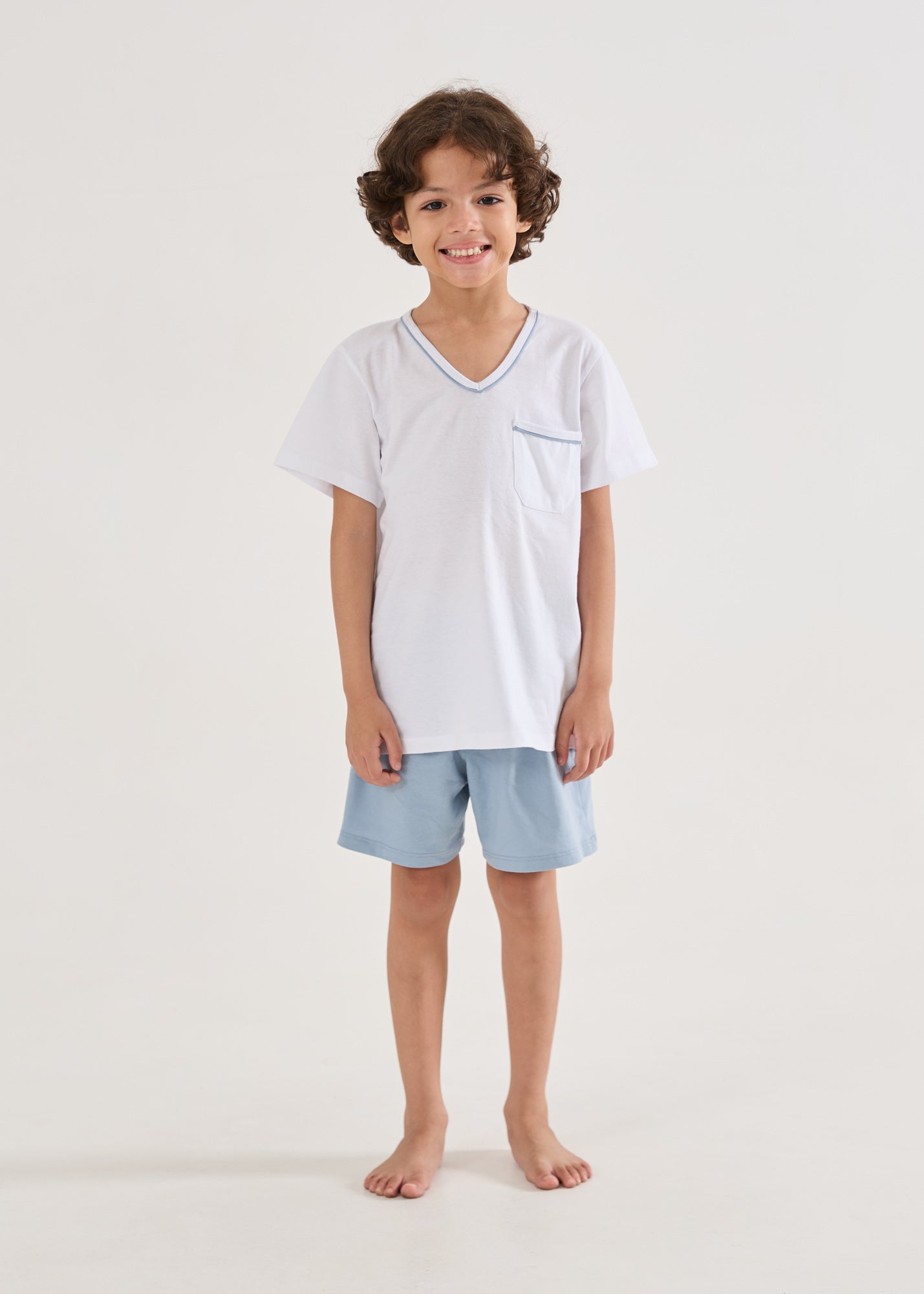 Pijama infantil masculino malha 100% algodão. Modelo básico e confortável com camiseta branca com decote V e detalhe na gola em vivo na cor da bermuda.
