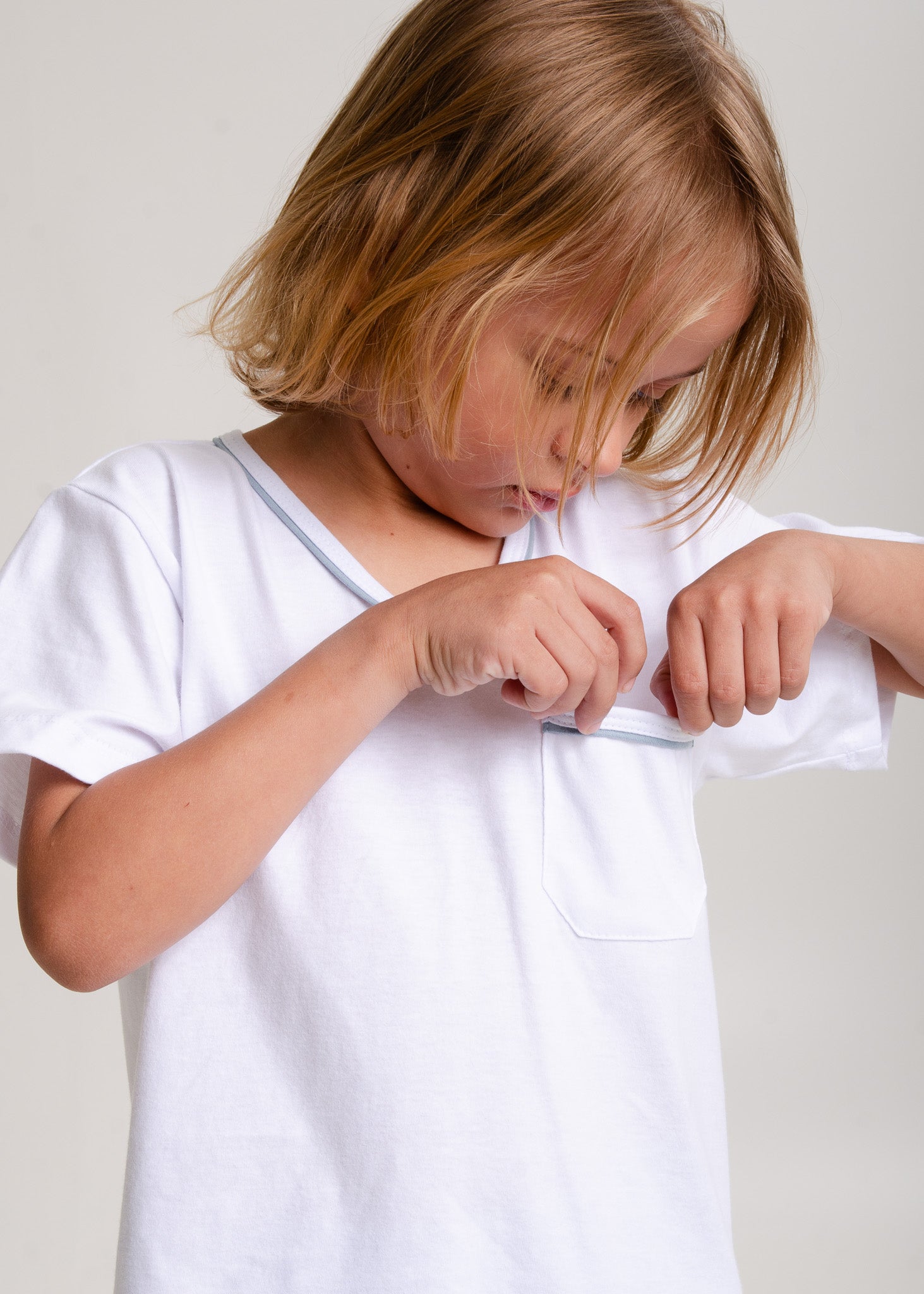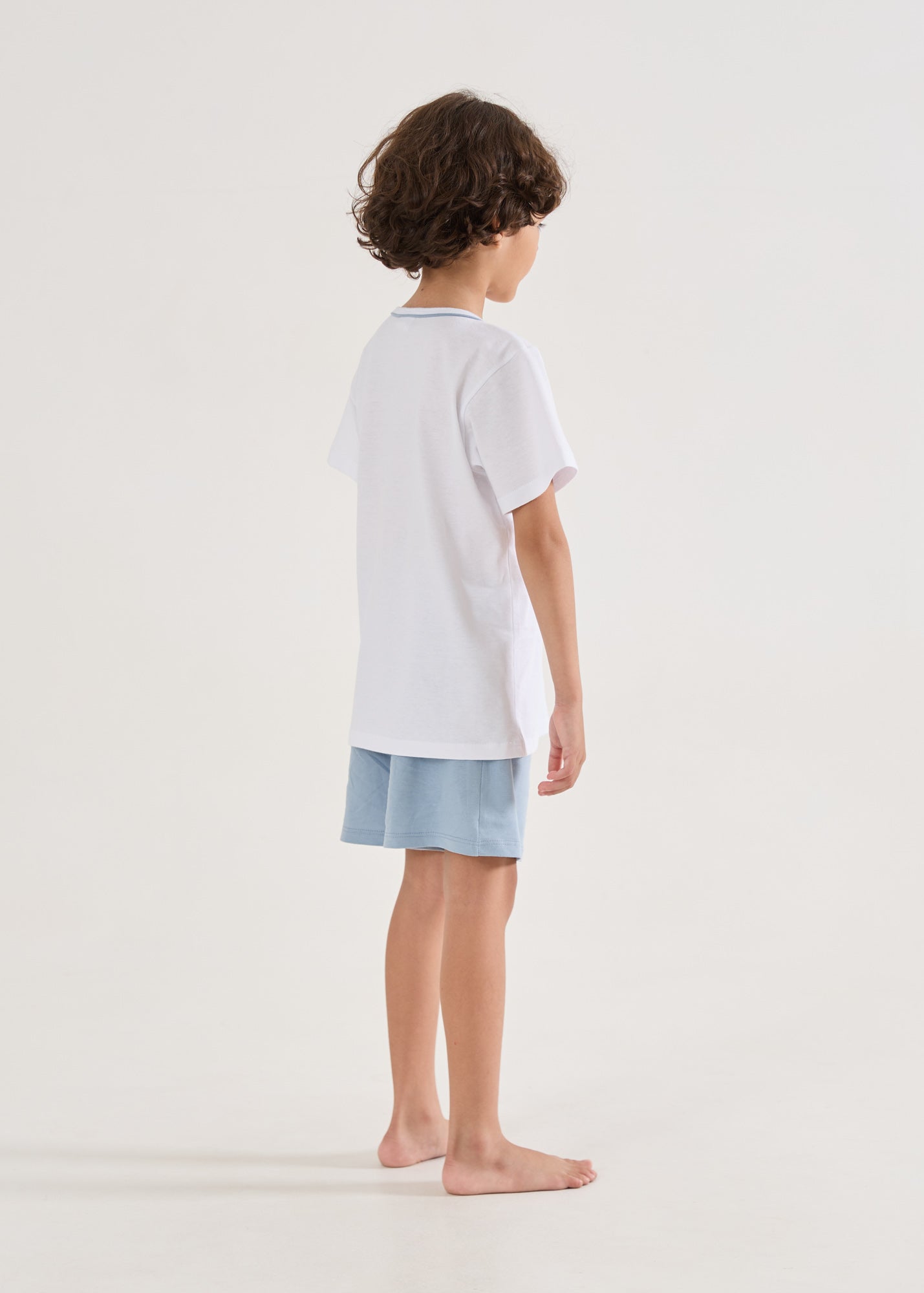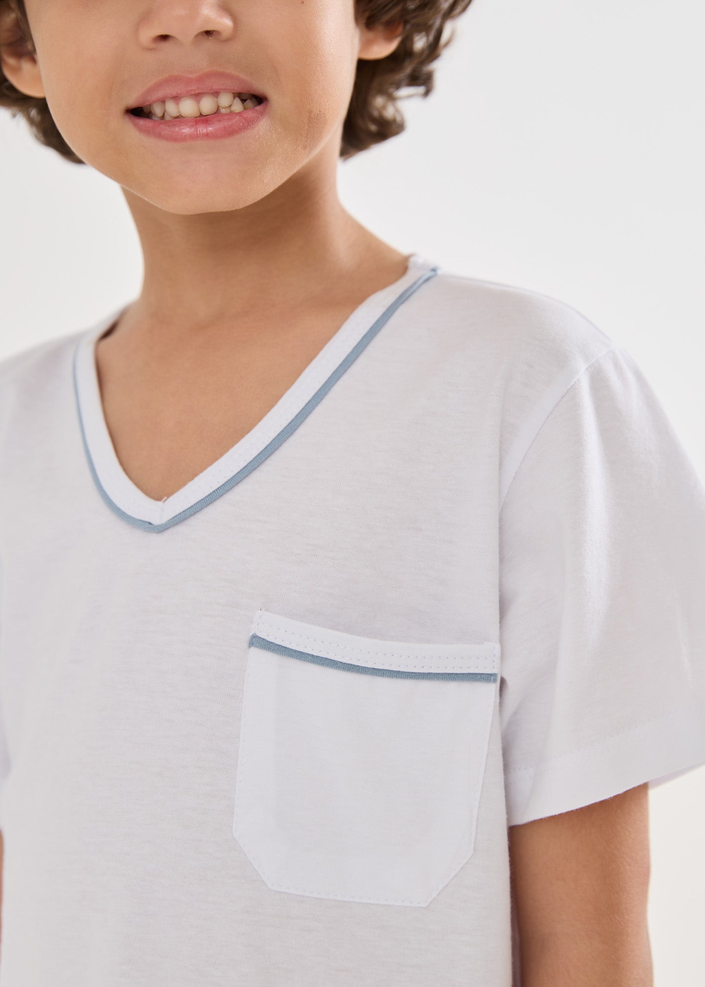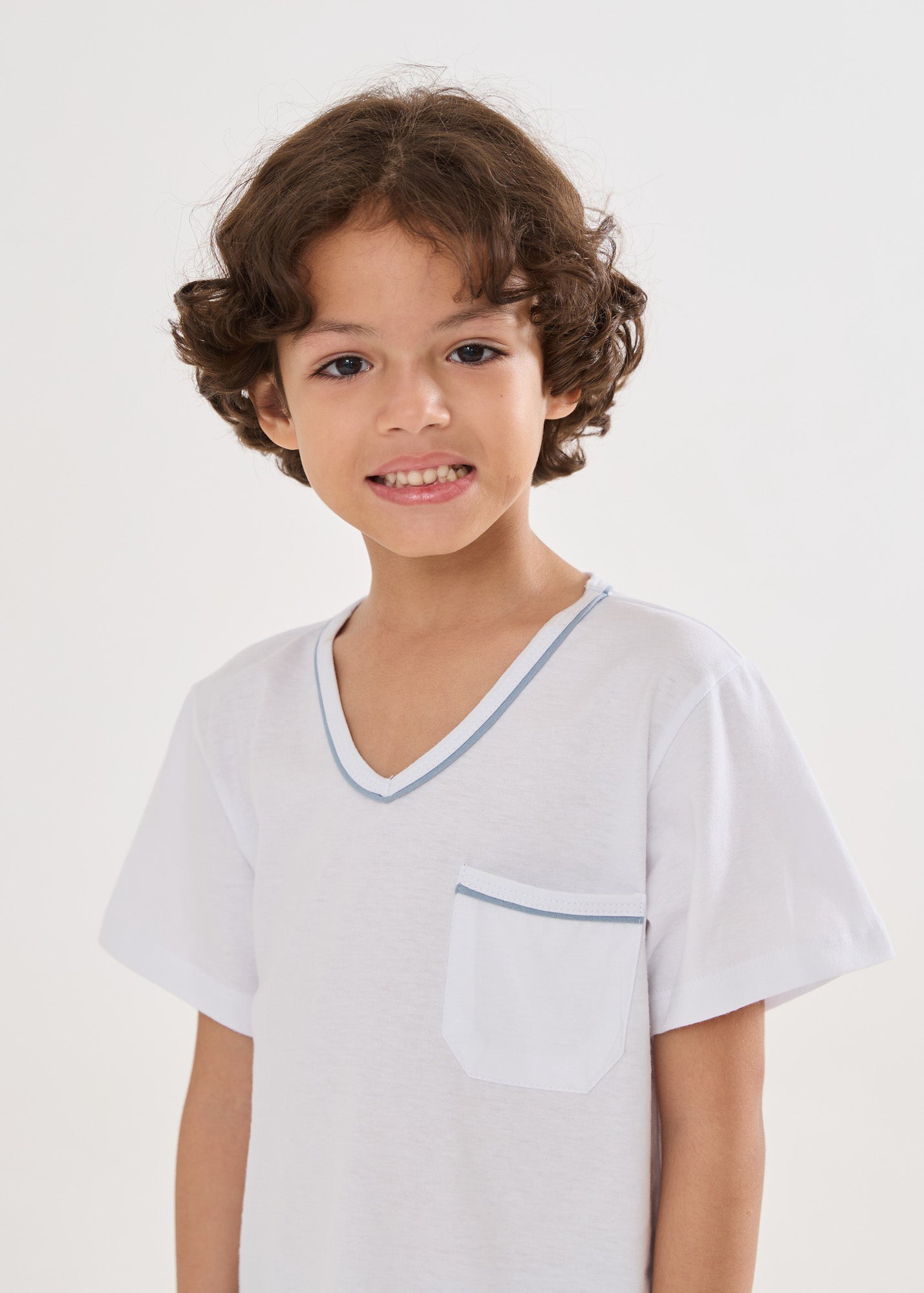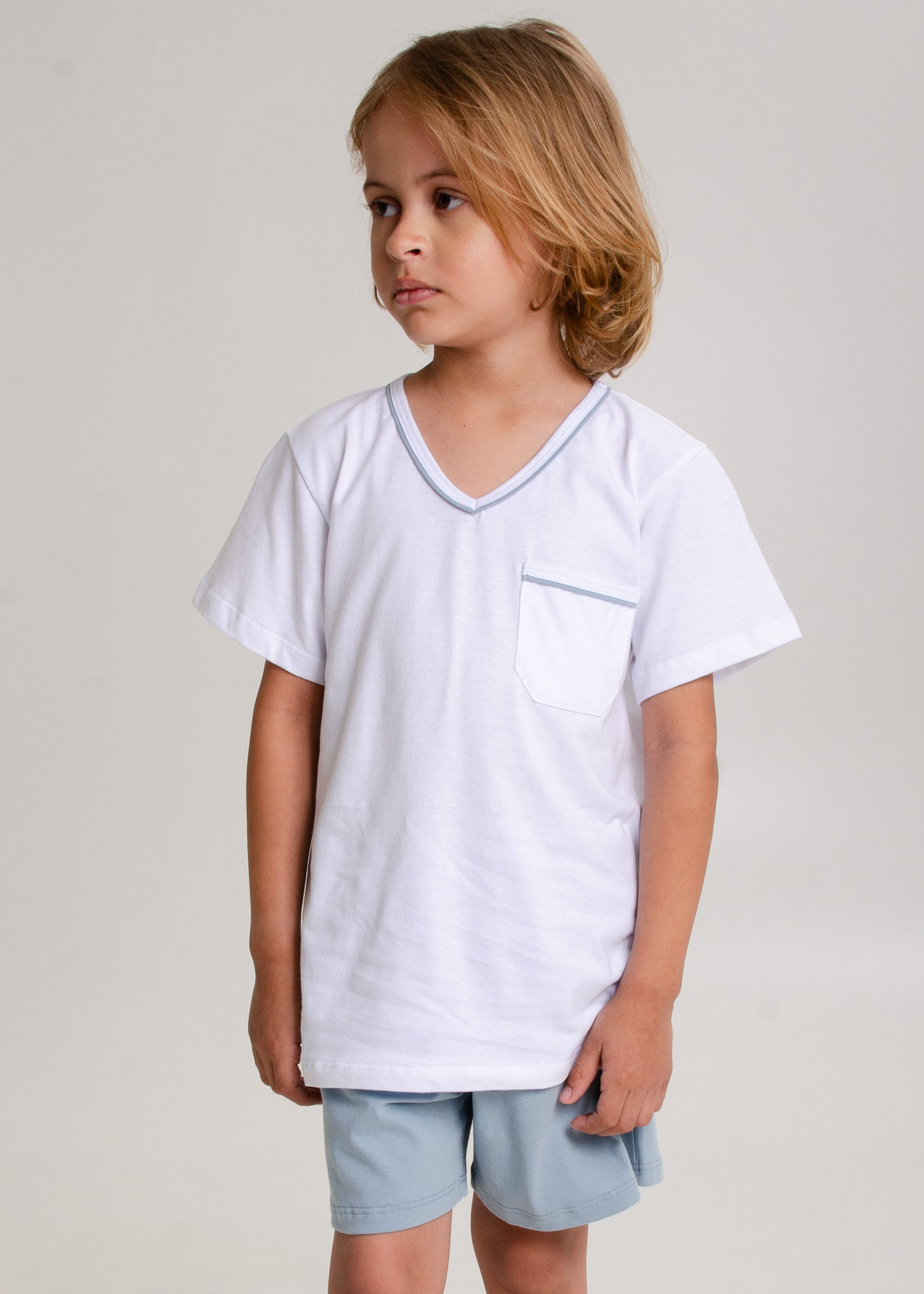 Pijama infantil masculino malha 100% algodão. Modelo básico e confortável com camiseta branca com decote V e detalhe na gola em vivo na cor da bermuda.