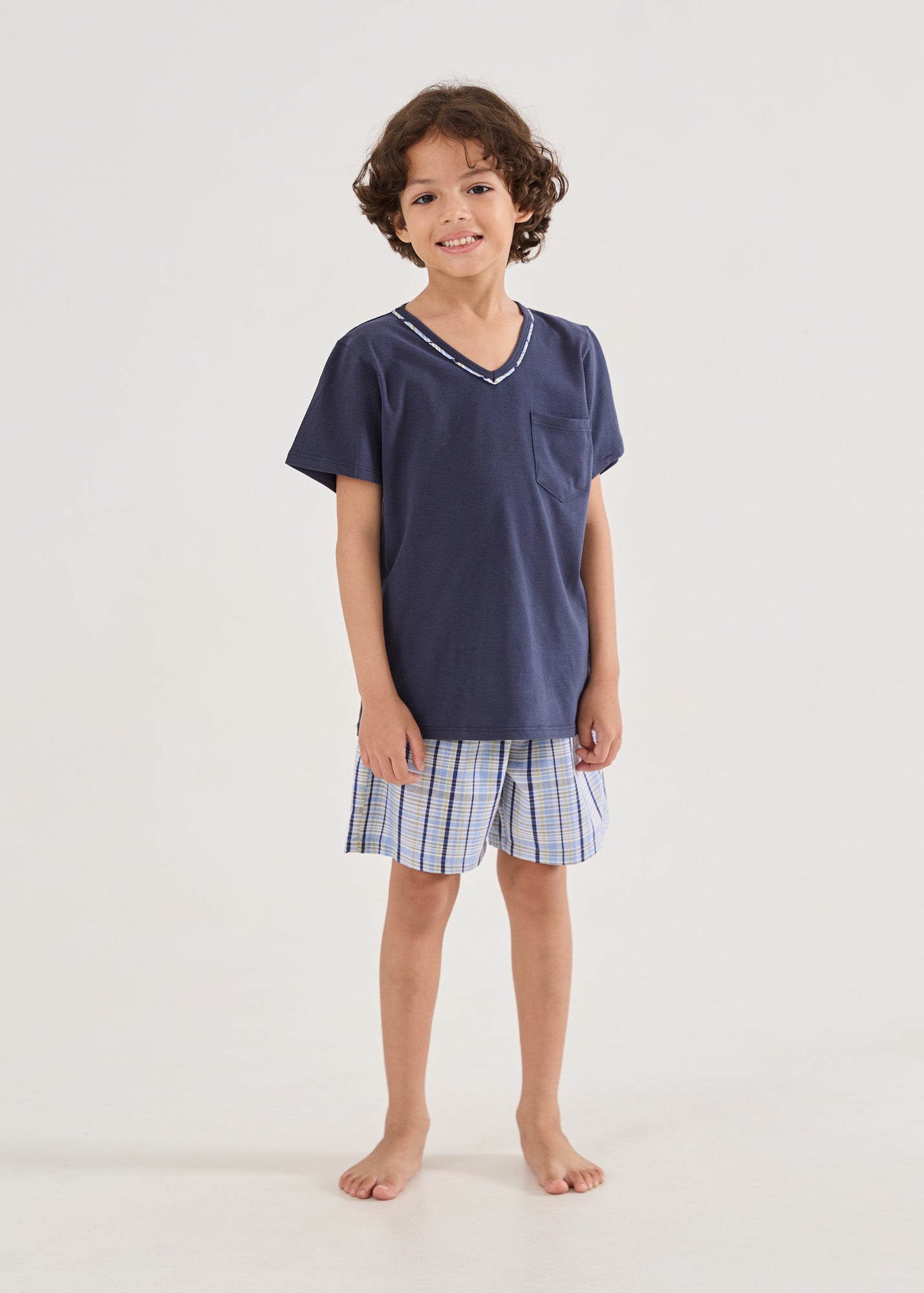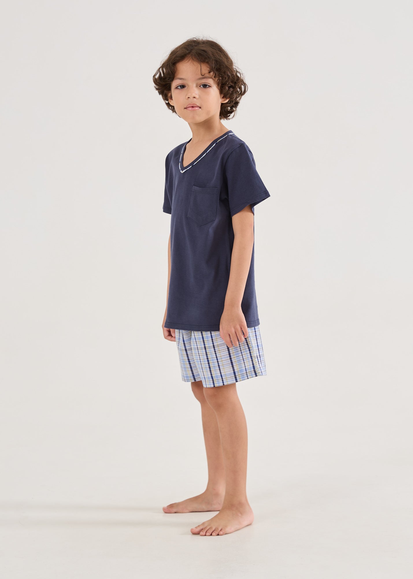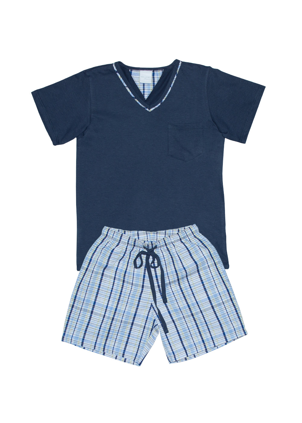 Pijama infantil masculino, bermuda em tecido xadrez 100% algodão, elástico na cintura, cadarço para ajustar. Blusa em malha de algodão premium na cor azul marinho,  gola V, com detalhe do xadrez na gola..