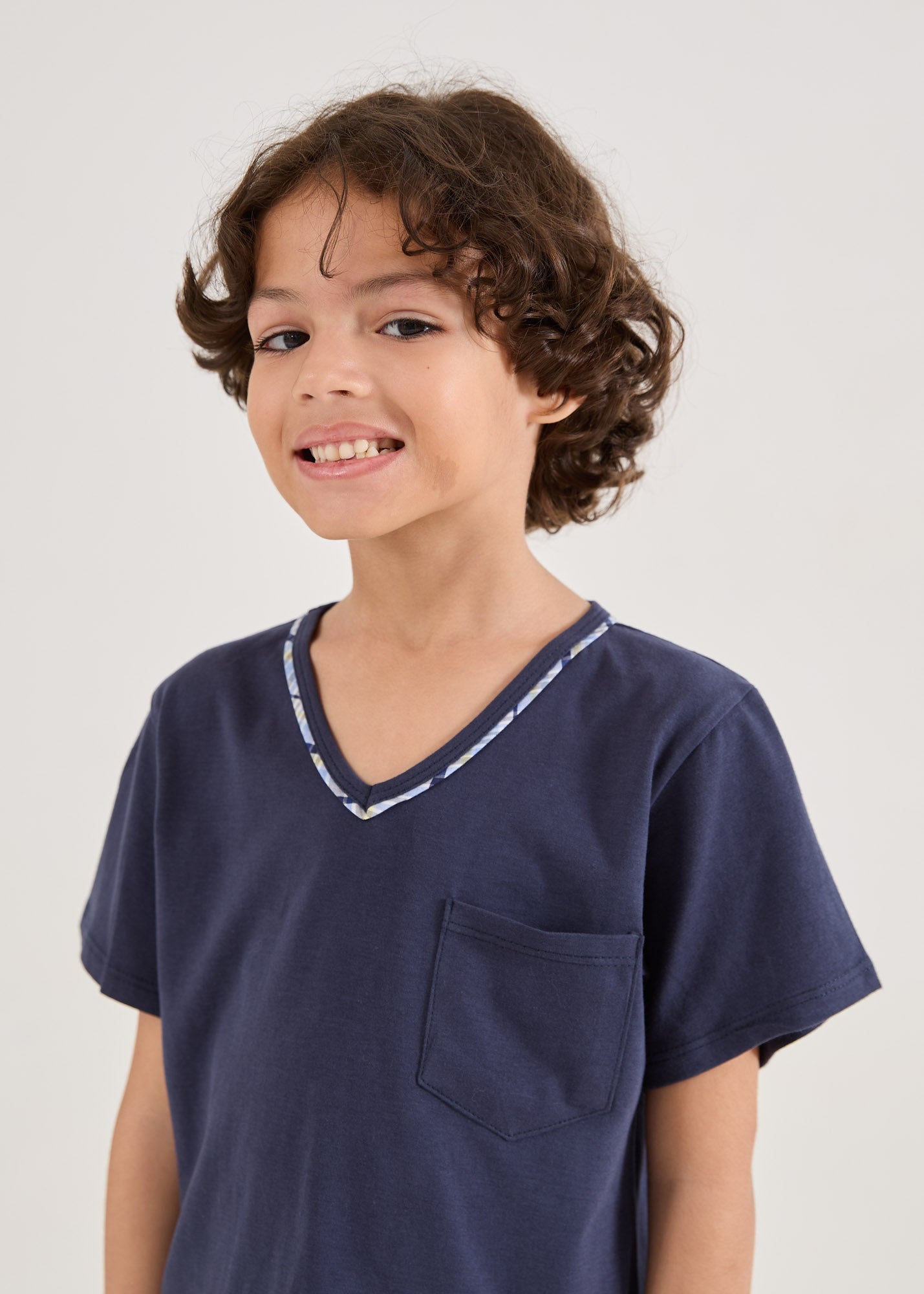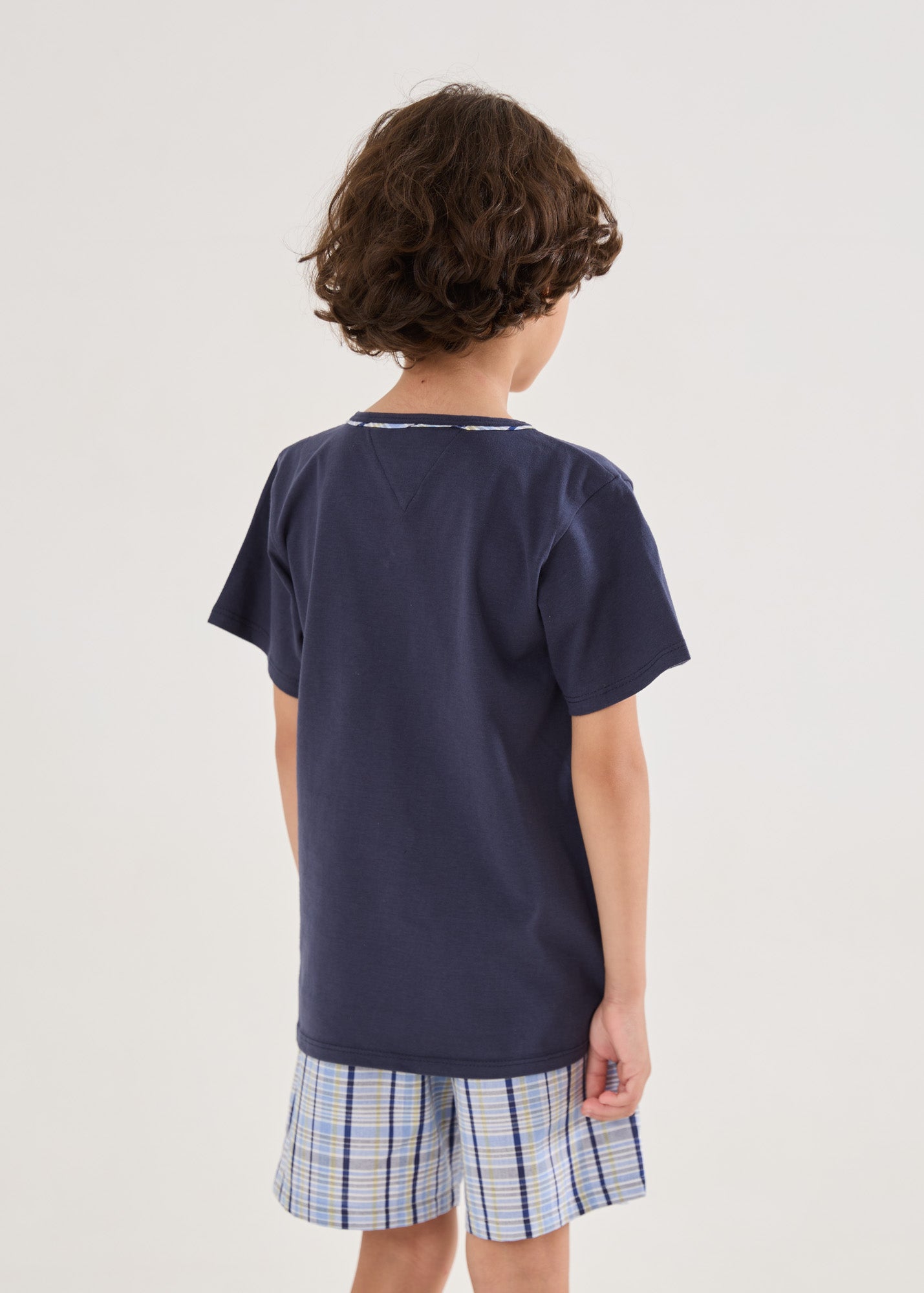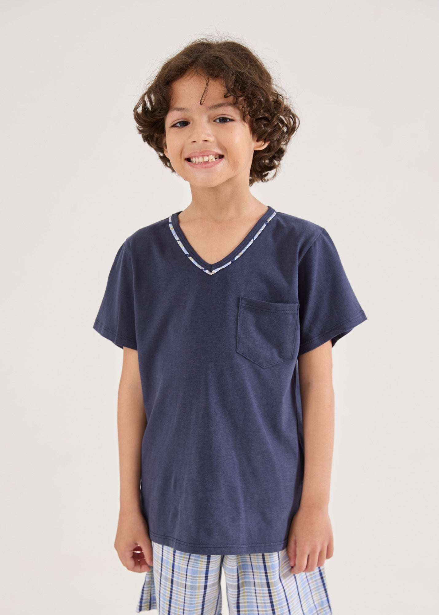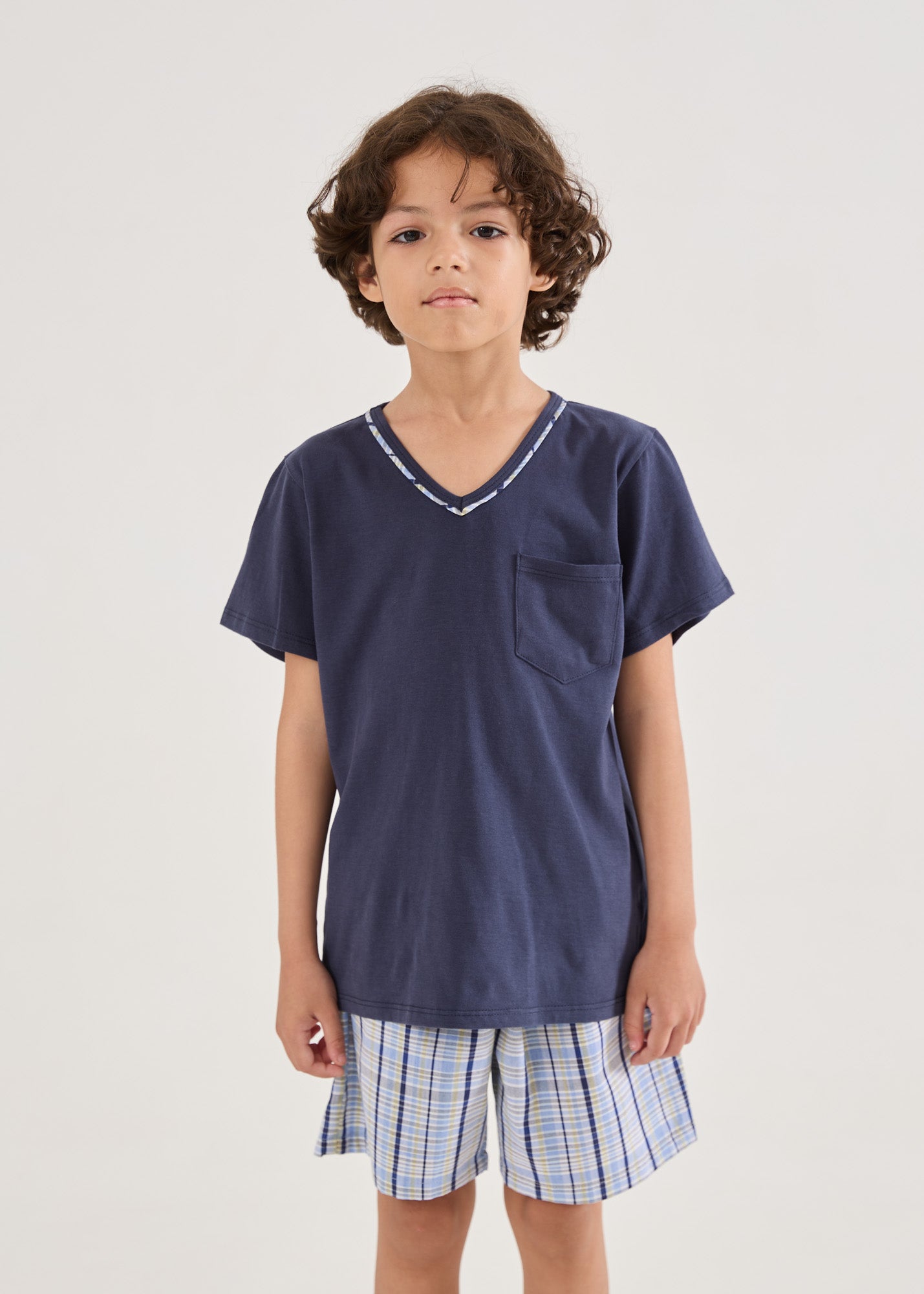Pijama infantil masculino, bermuda em tecido xadrez 100% algodão, elástico na cintura, cadarço para ajustar. Blusa em malha de algodão premium na cor azul marinho,  gola V, com detalhe do xadrez na gola..