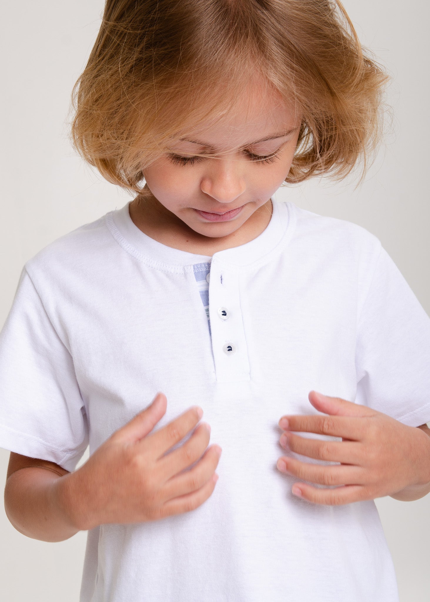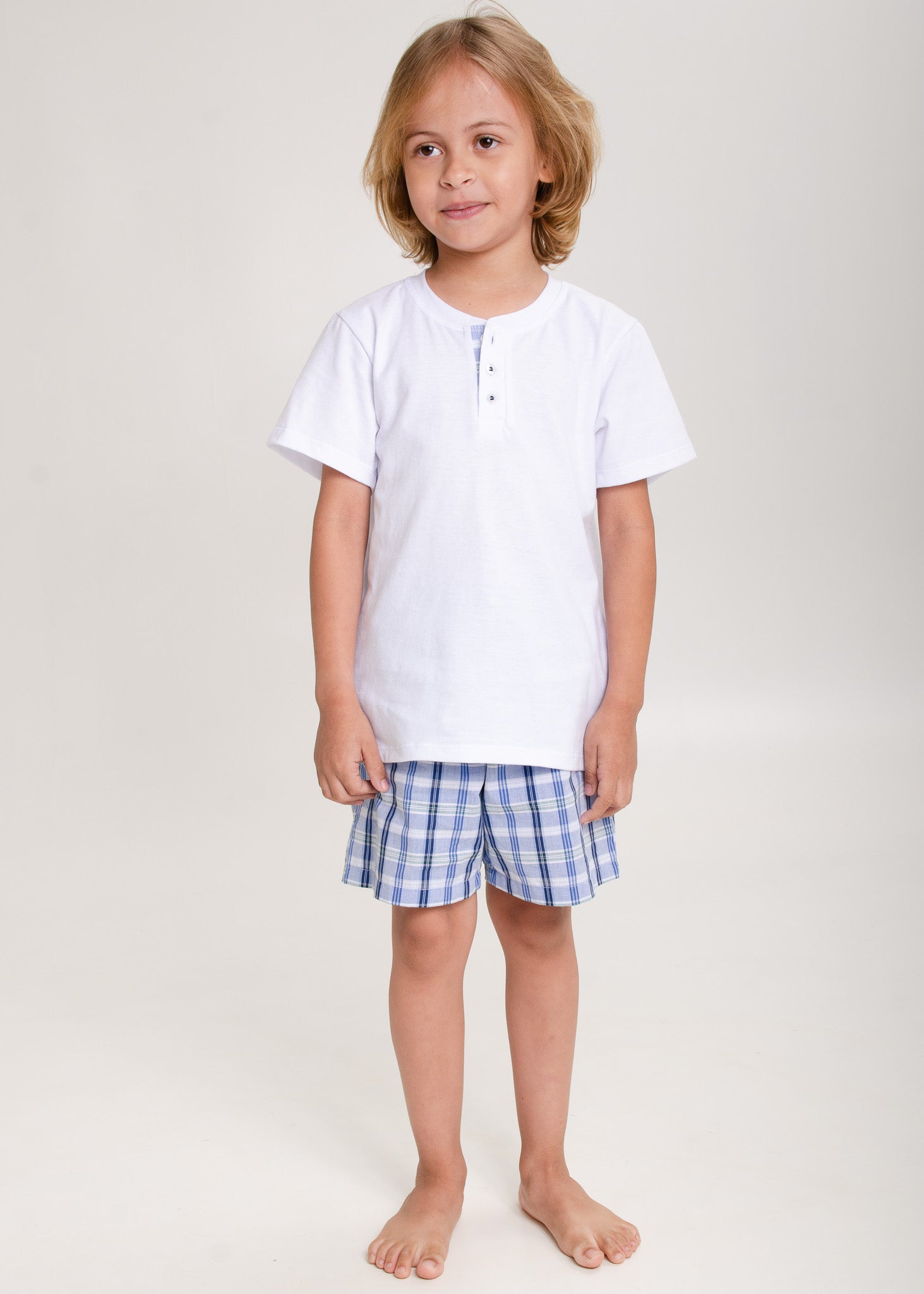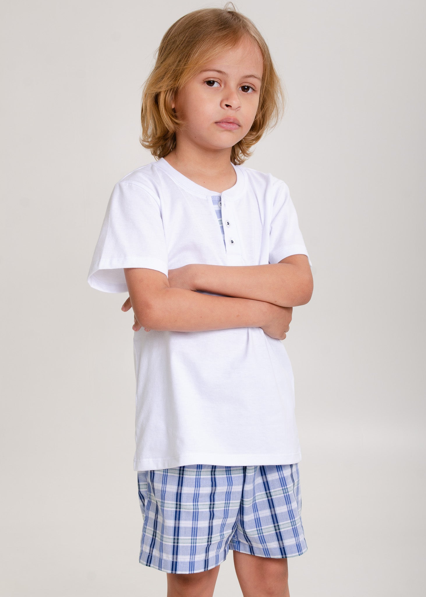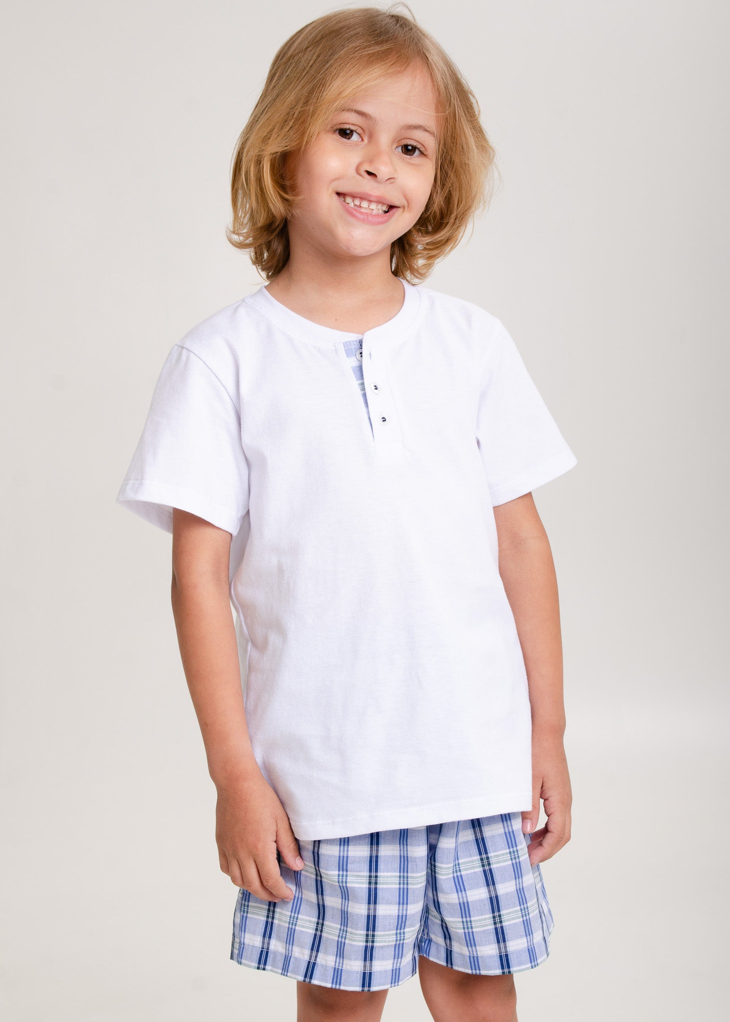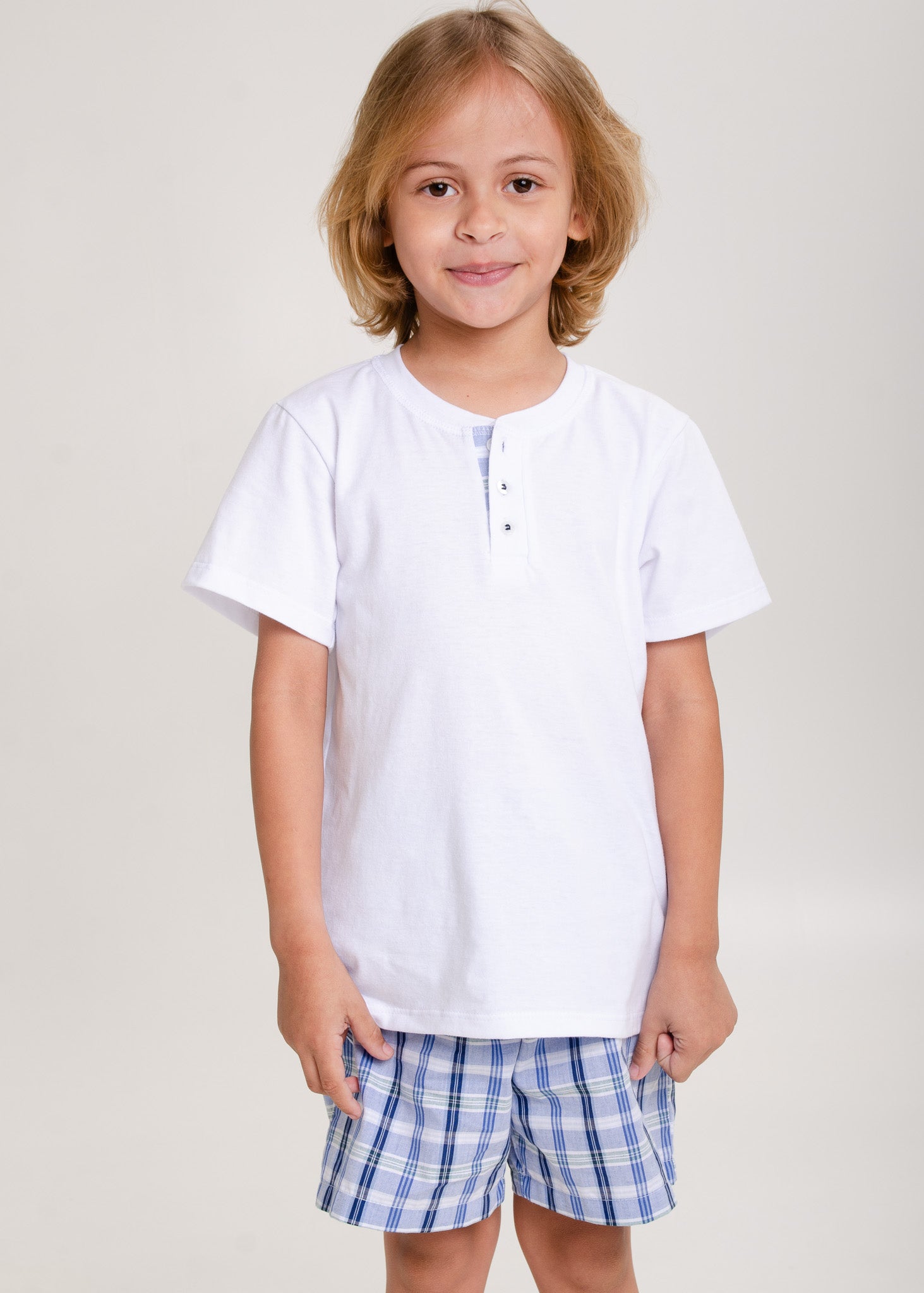 Pijama masculino infantil, modelo bermuda em tecido 100% algodão com padronagem xadrez em tons de azul, elástico na cintura e blusa em malha 100% algodão, mangas curtas e decote polo com botões e detalhe xadrez.