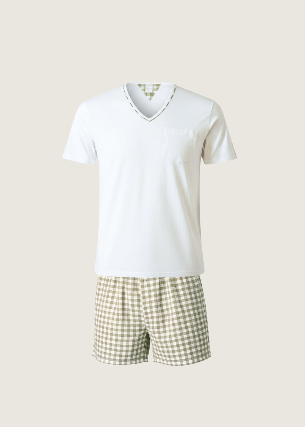 Pijama infantil masculino, bermuda em tecido xadrez 100% algodão, elástico na cintura e blusa em malha de algodão premium na cor branca, gola V, com detalhe do xadrez na gola.
