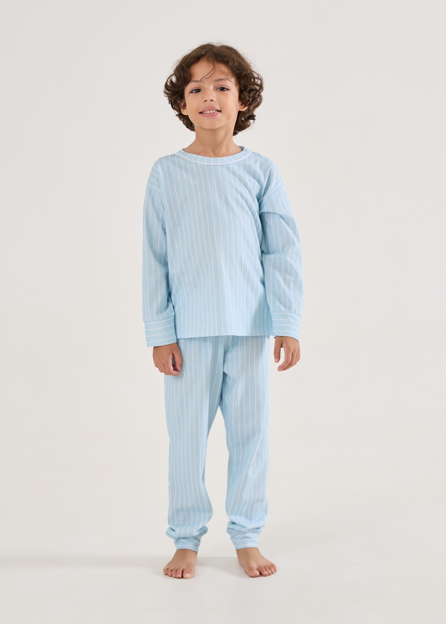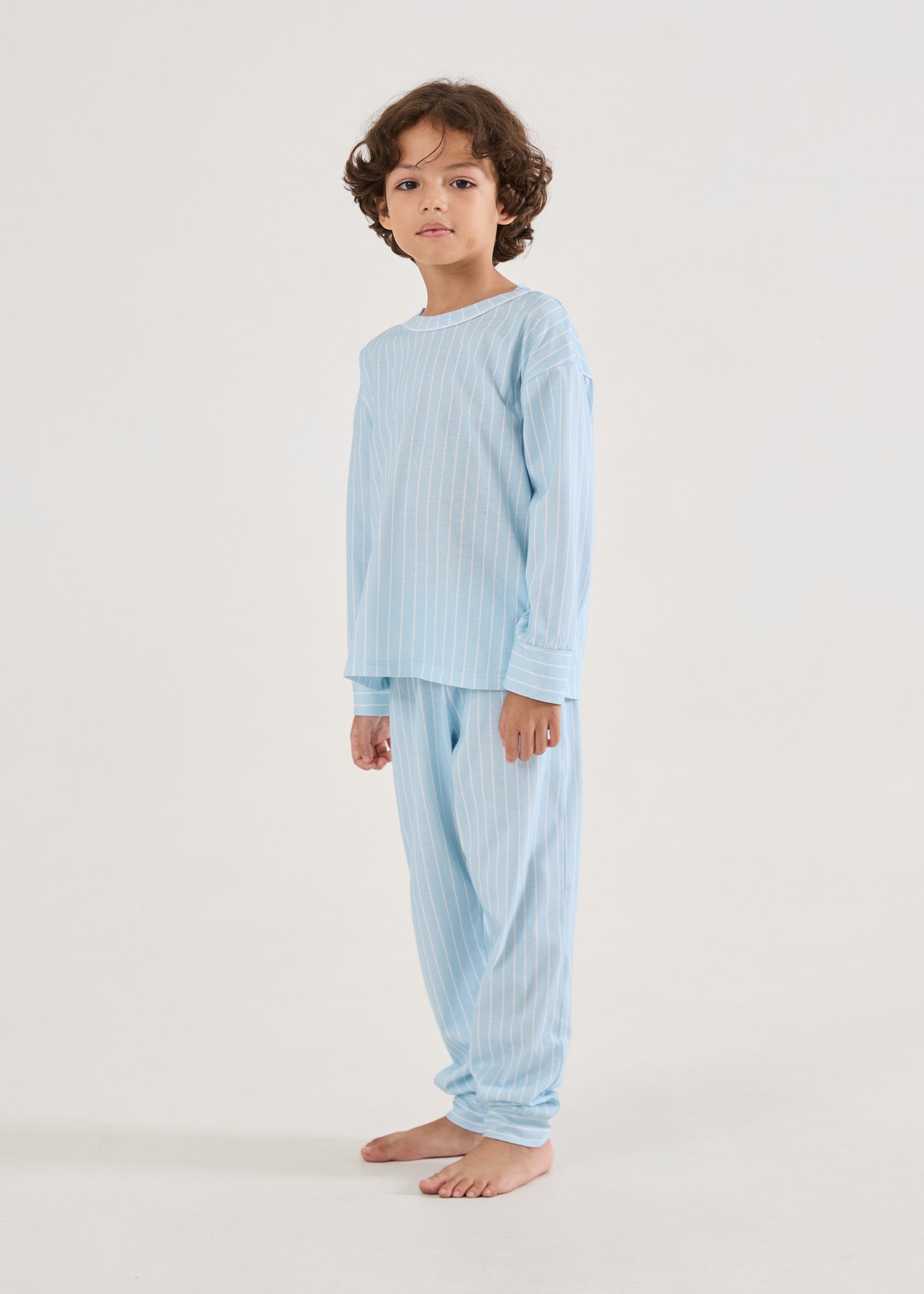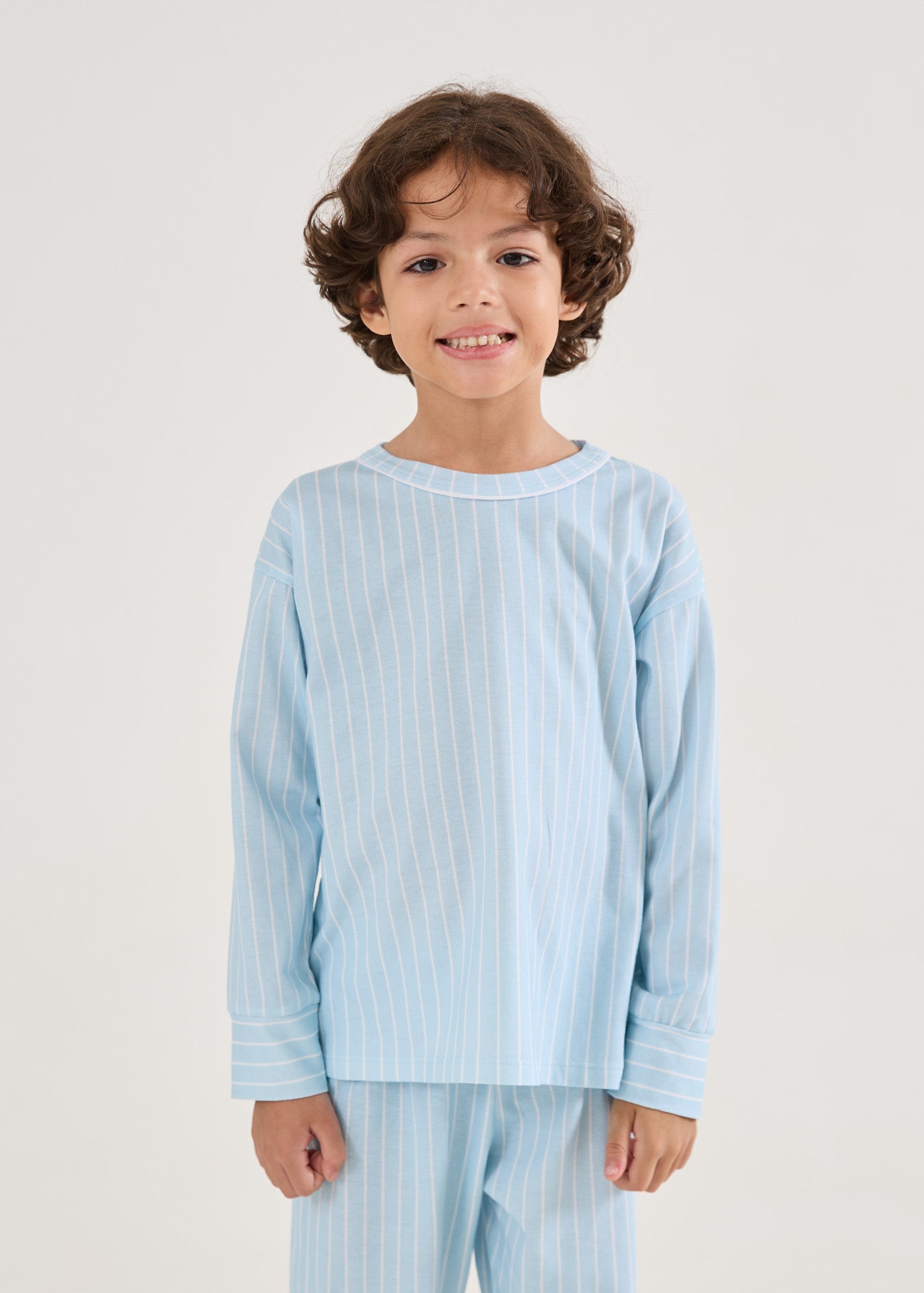 Pijama longo infantil, em malha ultrasoft 100% algodão, listrado em azul clarinho e branco. Pijama infantil modelo de calça com elástico na cintura, blusa mangas longas e gola redonda.