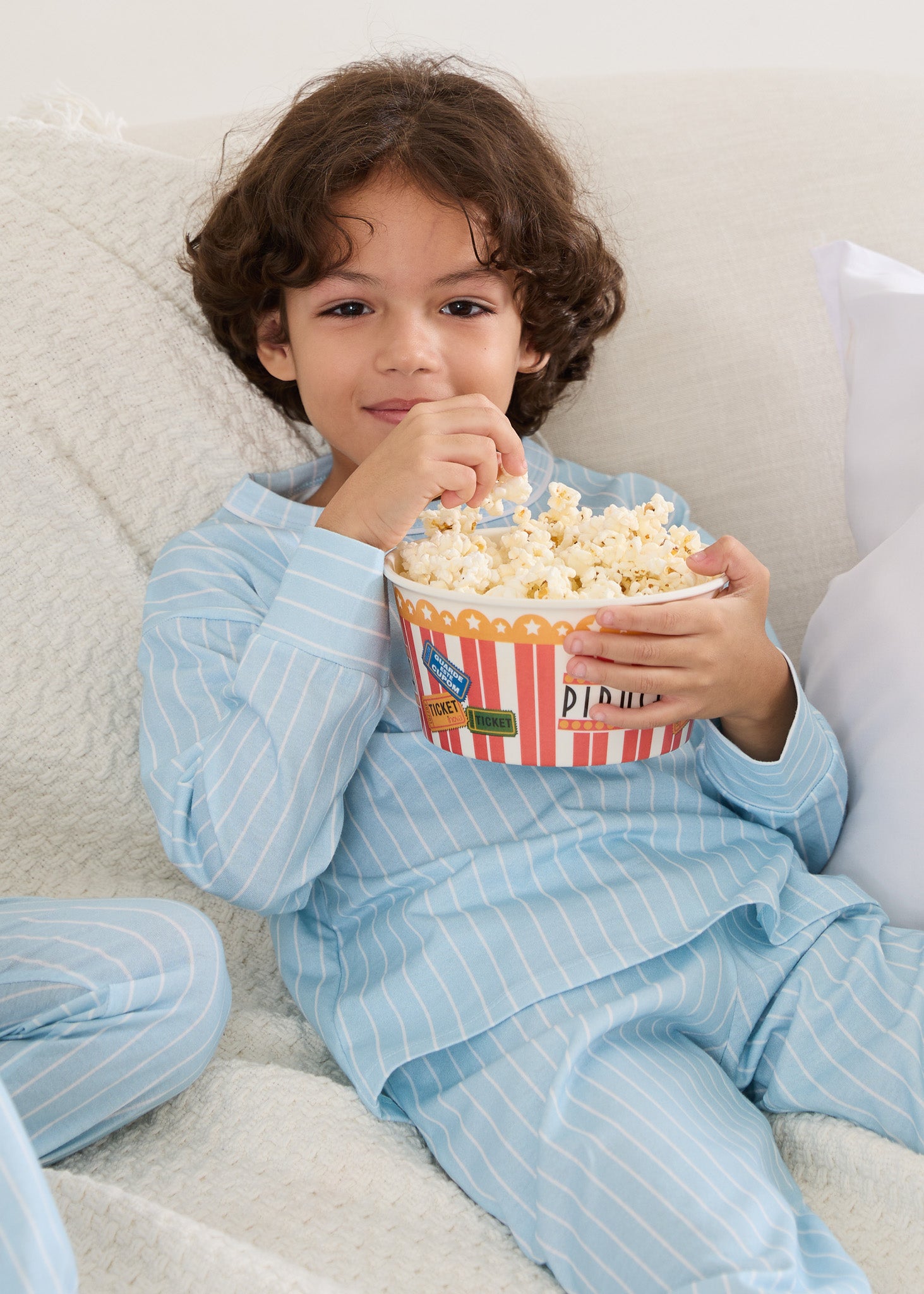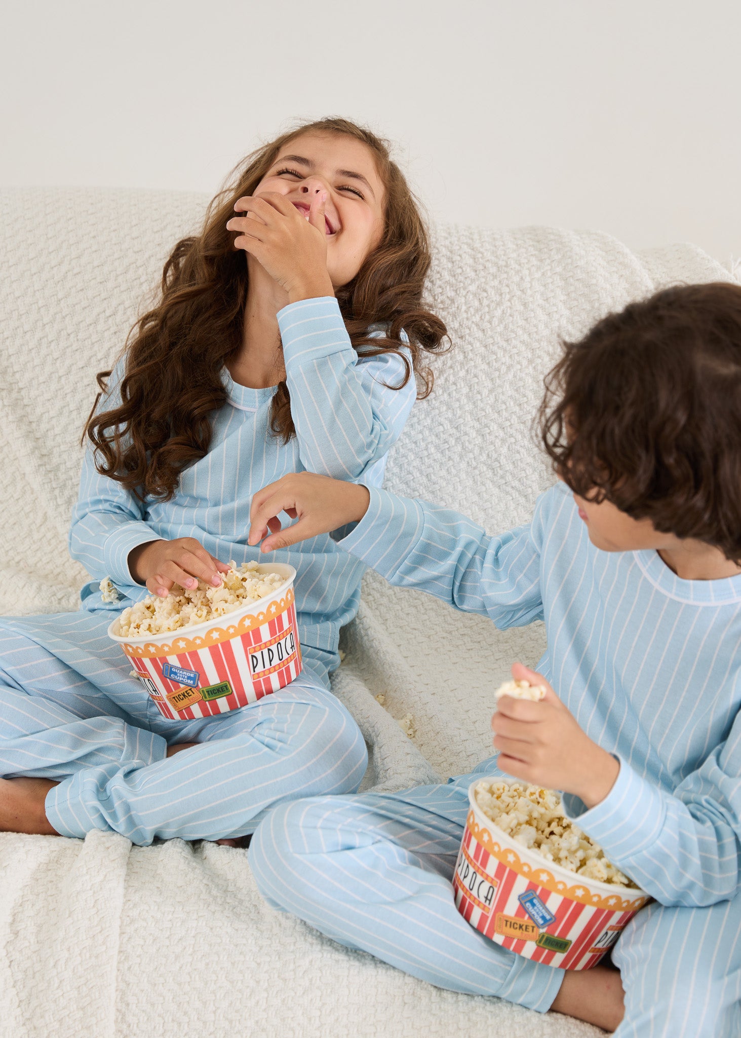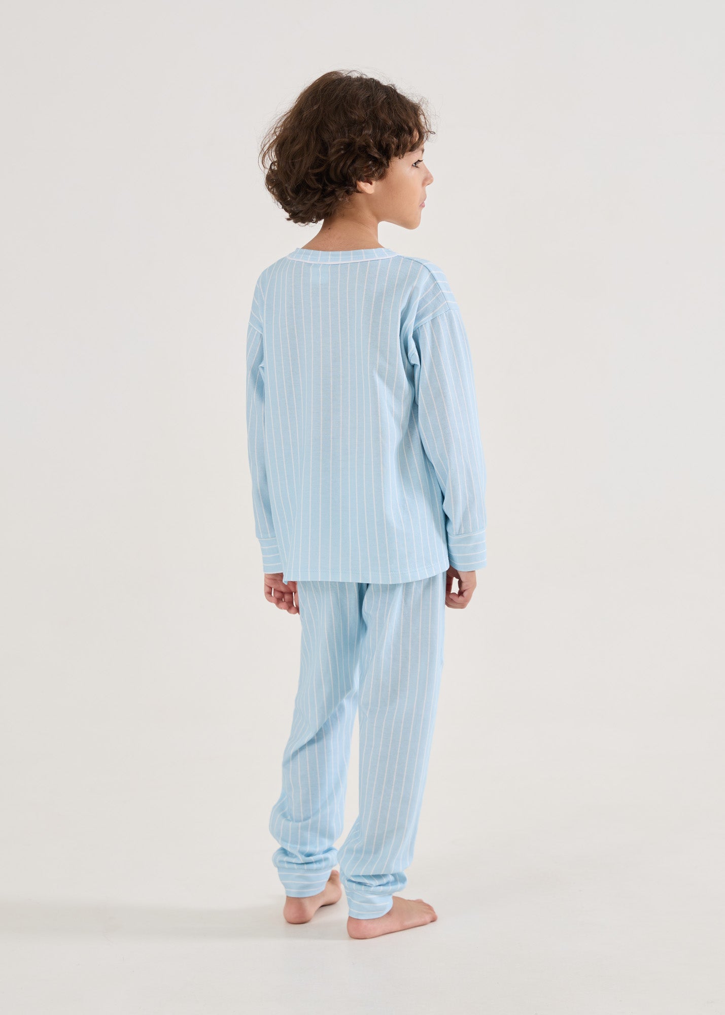 Pijama longo infantil, em malha ultrasoft 100% algodão, listrado em azul clarinho e branco. Pijama infantil modelo de calça com elástico na cintura, blusa mangas longas e gola redonda.
