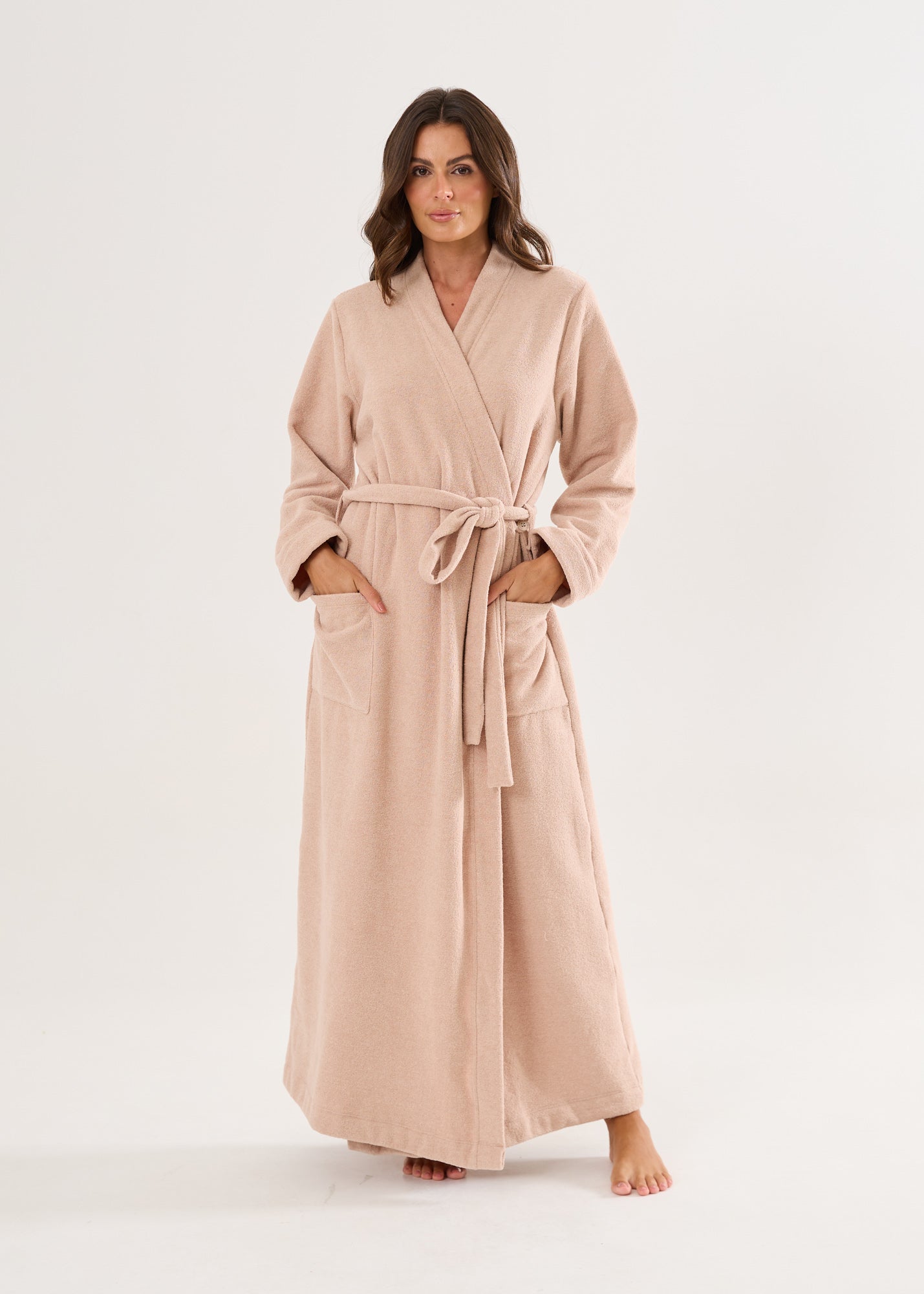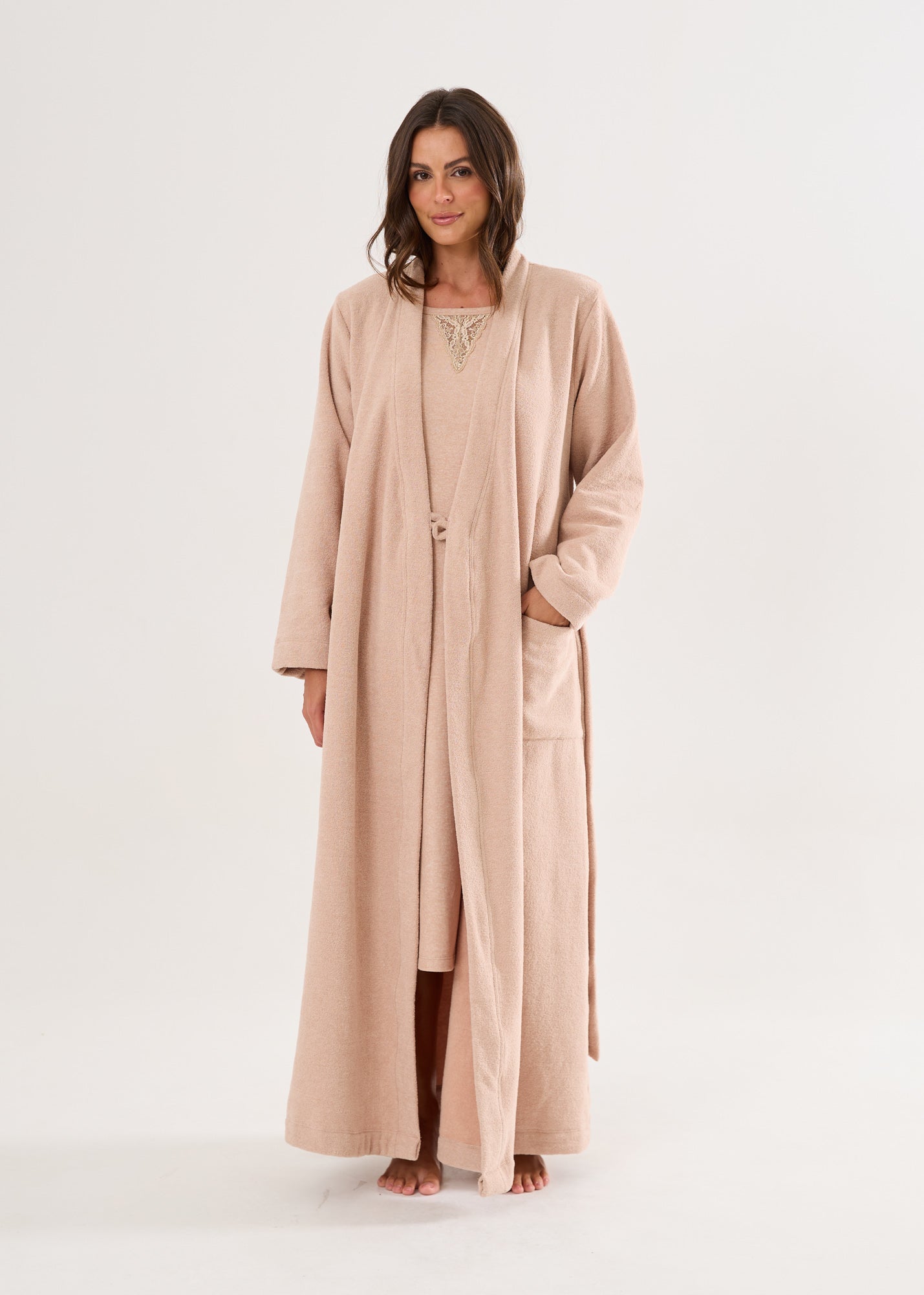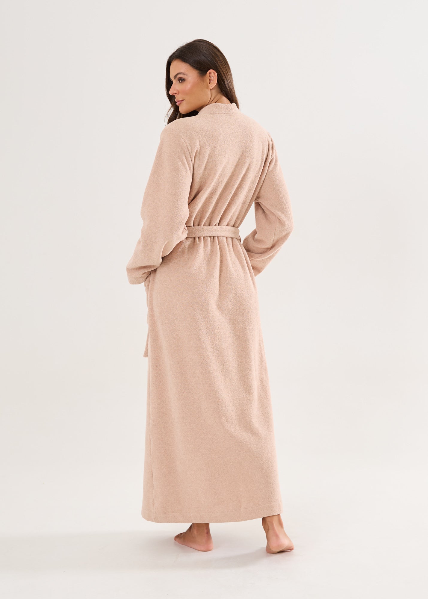 Robe longo, com mangas longas, bolsos laterais, faixa para ajuste na cintura. O toque dessa peça é tão surpreendente que fica difícil colocar em palavras. Basta sentir! Disponível nas cores azul, avelã e rosa.