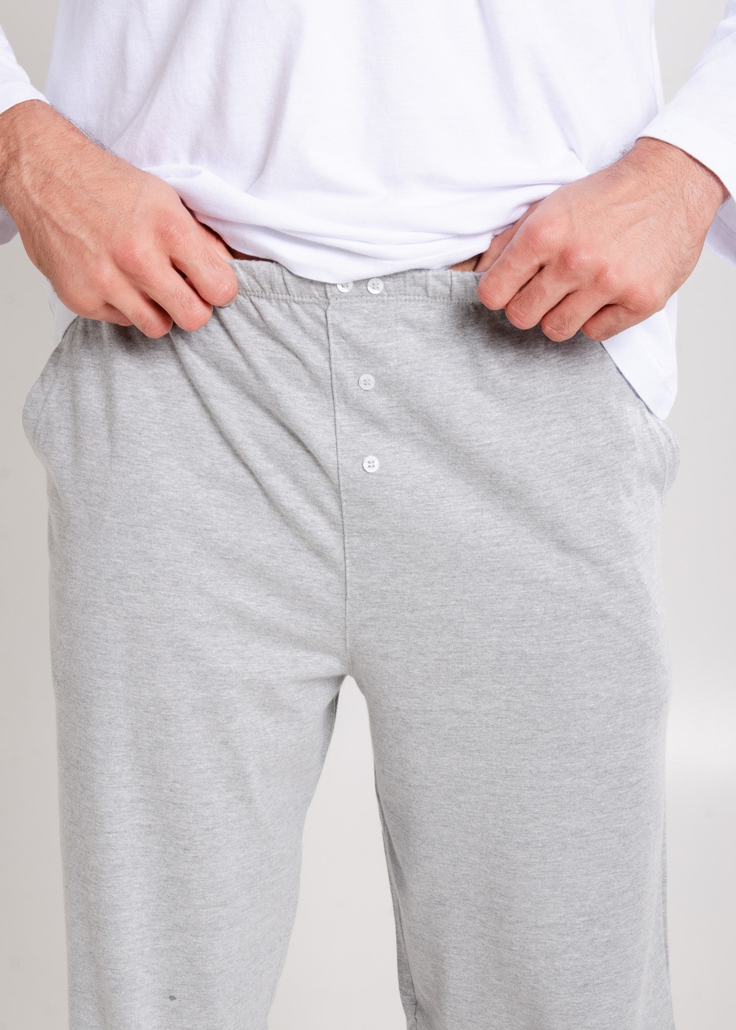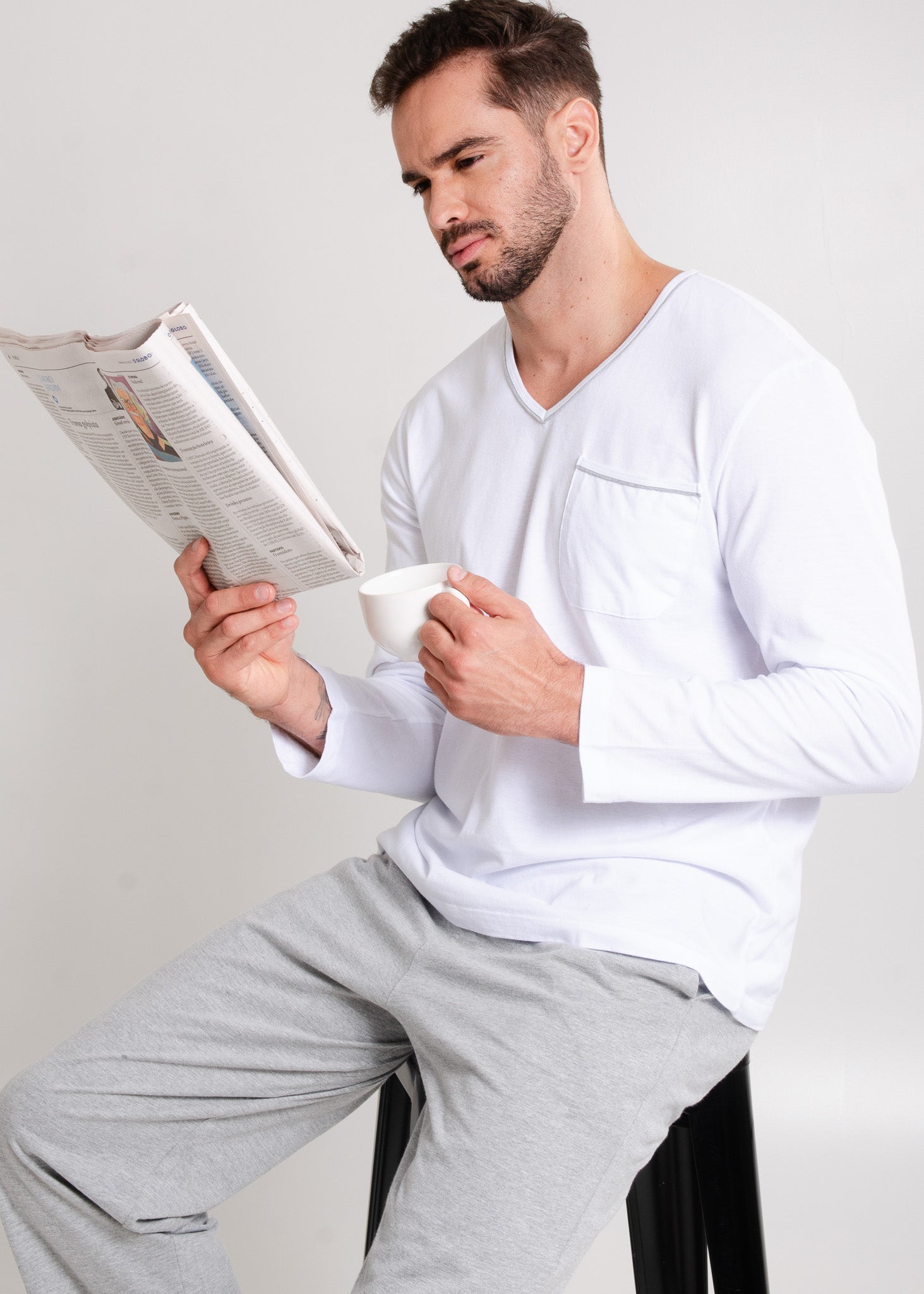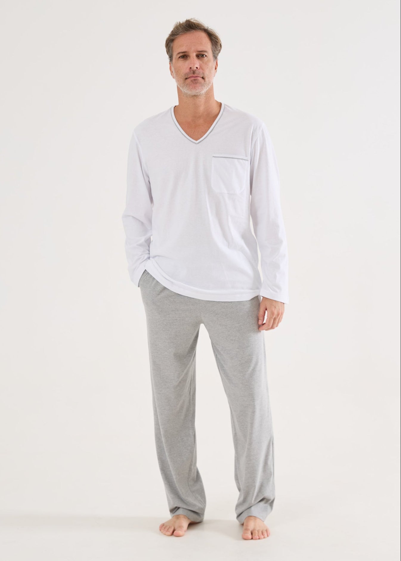 Pijama longo masculino com o conforto e maciez no toque da Malha Premium. Calça na cor mescla com acabamento de elástico no cós e bolsos laterais. Camiseta manga longa na cor branca, decote V, bolso lateral, acabamento em vivo na cor da calça na gola e bolso.
