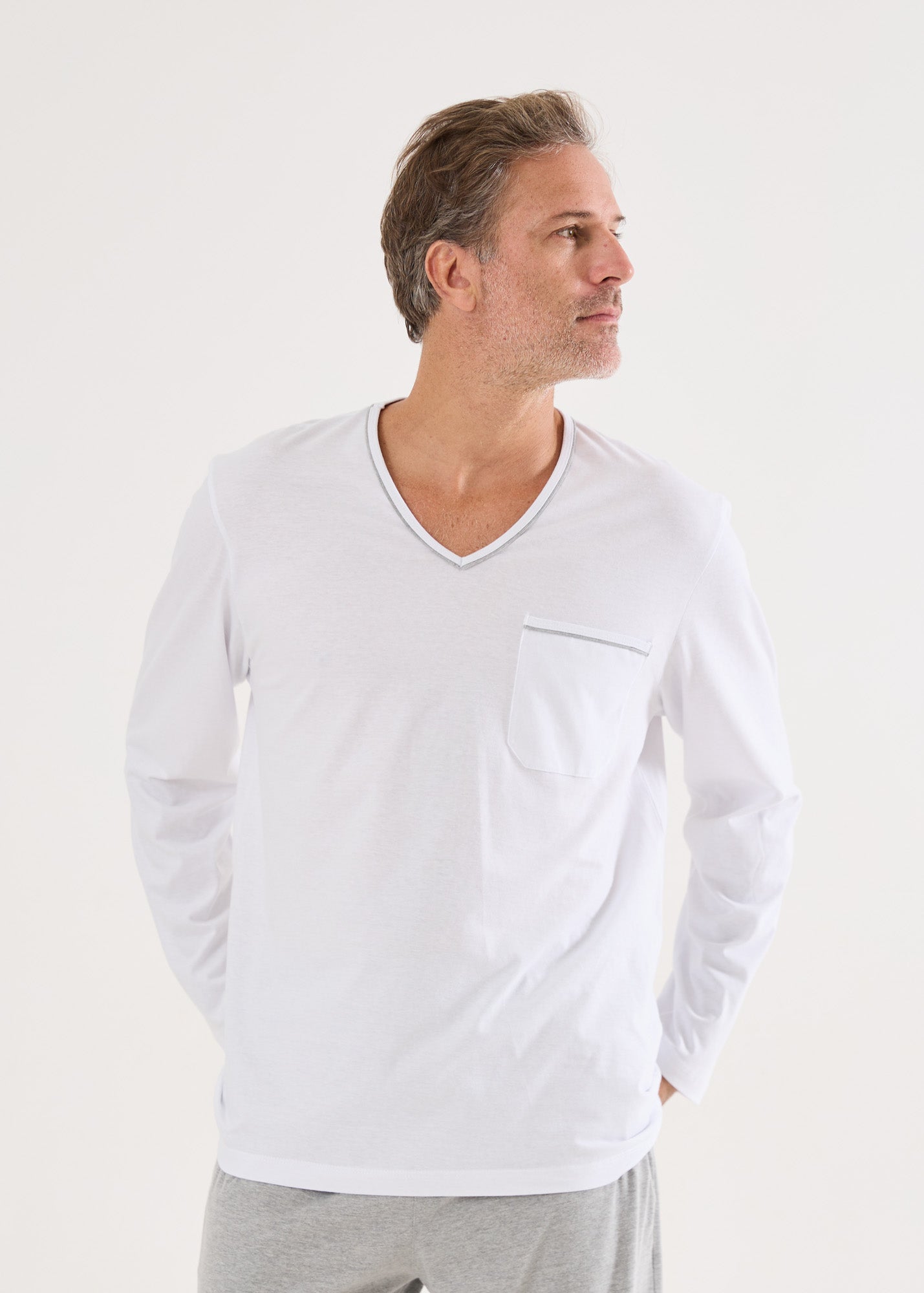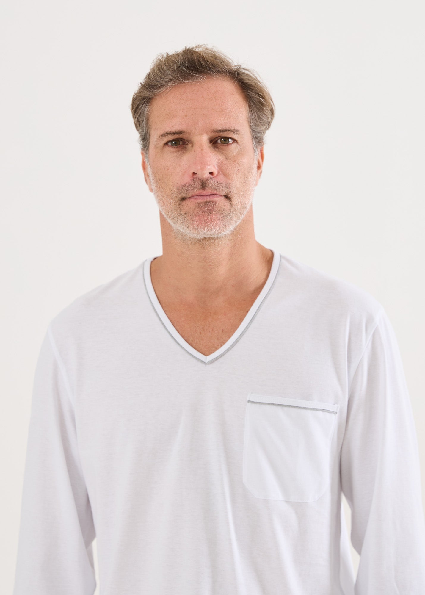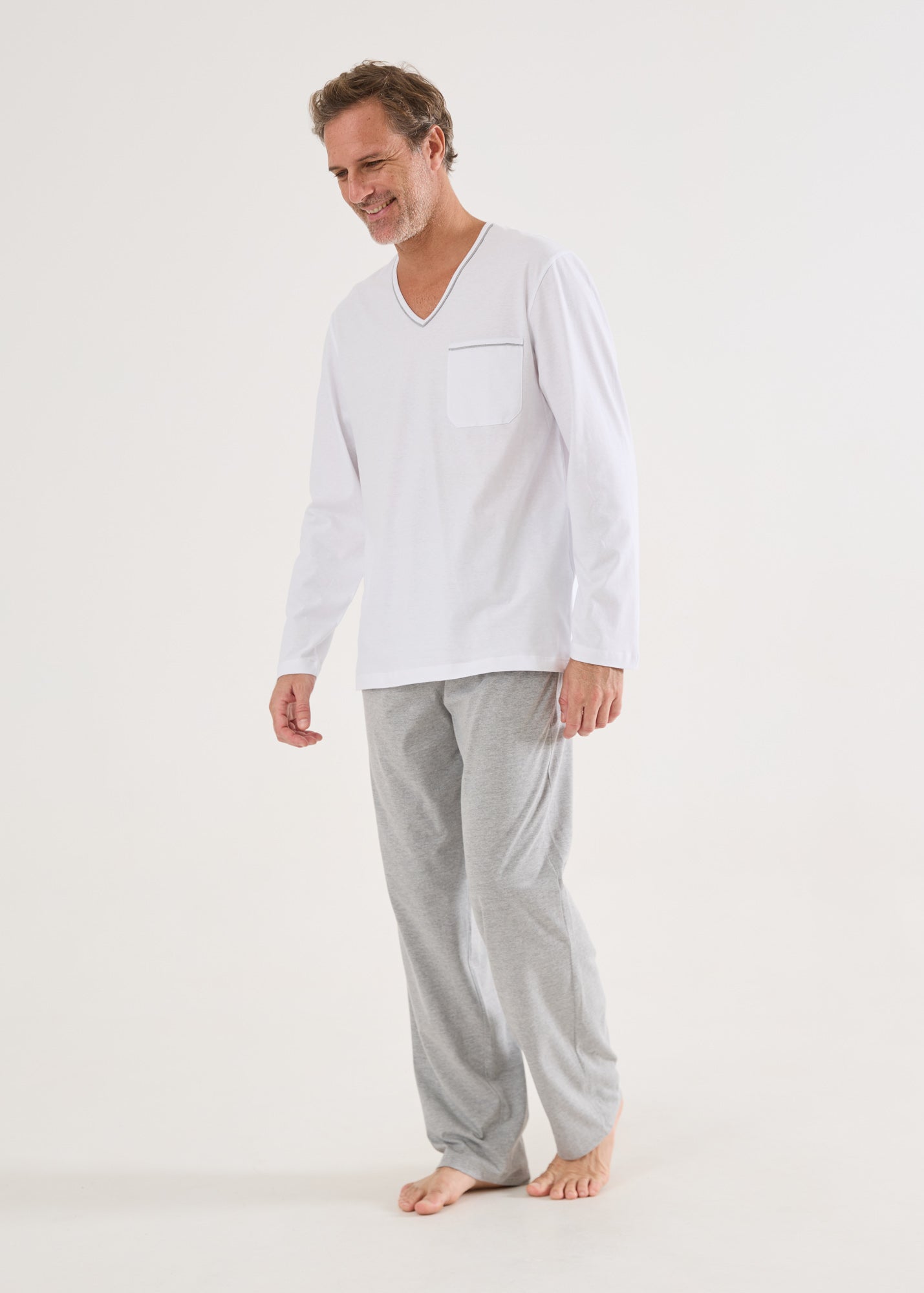 Pijama longo masculino com o conforto e maciez no toque da Malha Premium. Calça na cor mescla com acabamento de elástico no cós e bolsos laterais. Camiseta manga longa na cor branca, decote V, bolso lateral, acabamento em vivo na cor da calça na gola e bolso.