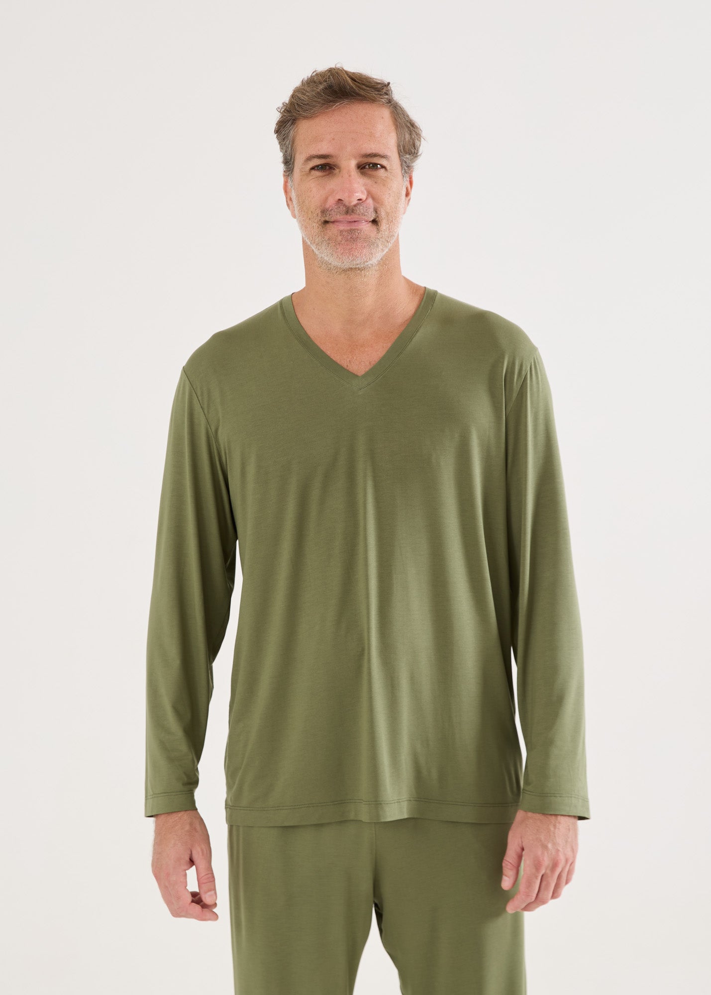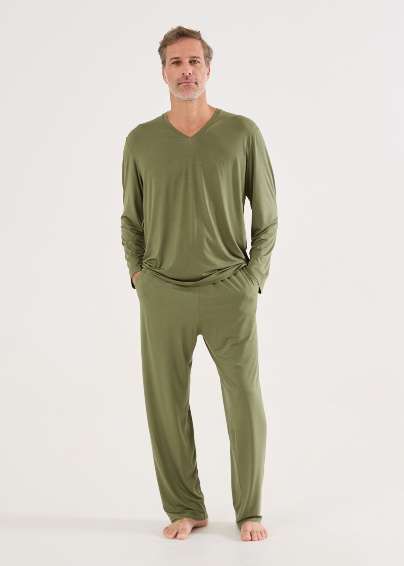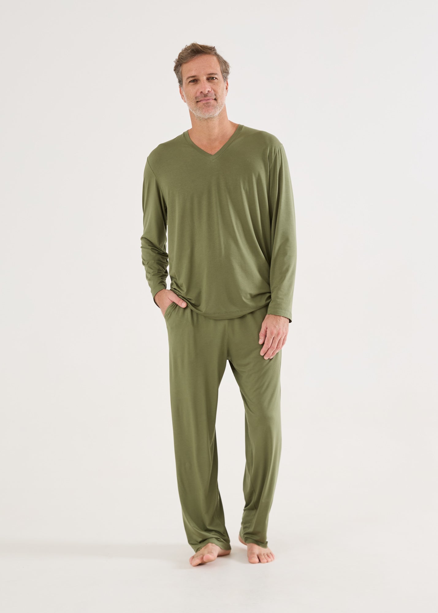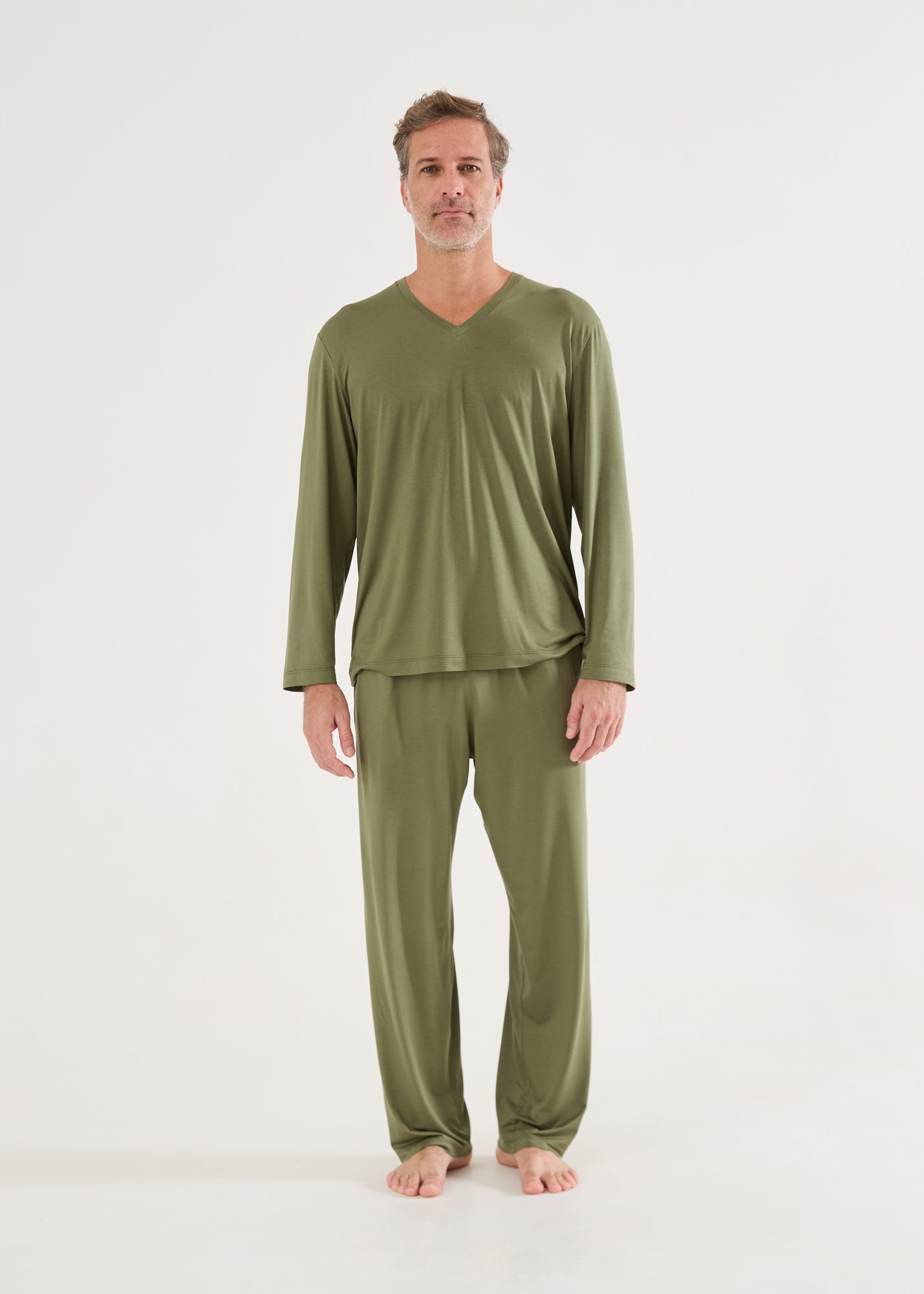 Pijama masculino modelo longo, em malha modal. Calça com bolsos laterais e elástico na cintura. Blusa com gola V e mangas longas. Disponível nas cores marinho e matcha.