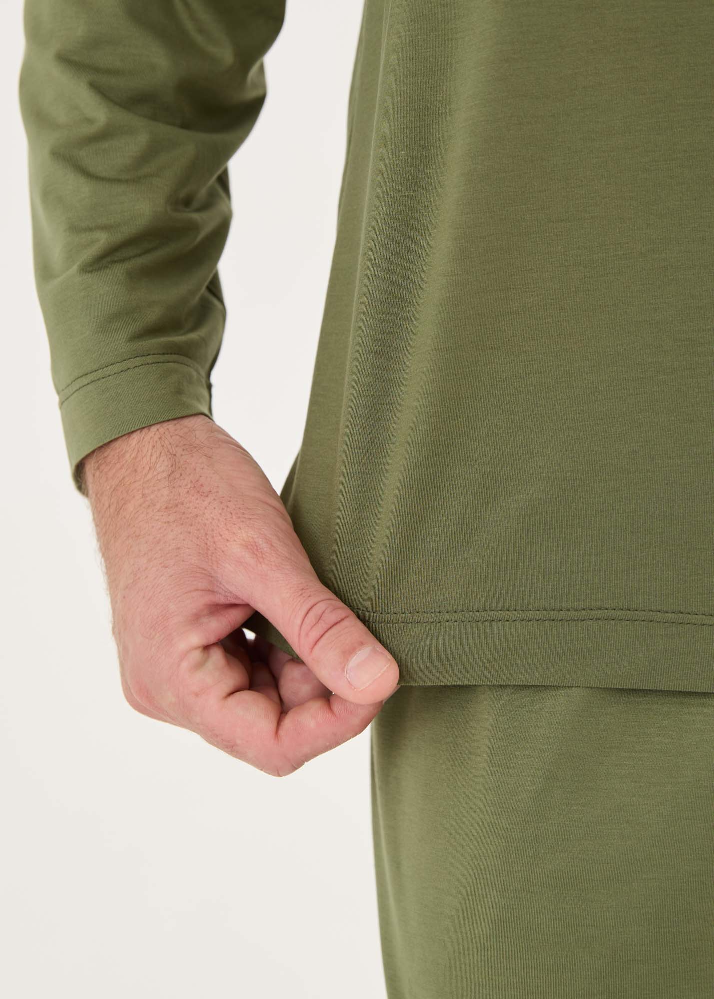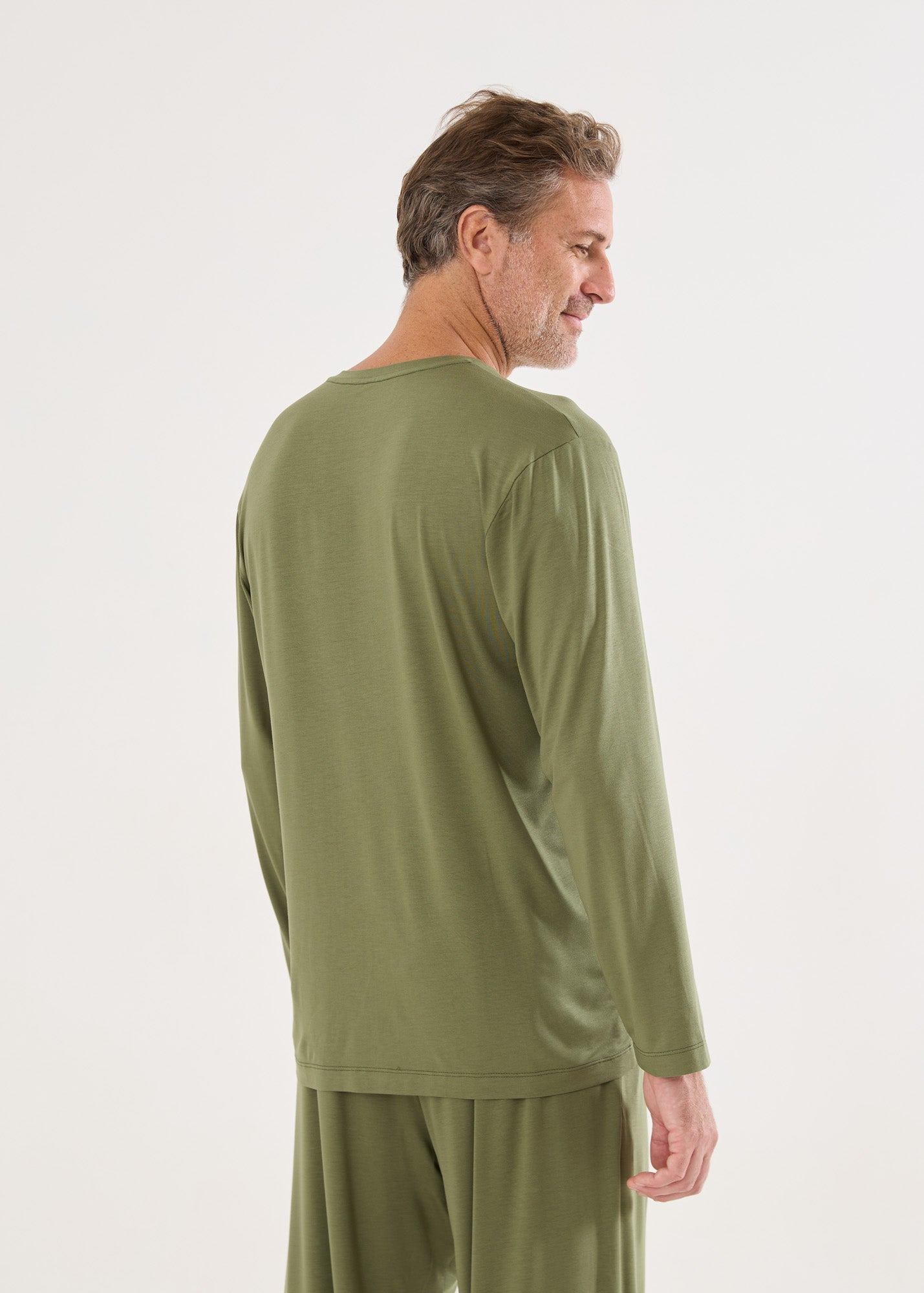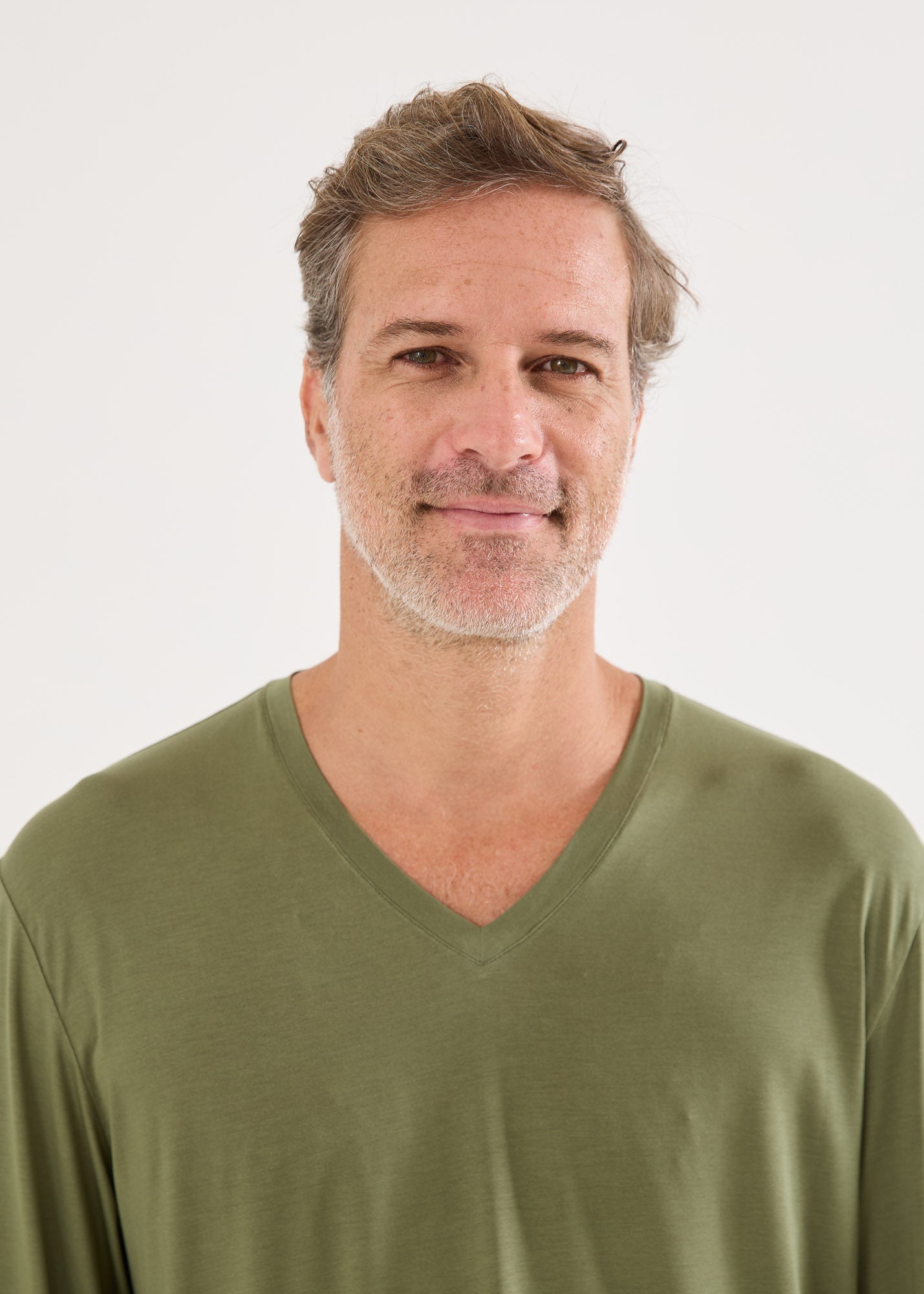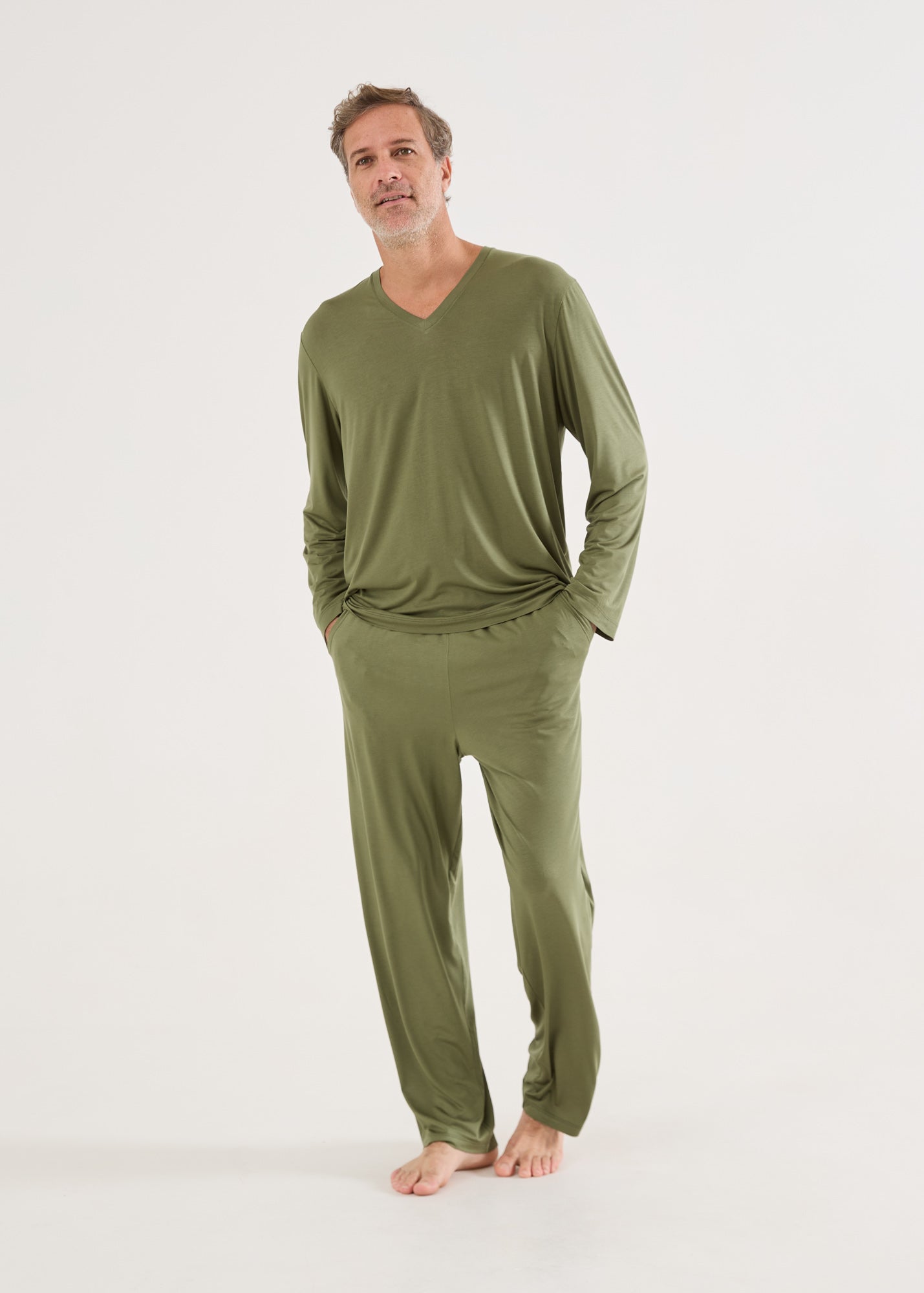 Pijama masculino modelo longo, em malha modal. Calça com bolsos laterais e elástico na cintura. Blusa com gola V e mangas longas. Disponível nas cores marinho e matcha.