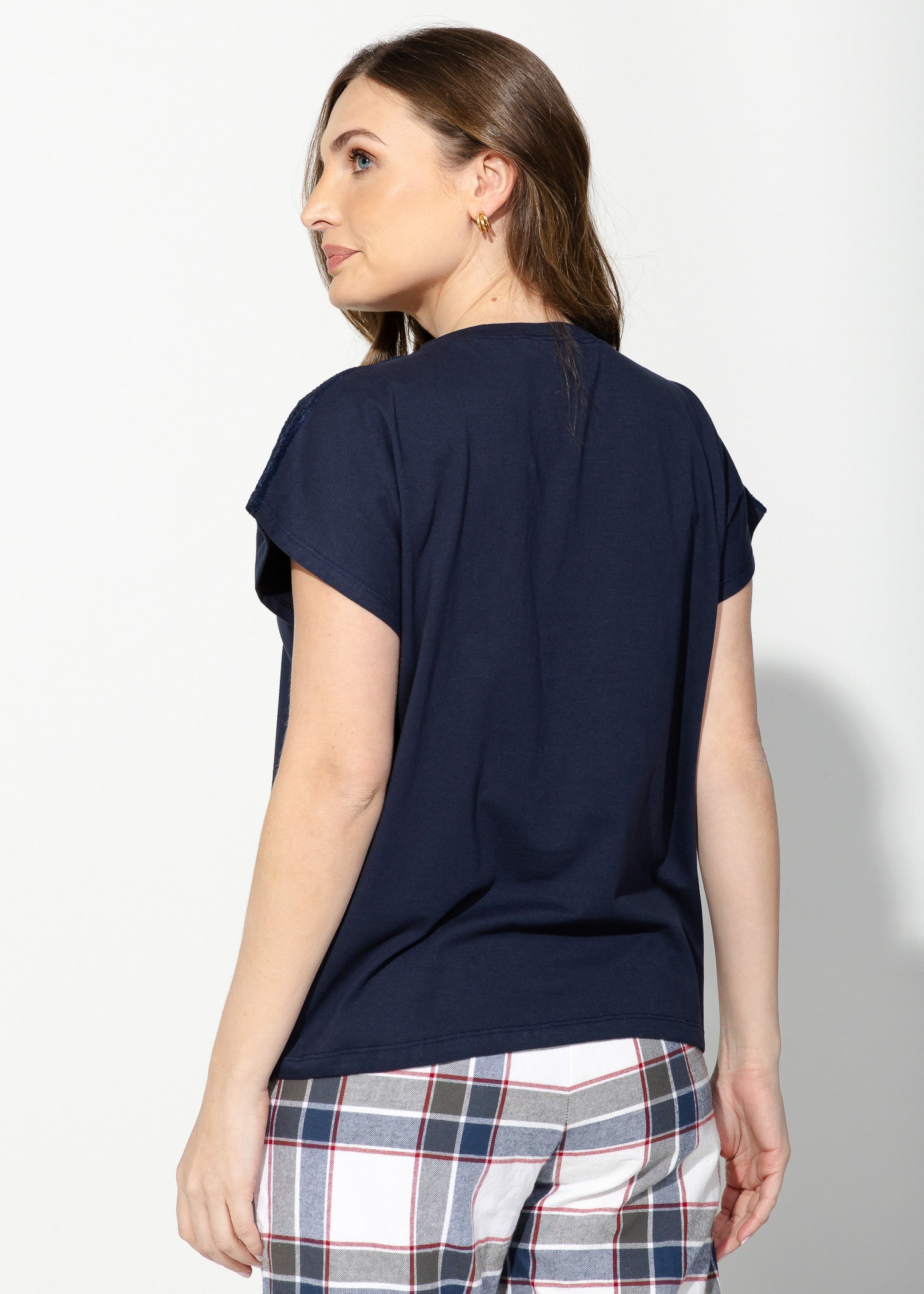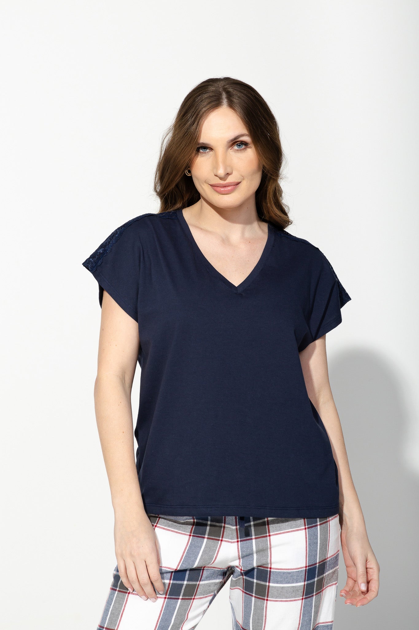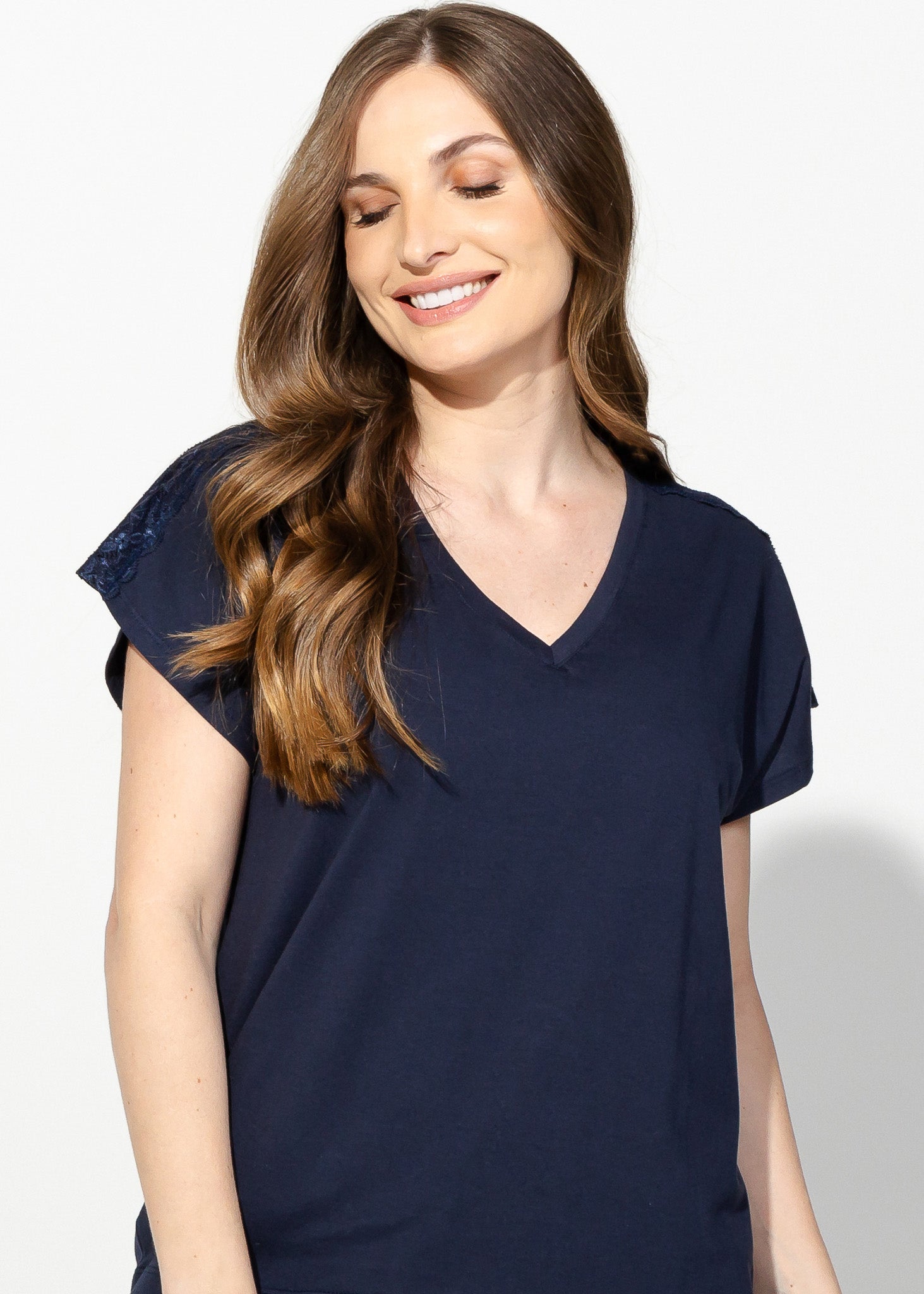 Blusa feminina com modelagem soltinha, gola V, mangas japonesas e um lindo detalhe em renda nos ombros. Muito versátil, essa blusa é a basiquinha com bossa. É uma peça avulsa e você pode combinar com seus pijamas e montar vários looks!