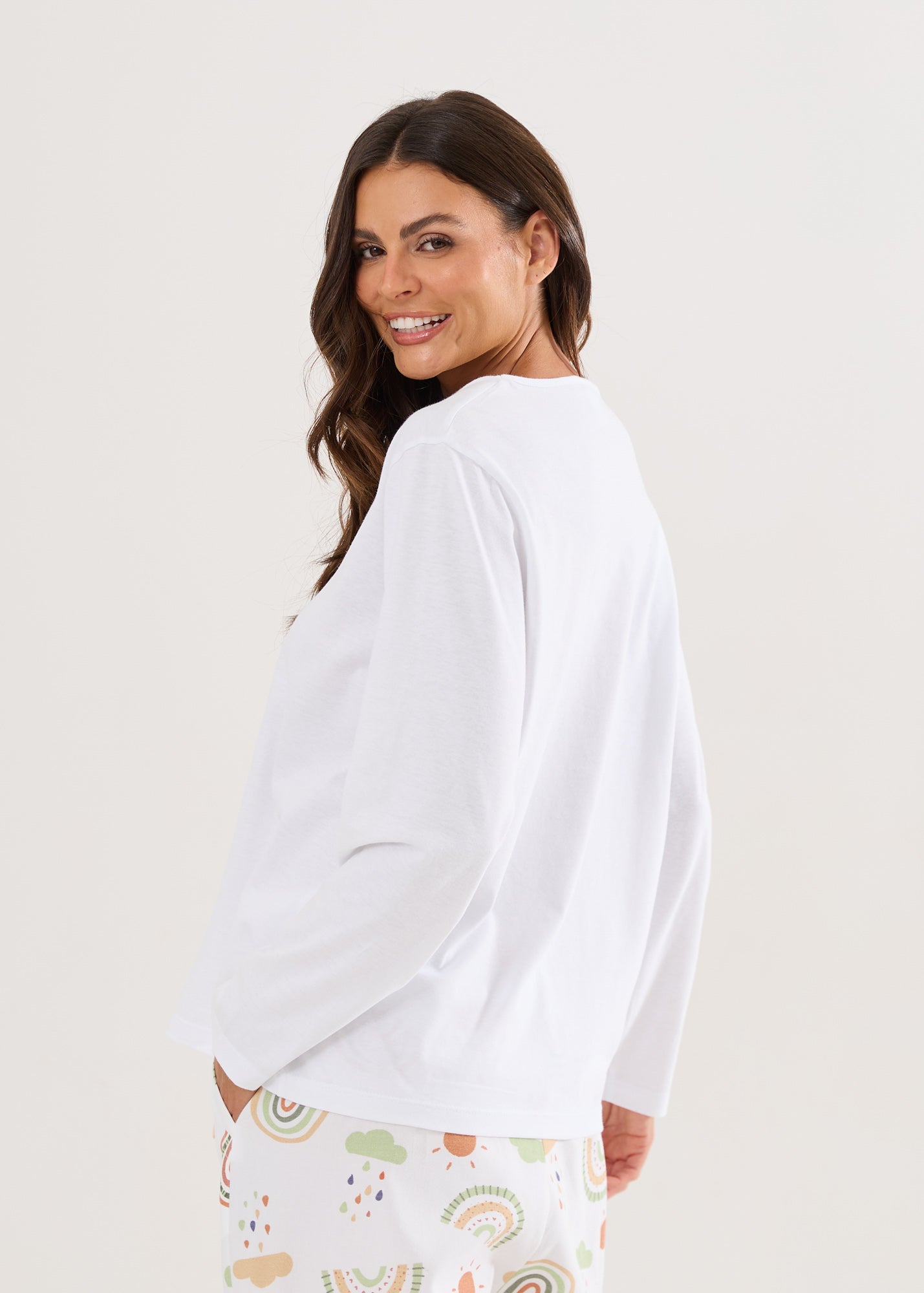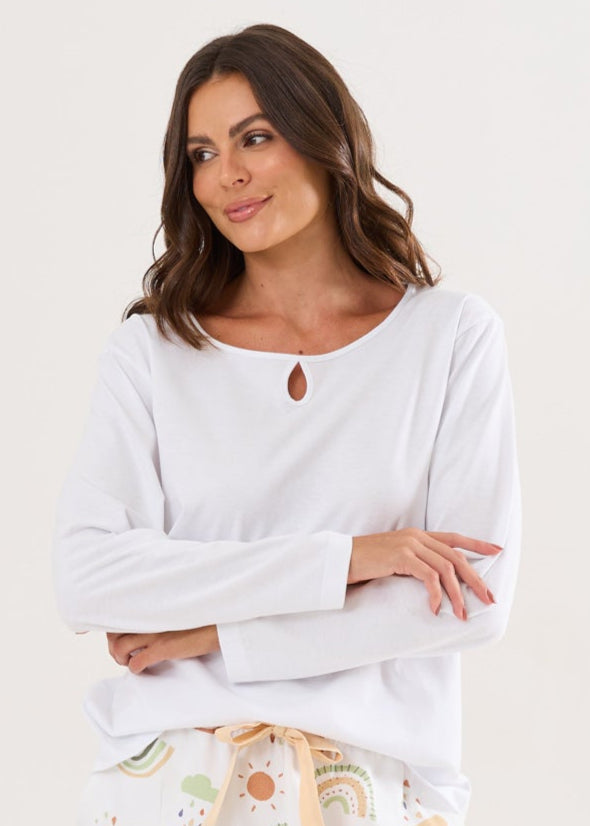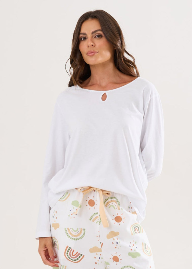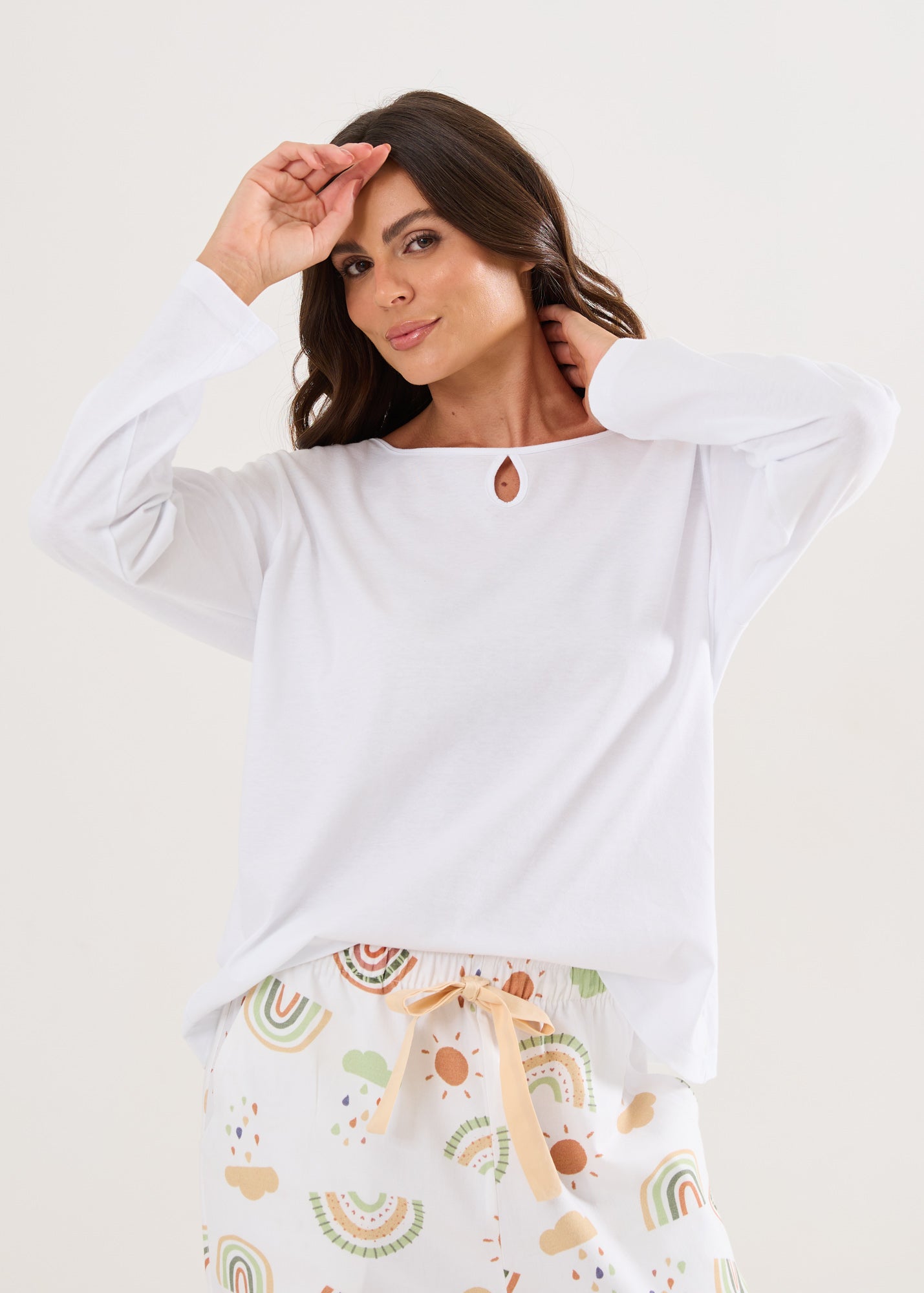 Blusa feminina com mangas longas, decote redondo e detalhe gota no decote. Muito versátil, essa é uma peça avulsa e você pode combinar com seus pijamas e montar vários looks!